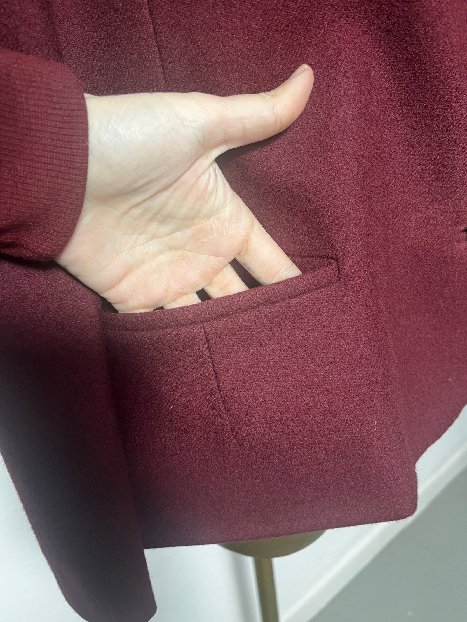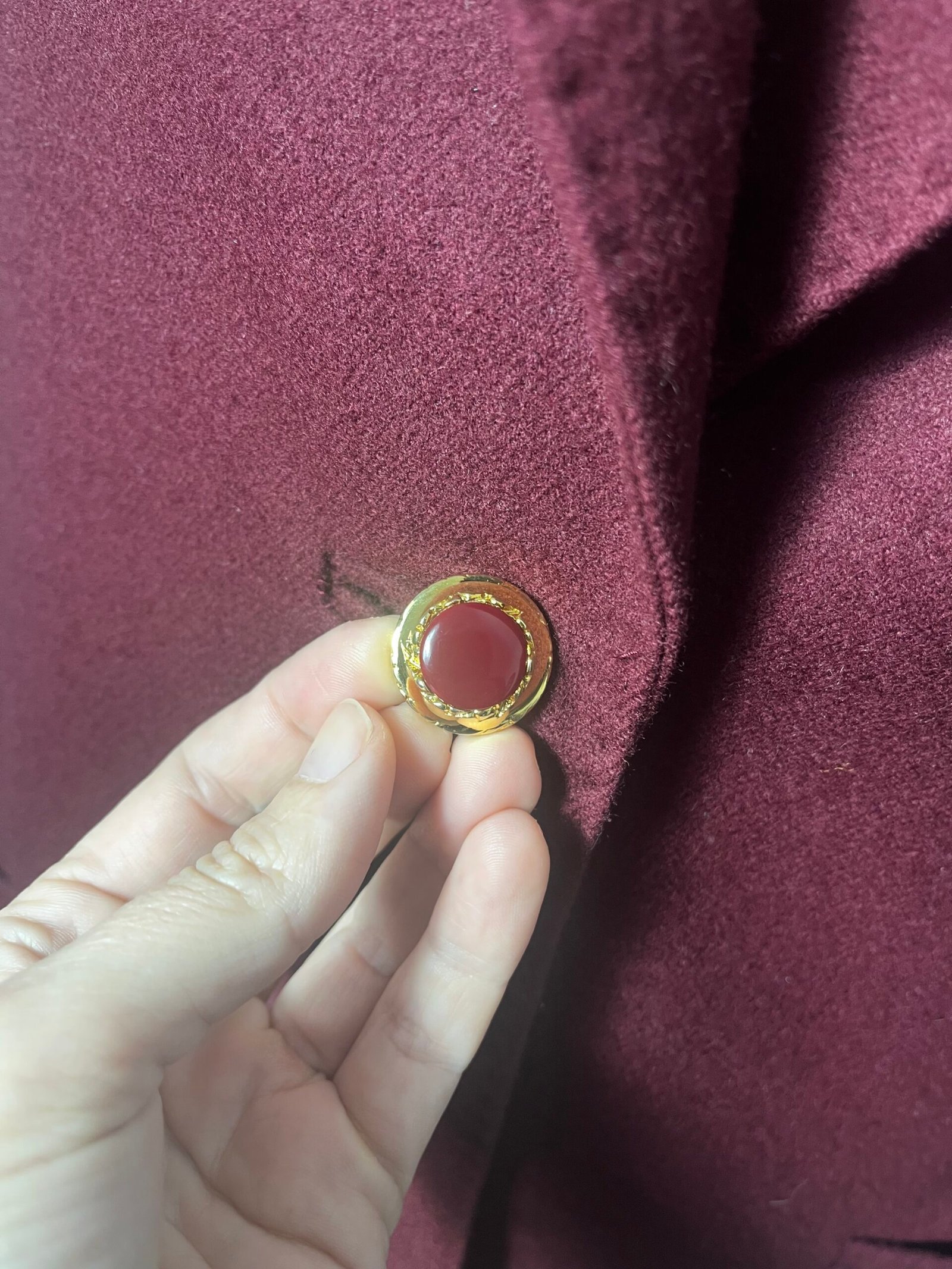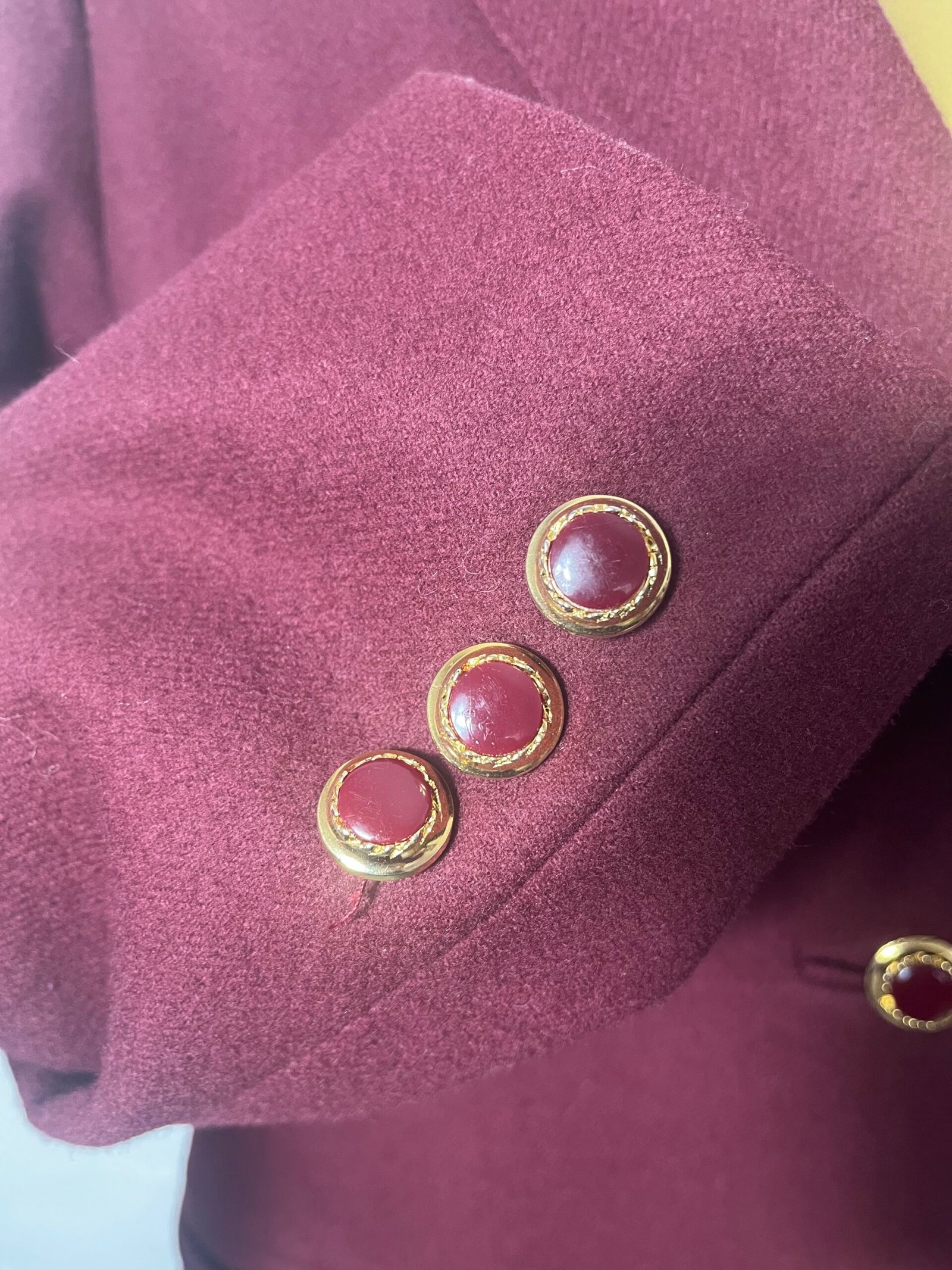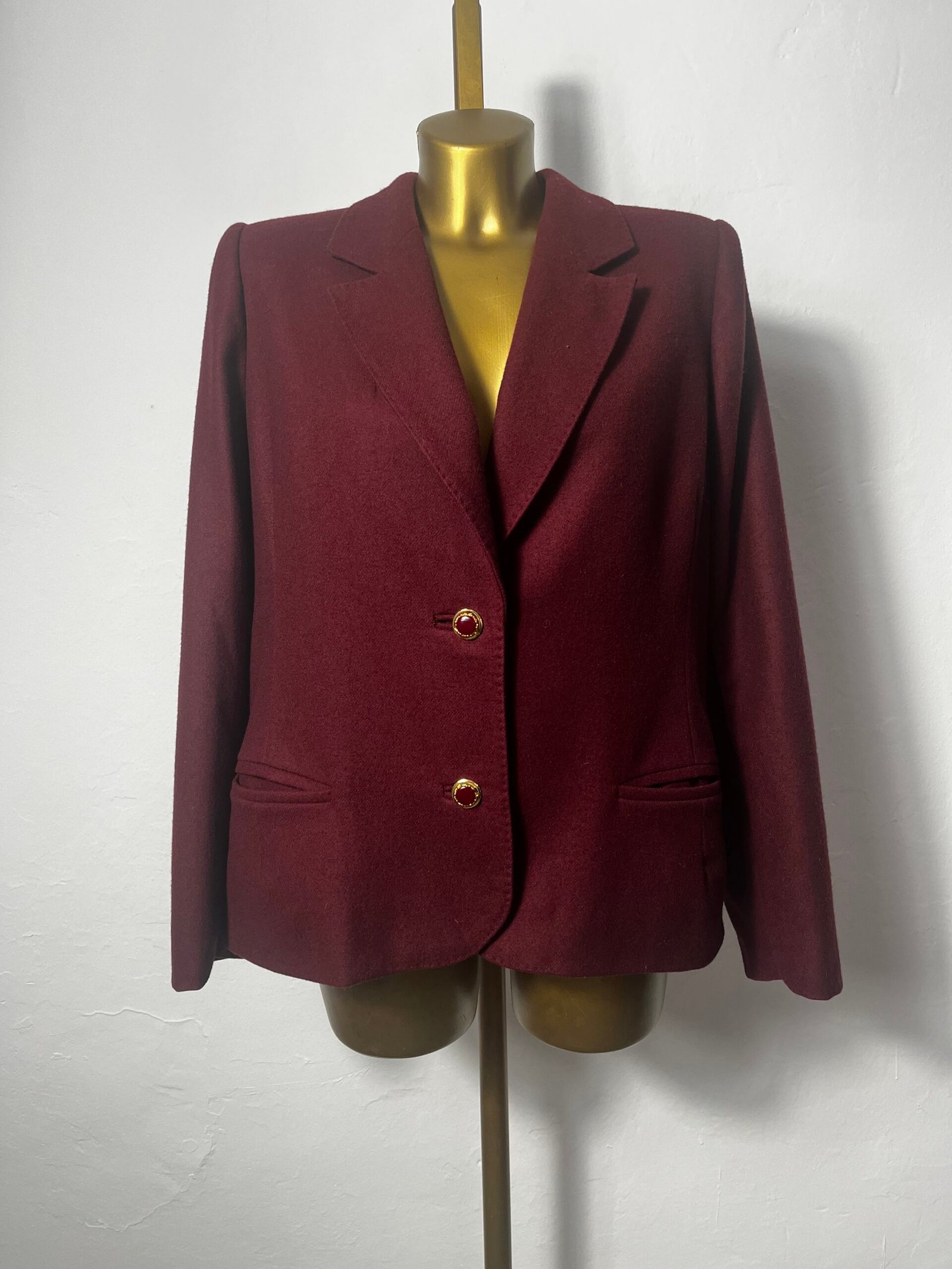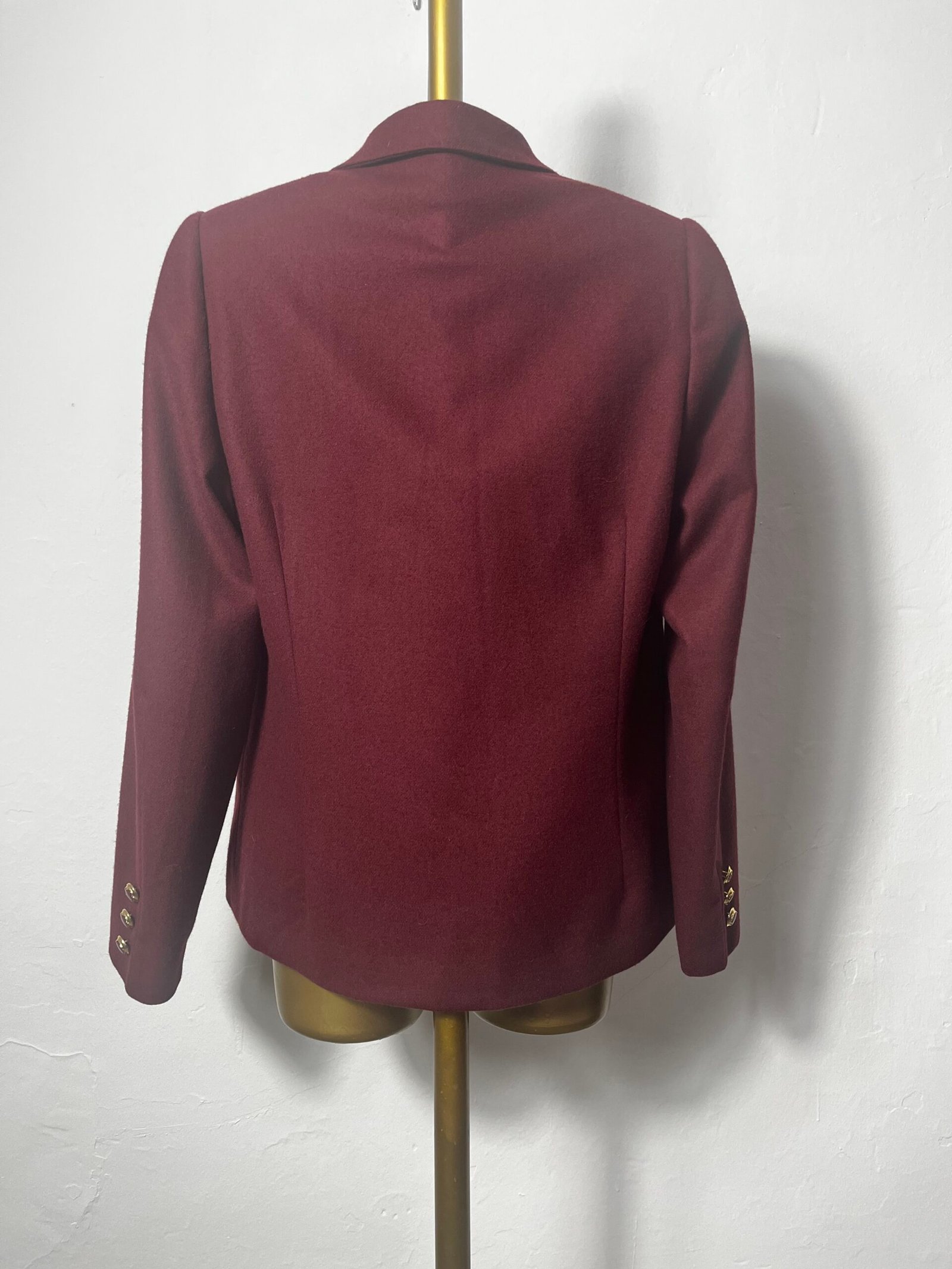 Blazer burdeos clásica de señora, de lana con botones vintage y hombrera marcada.