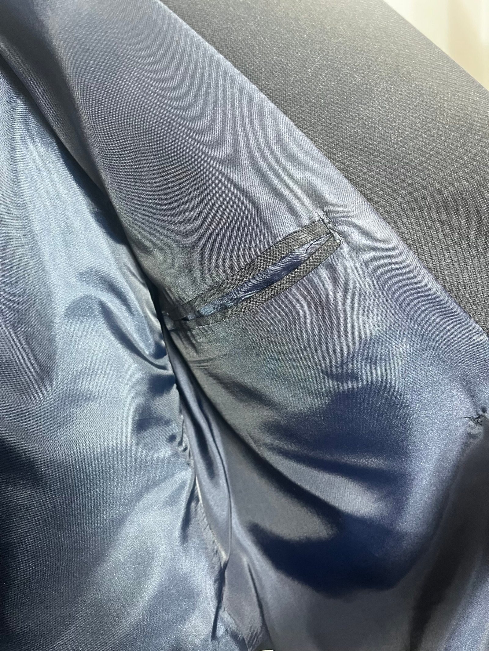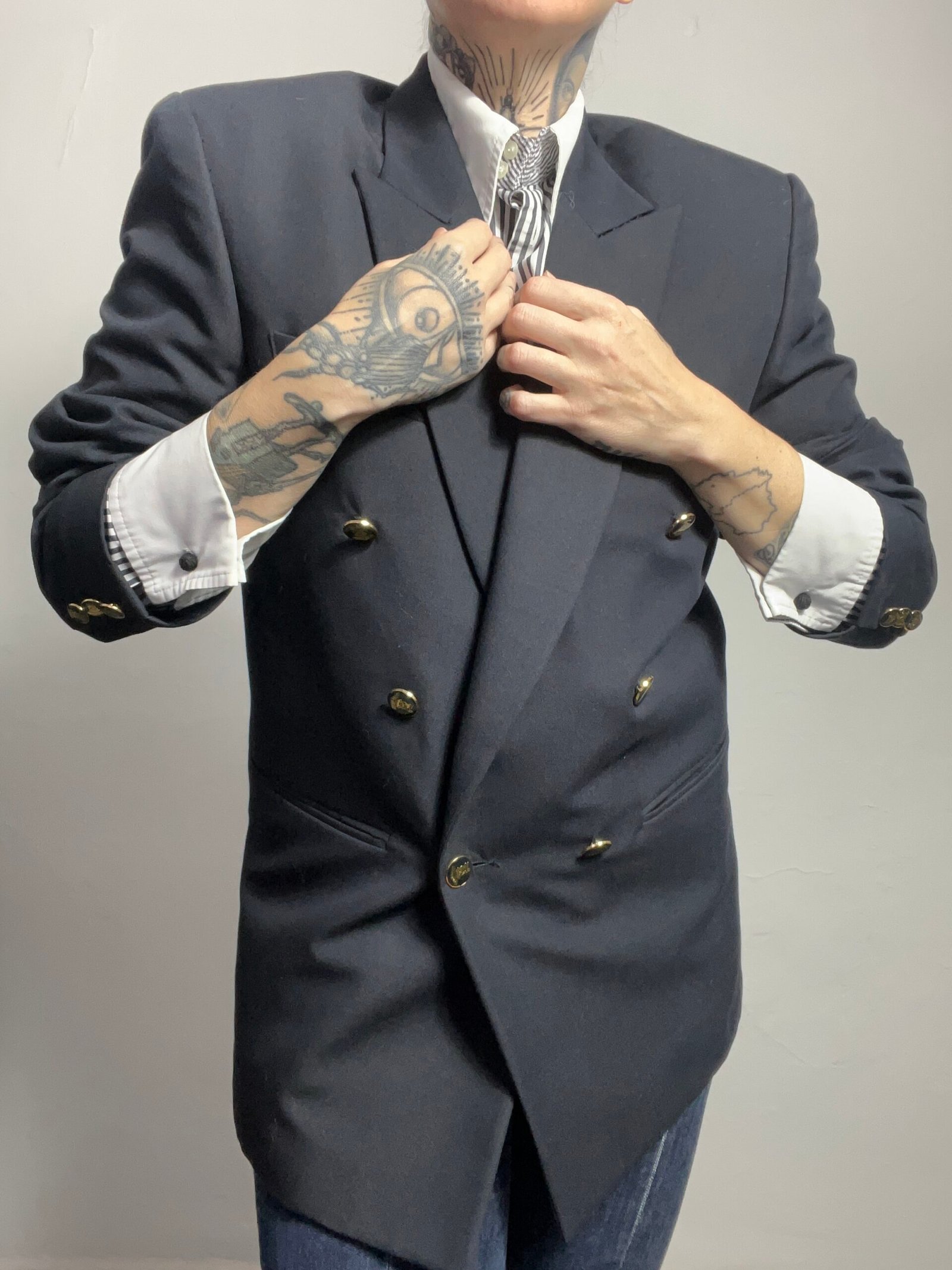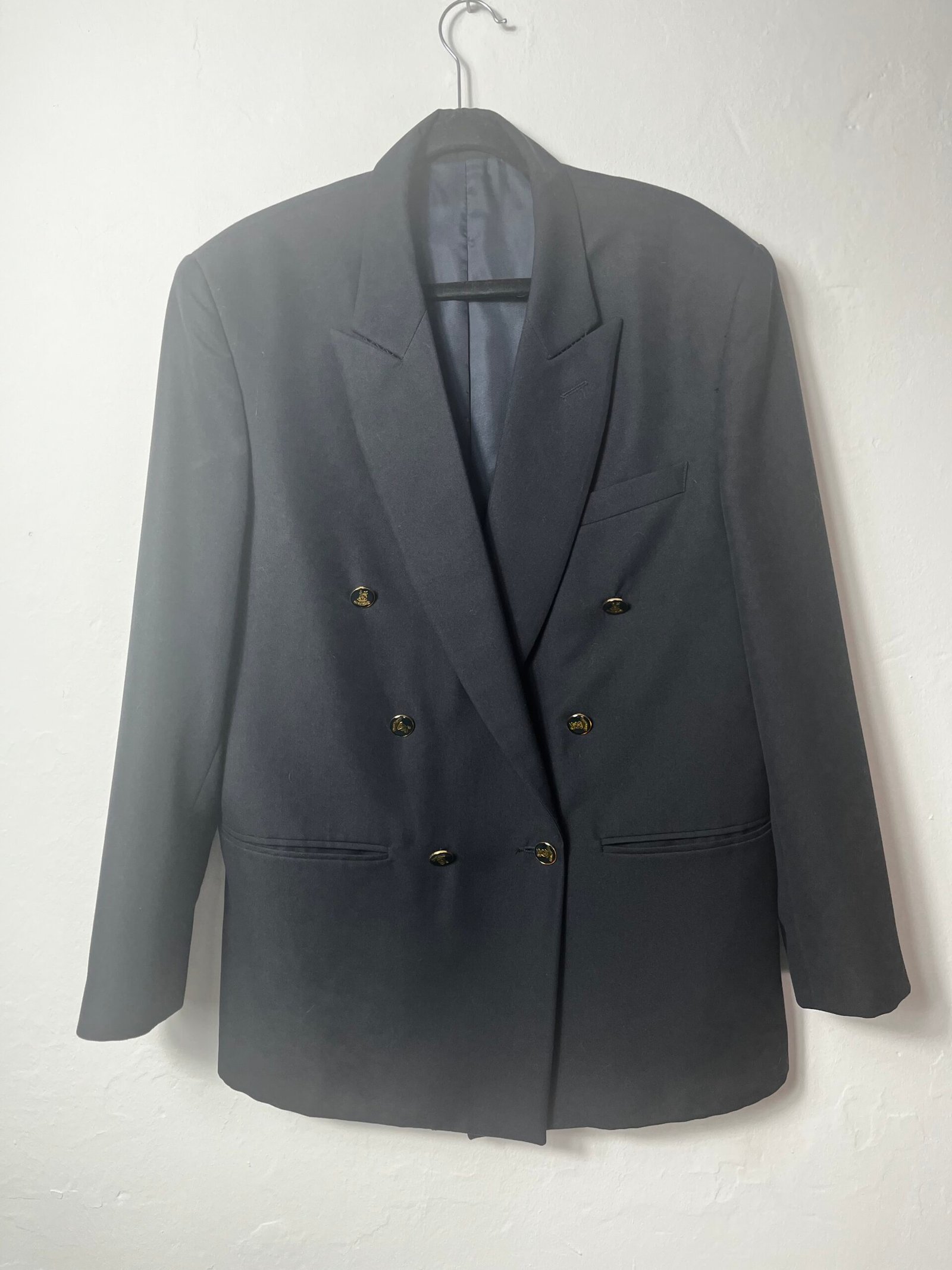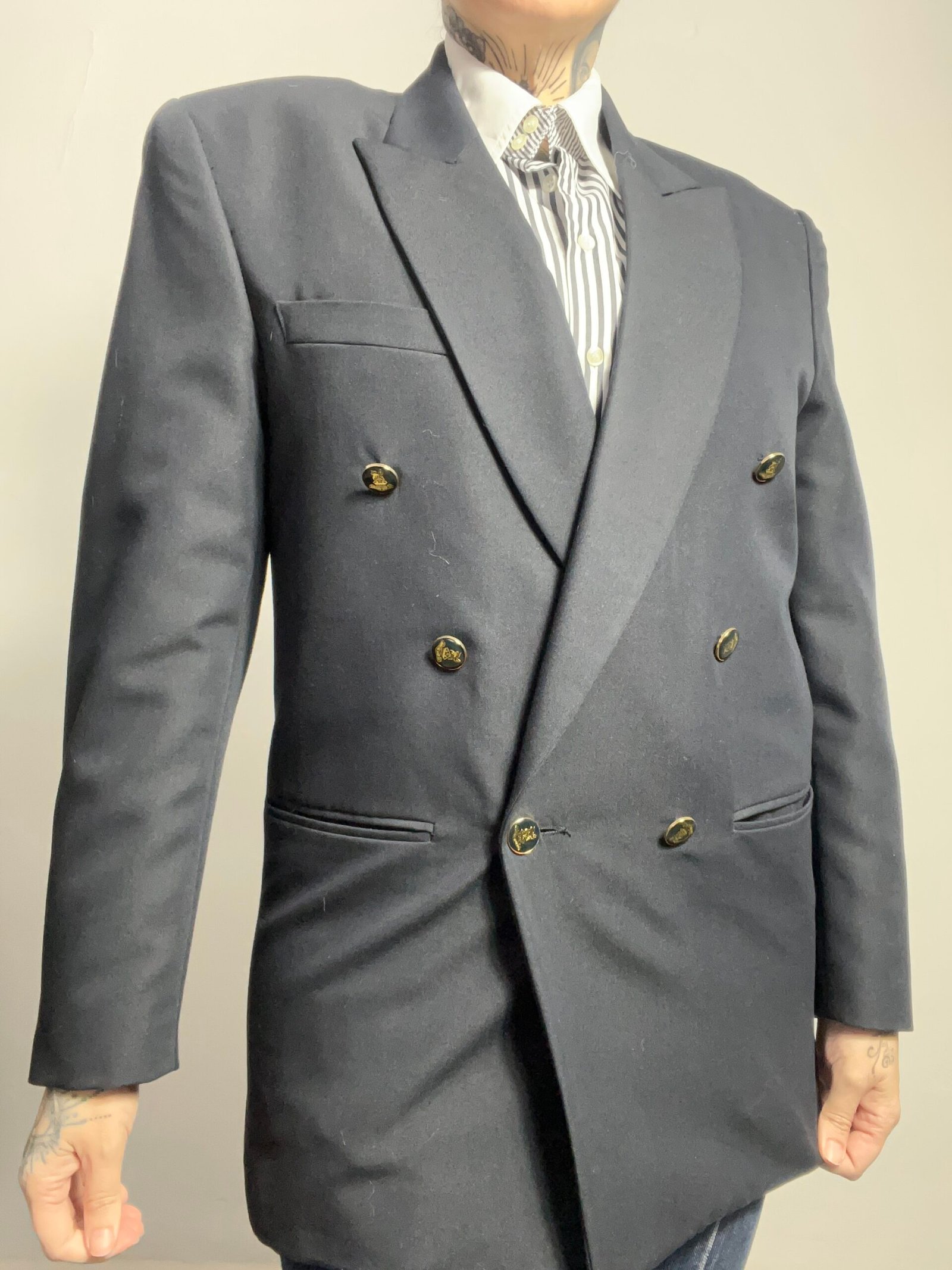 Blazer masculina vintage, cruzada, muy clásica, en azul marino, con hombreras estructuradas y botonadura clásica.
