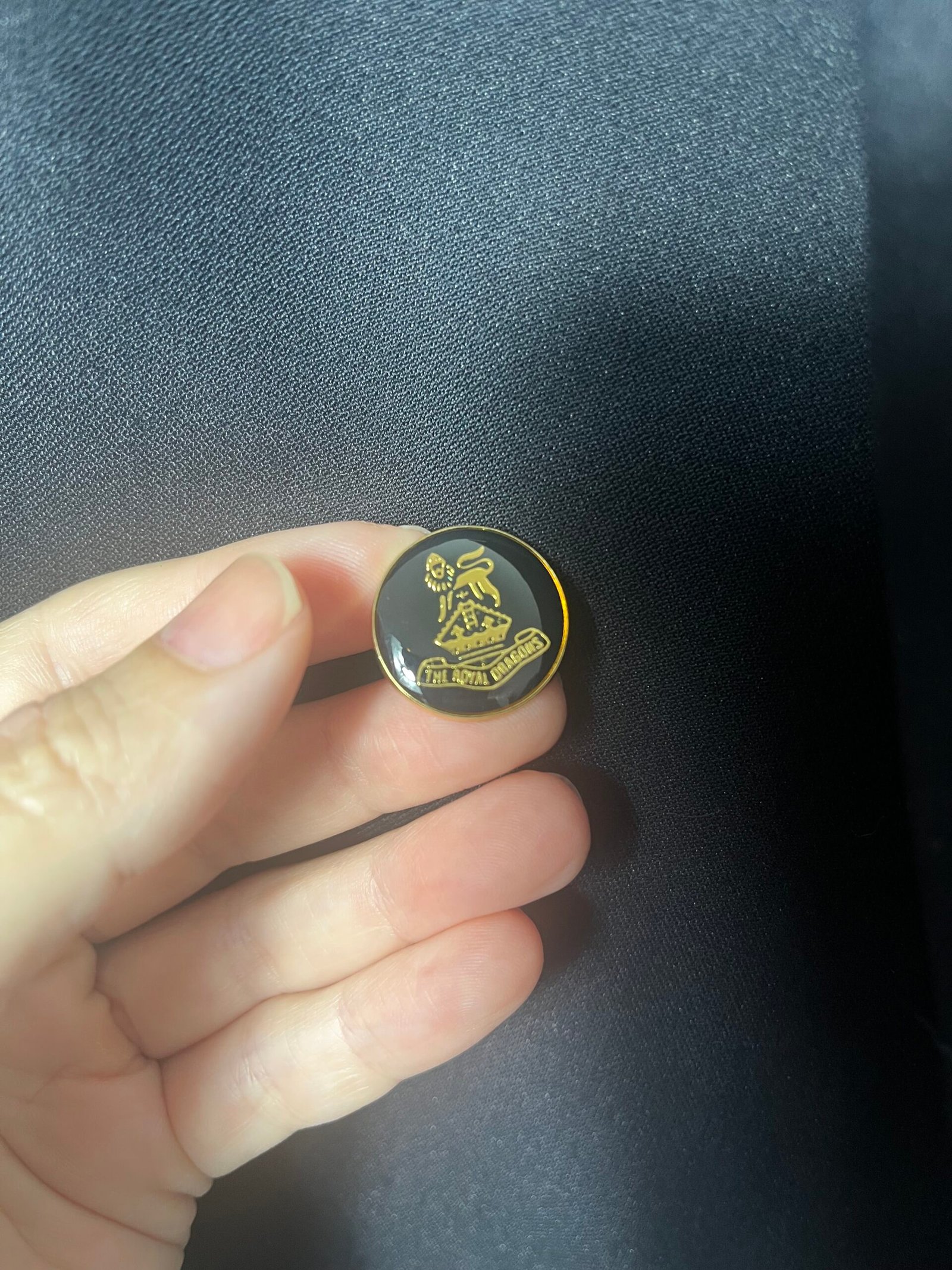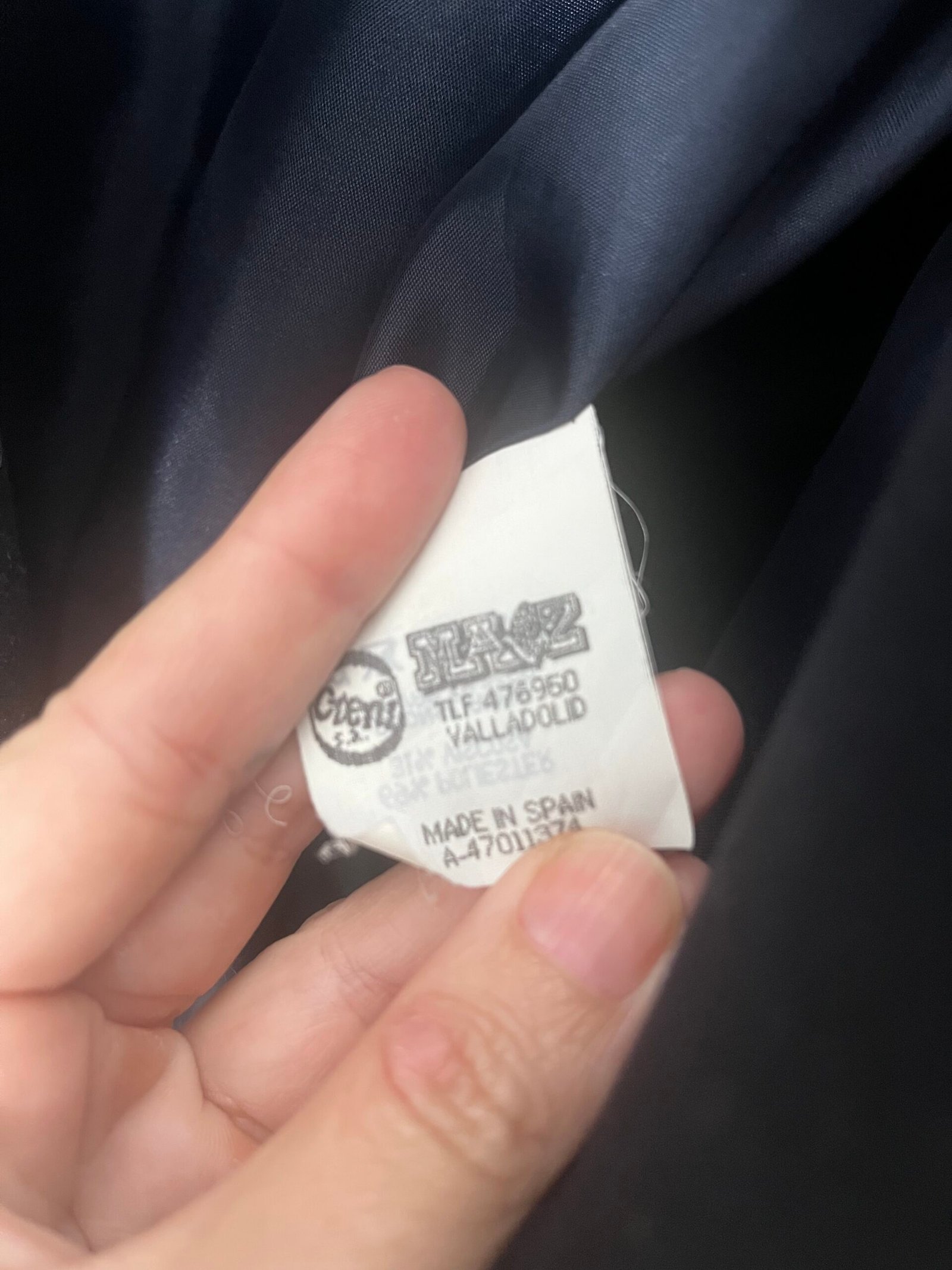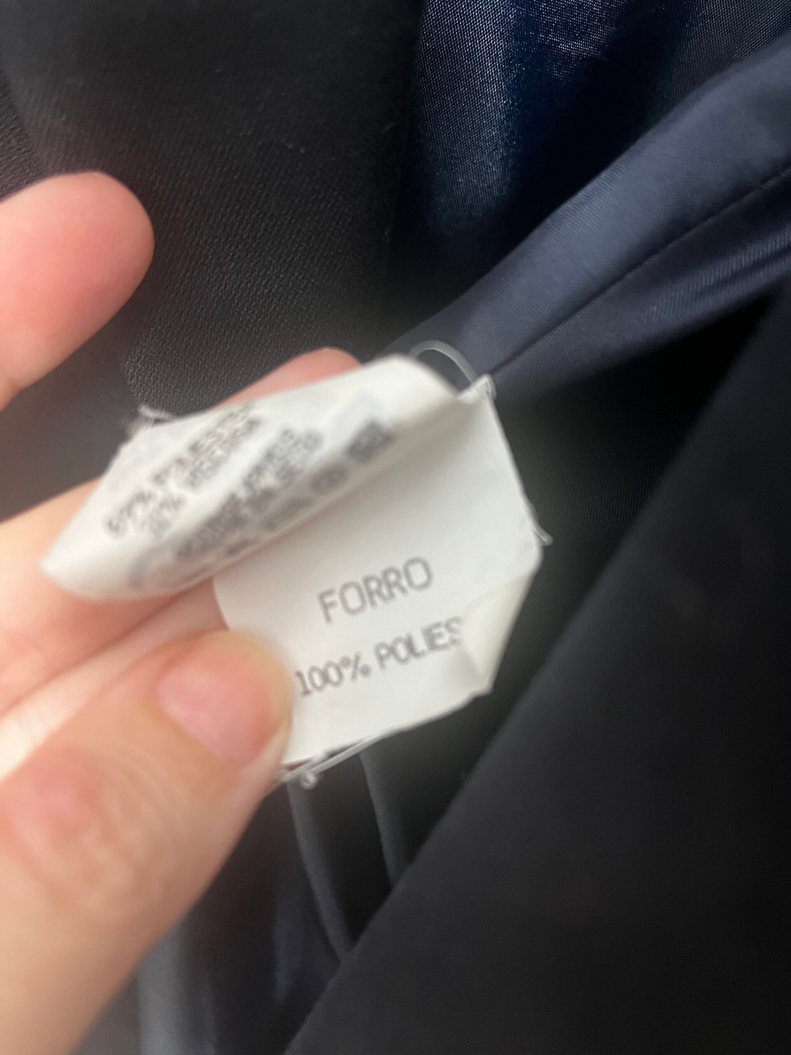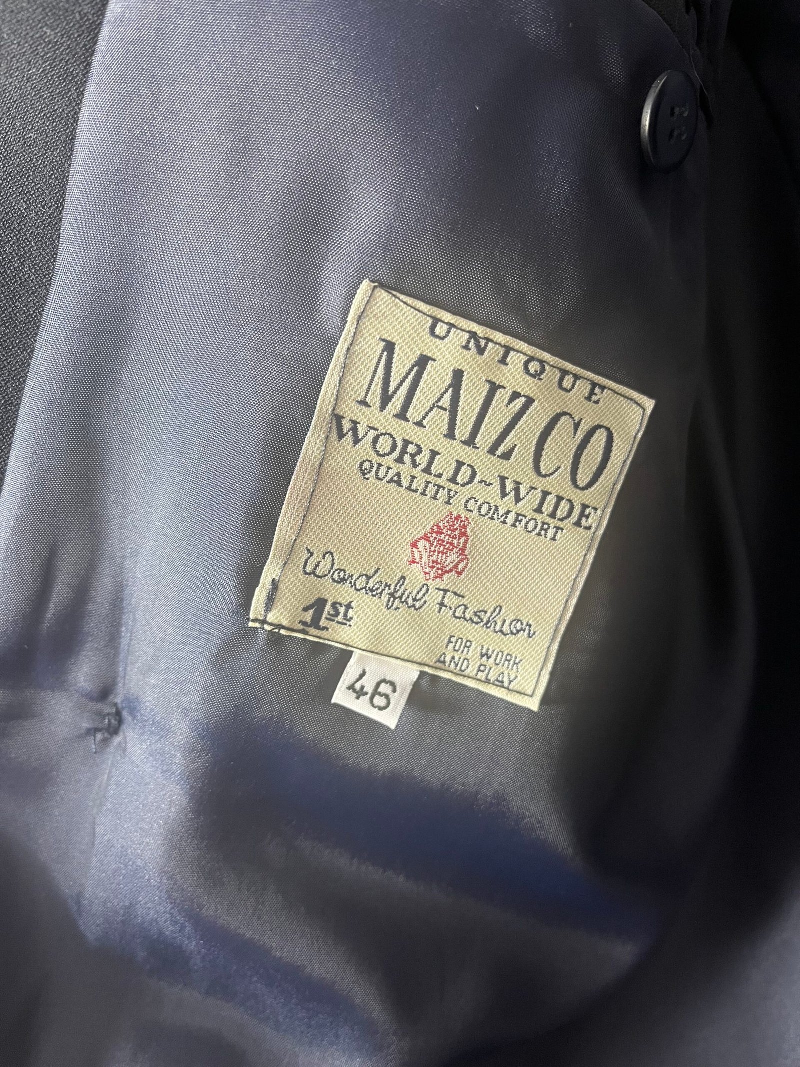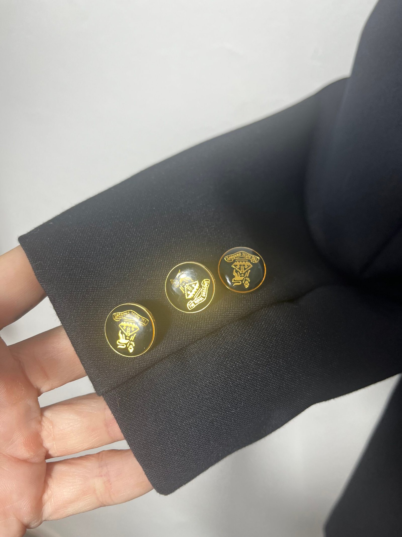Blazer masculina vintage, cruzada, muy clásica, en azul marino, con hombreras estructuradas y botonadura clásica.