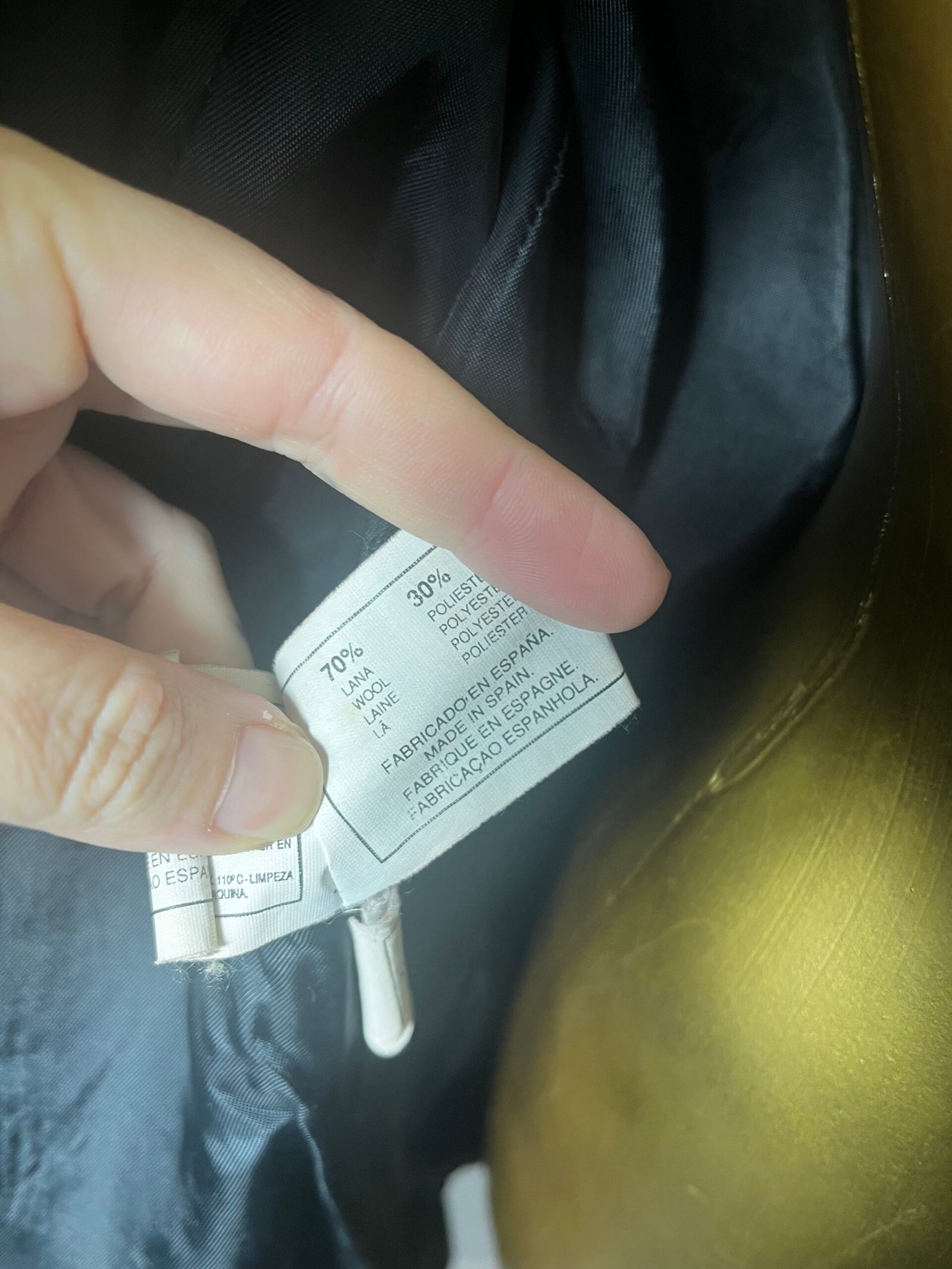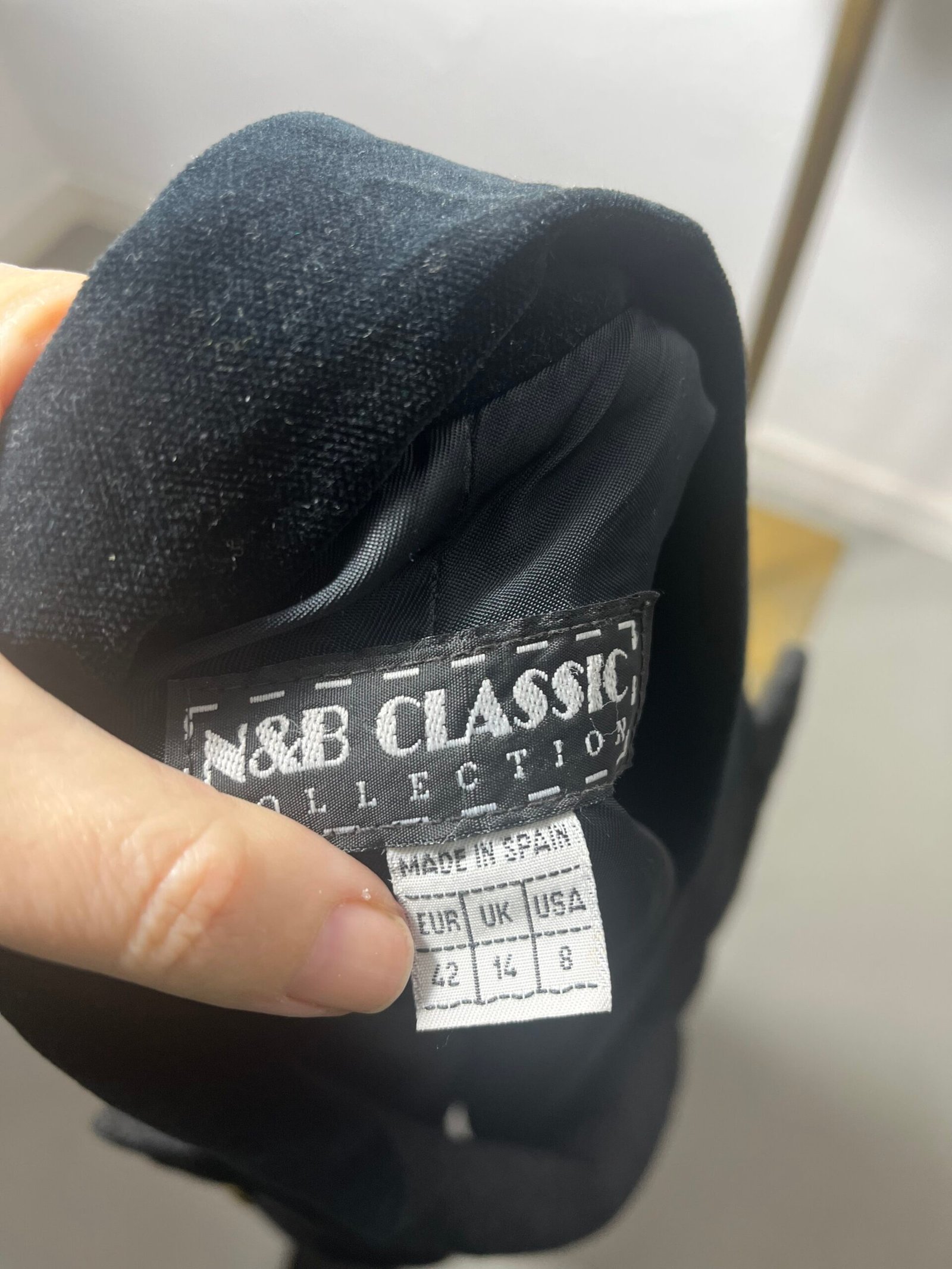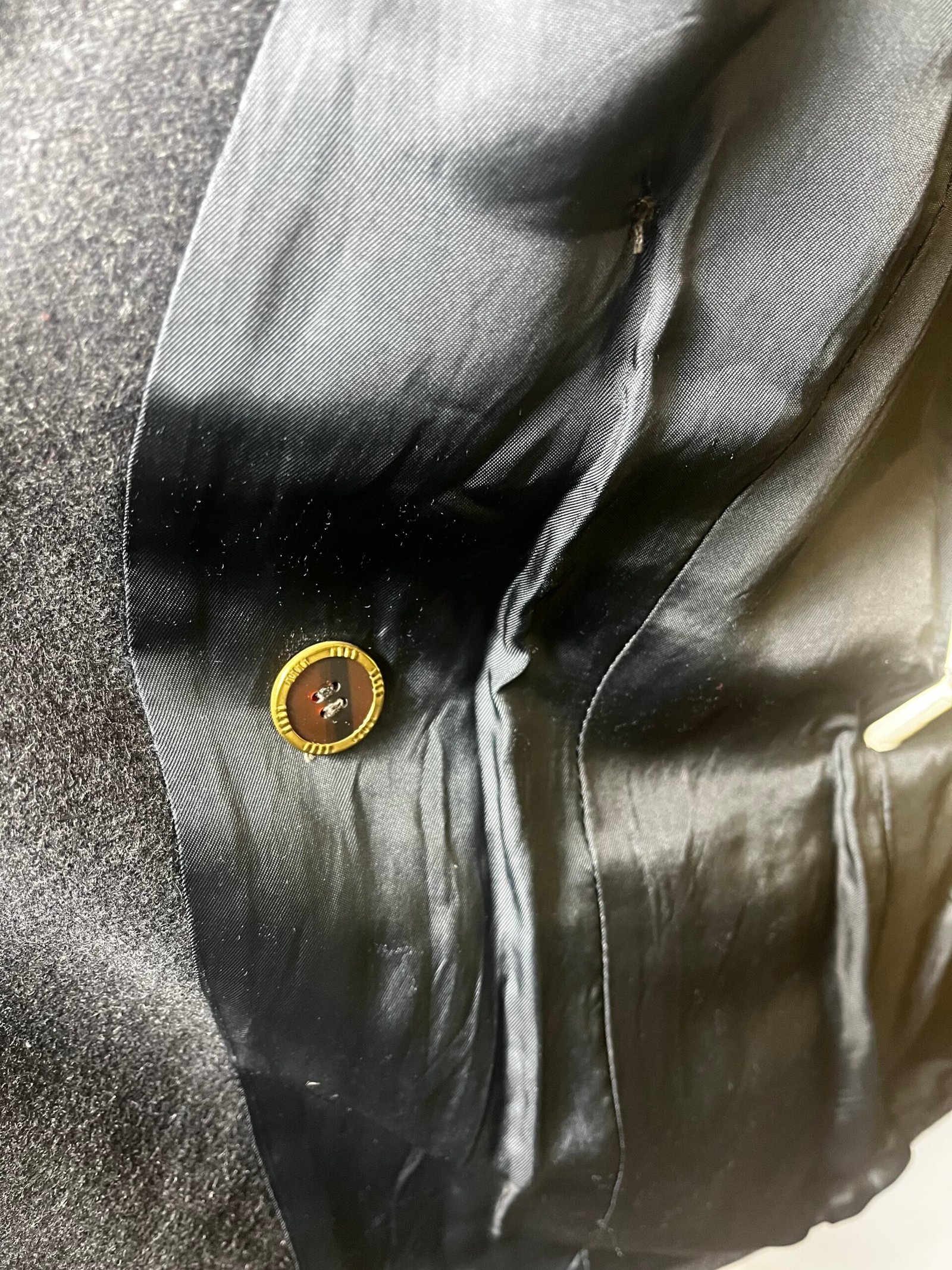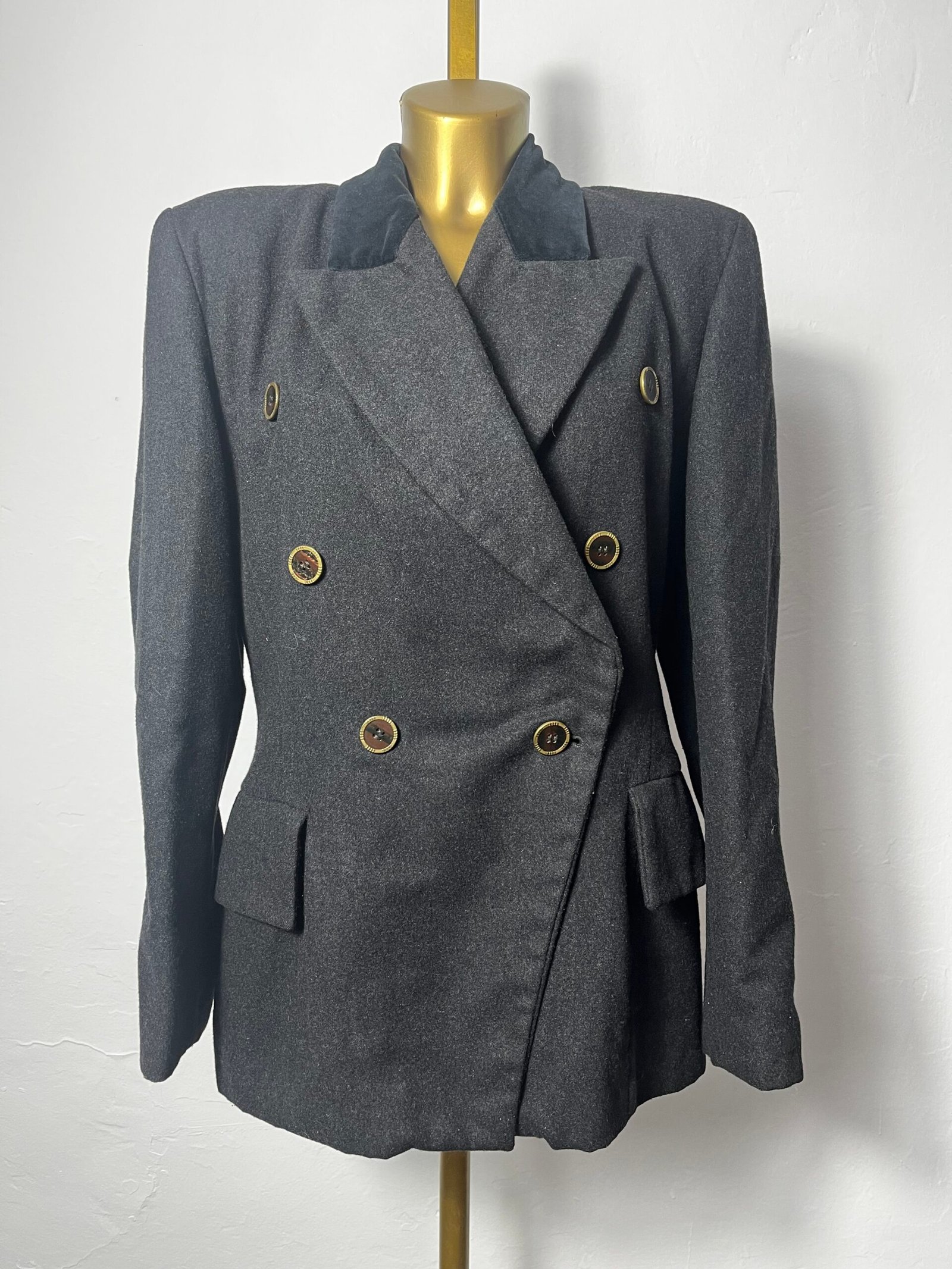 Chaqueta vintage cruzada, de N&B CLASSIC, marca de Inditex años 90´s, en mezcla de lana y poliéster gris oscuro, con solapa en terciopelo negro y múltiples botones vintage, en delantero y mangas.