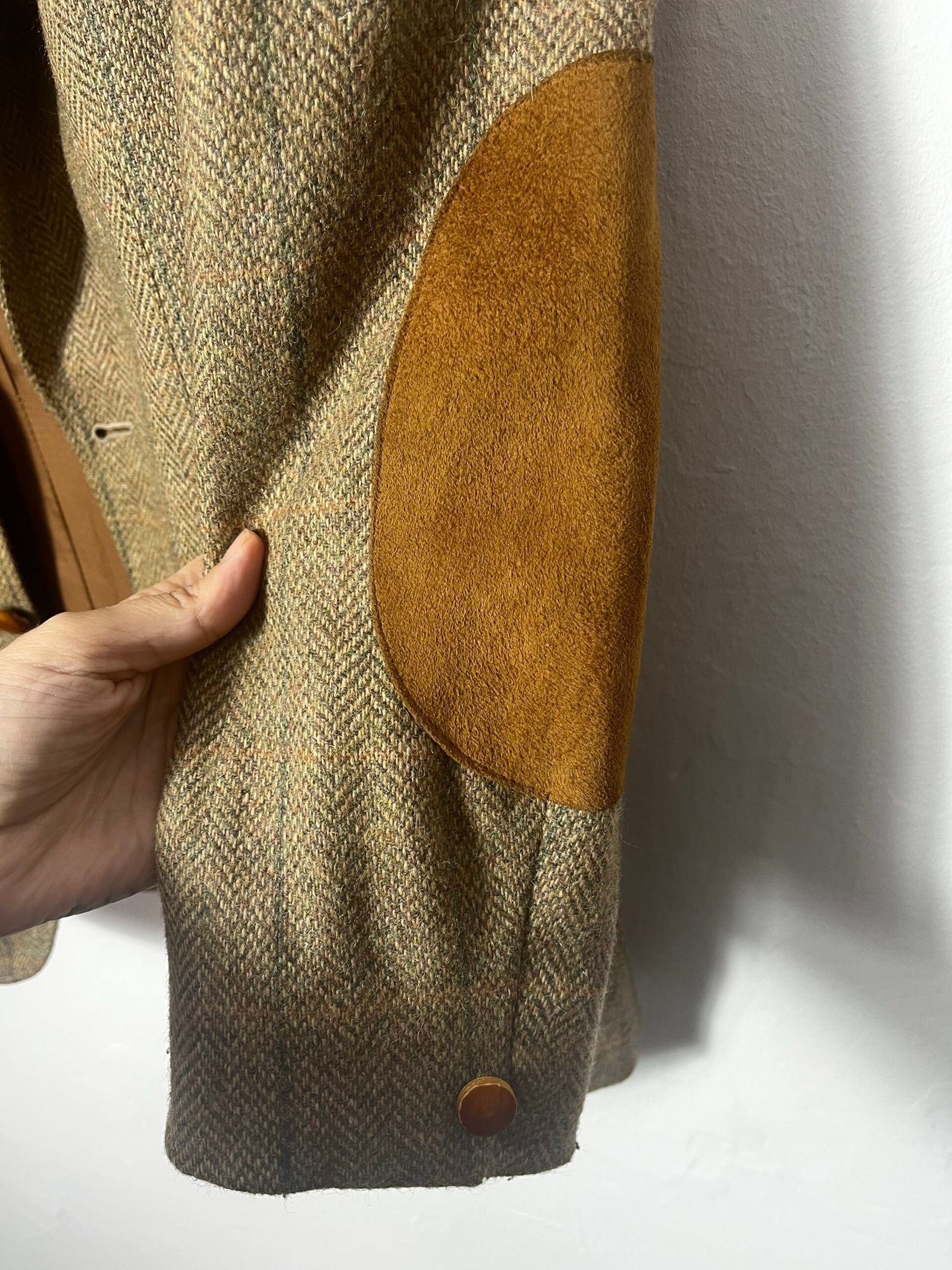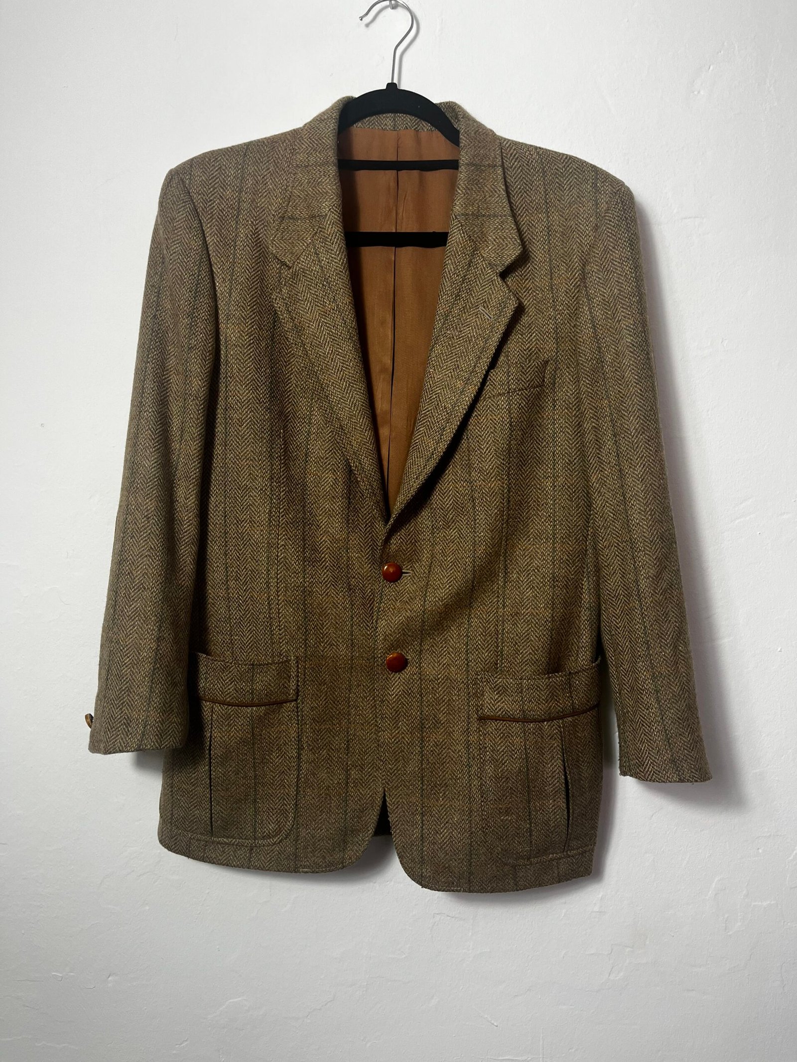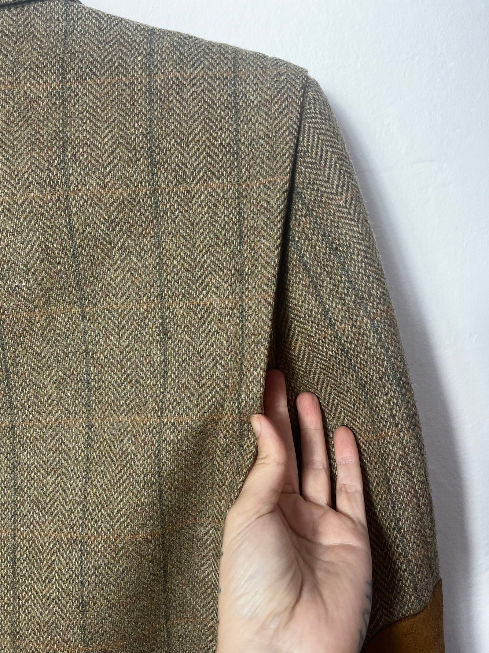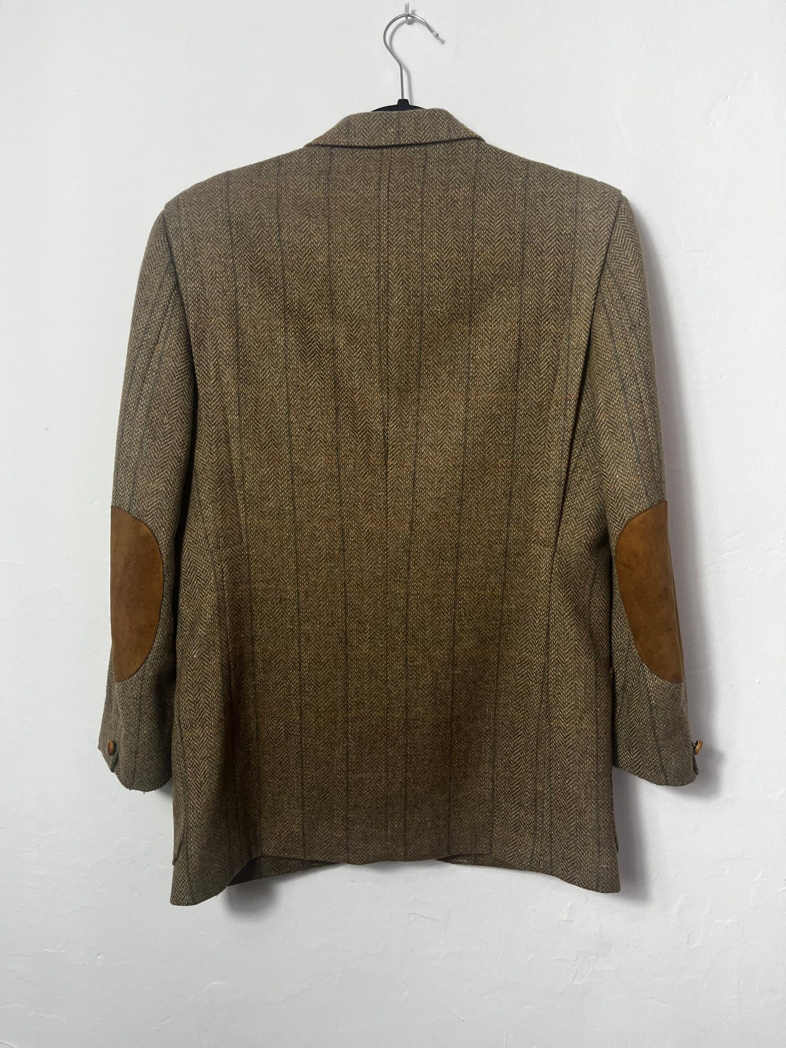 Blazer de lana, tejido de espigas en marrón con coderas de ante en camel.
