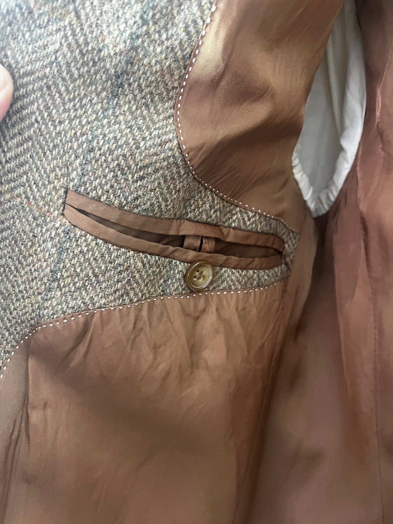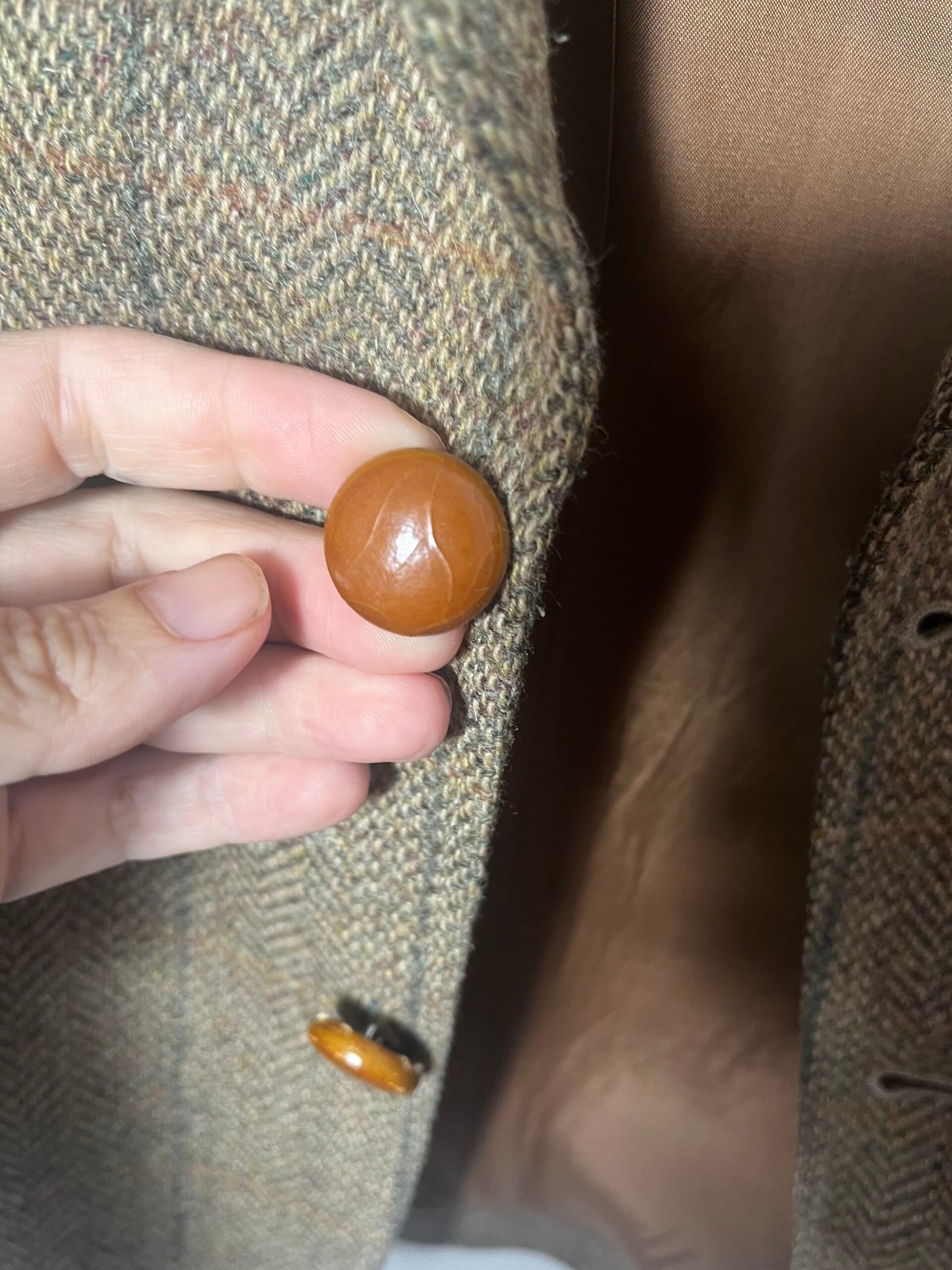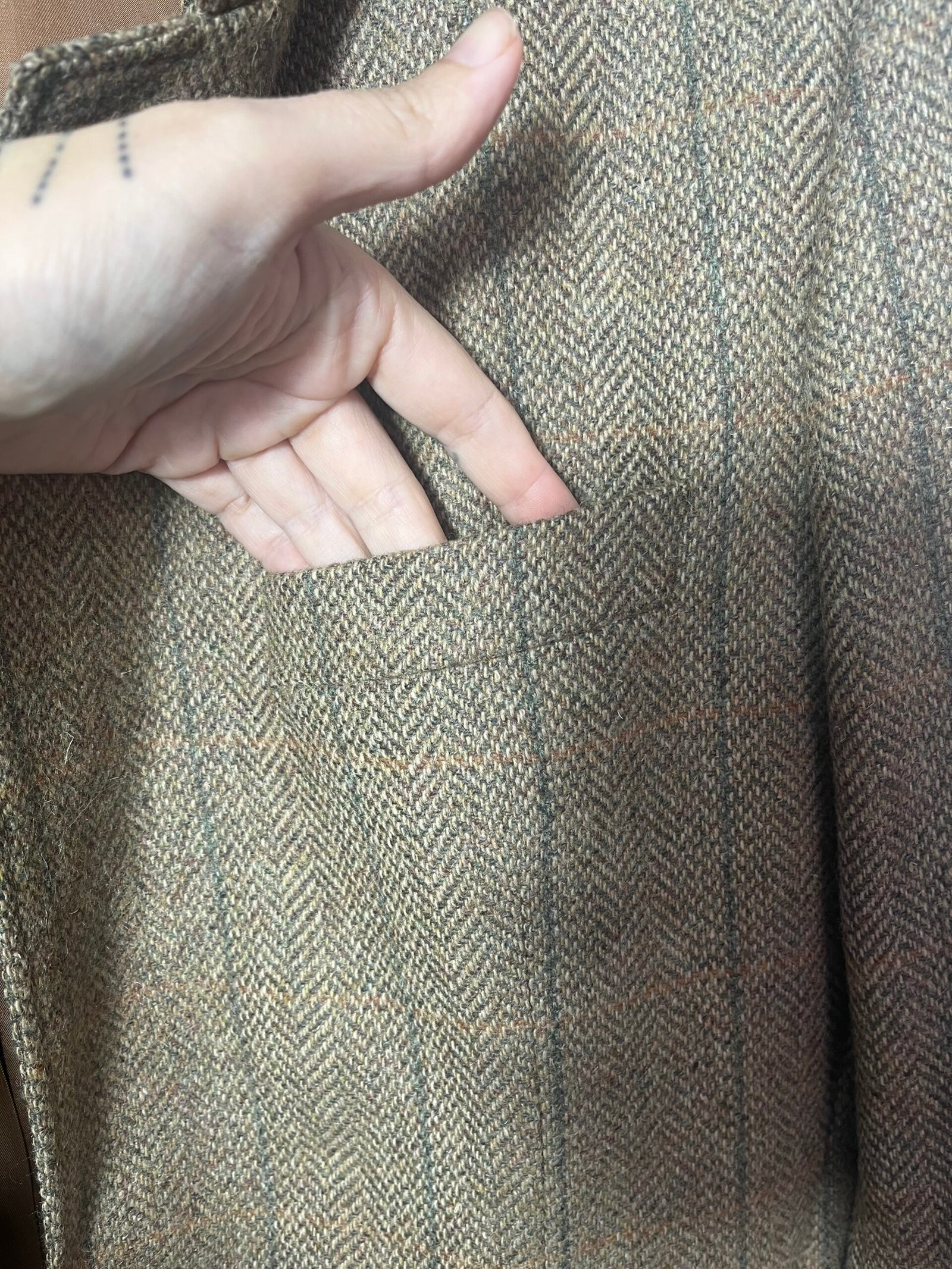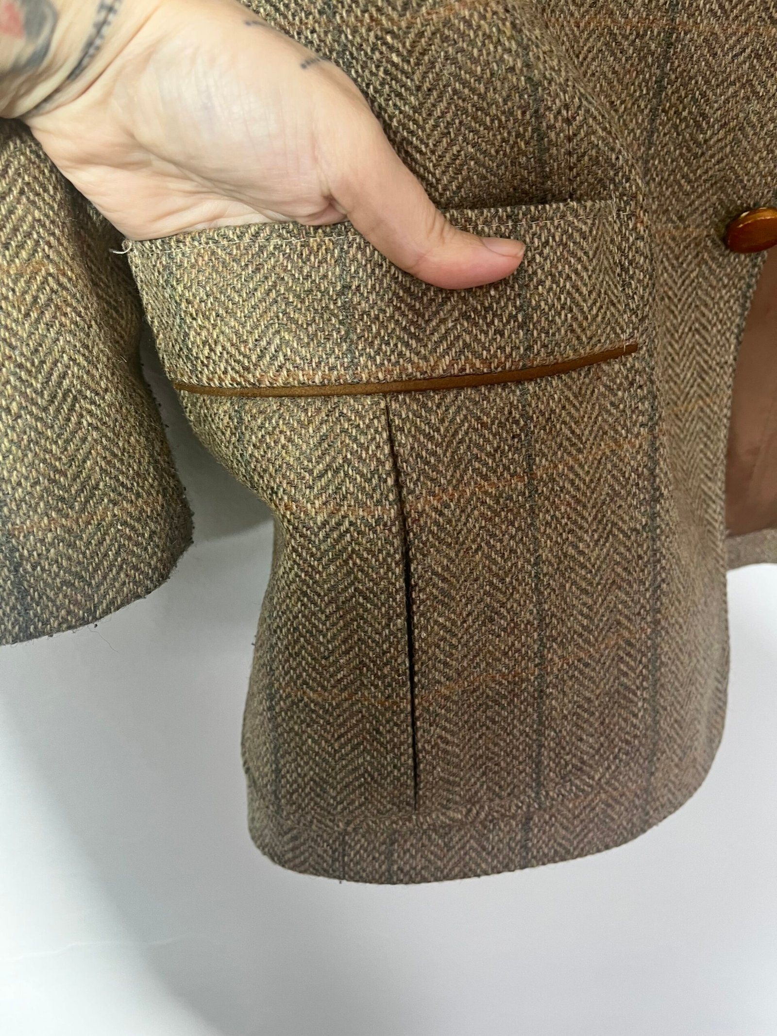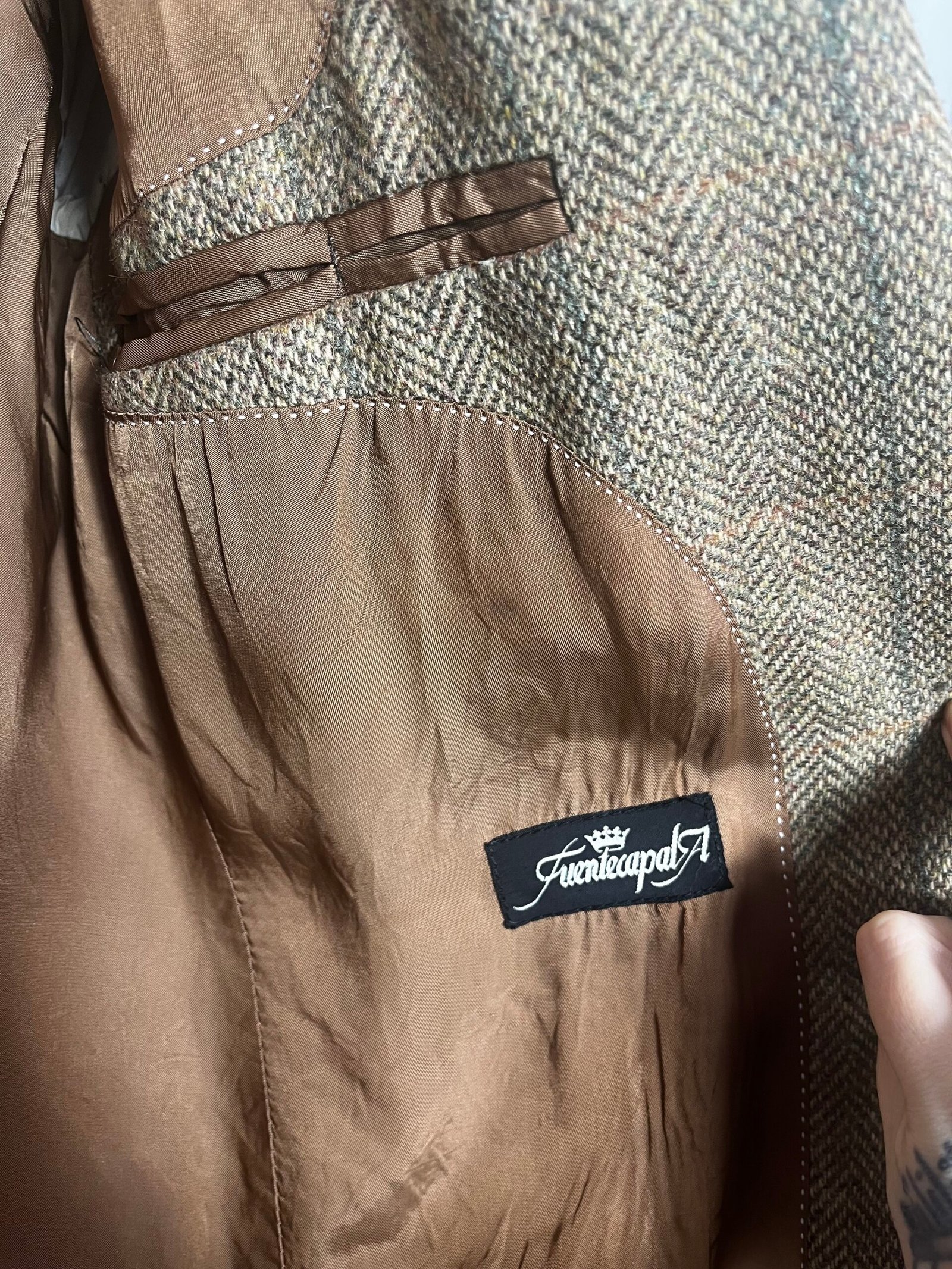 Blazer de lana, tejido de espigas en marrón con coderas de ante en camel.
