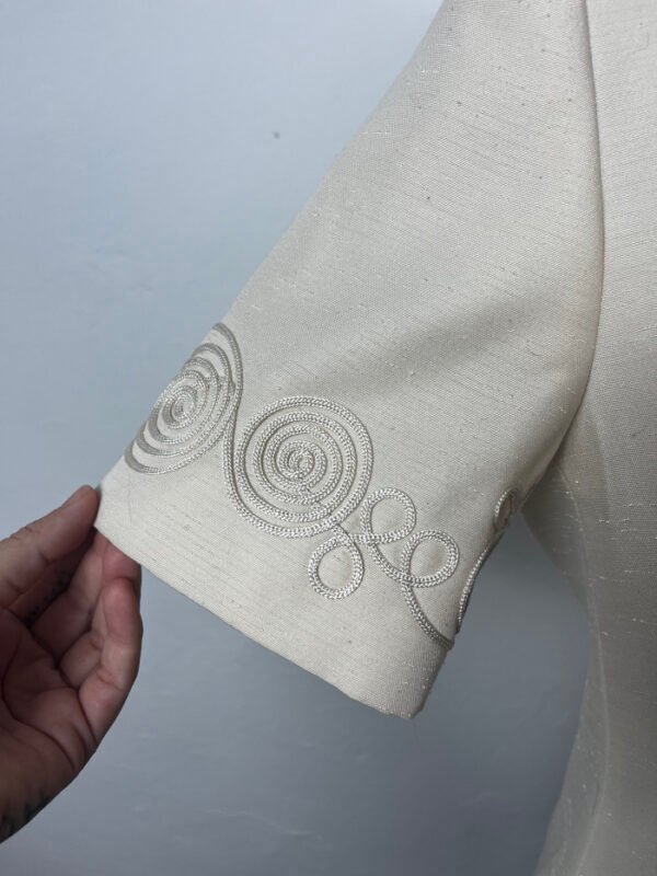 Blazer de manga corta, tejido seda salvaje beige y decoración preciosa con cuerda del mismo color.