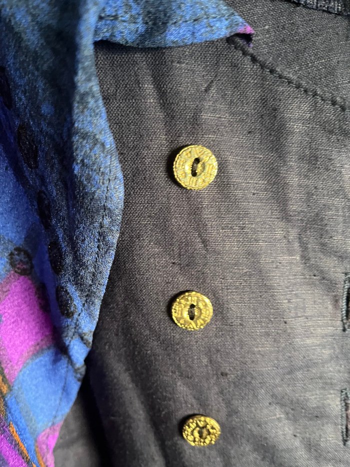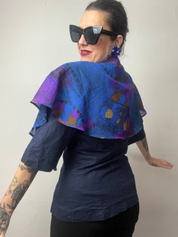 Vintage, años 90´s, cuerpo de lino y algodón en azul marino con botoncitos dorados y capita incorporada de algodón viscosa con precioso estampado en morados y azules.