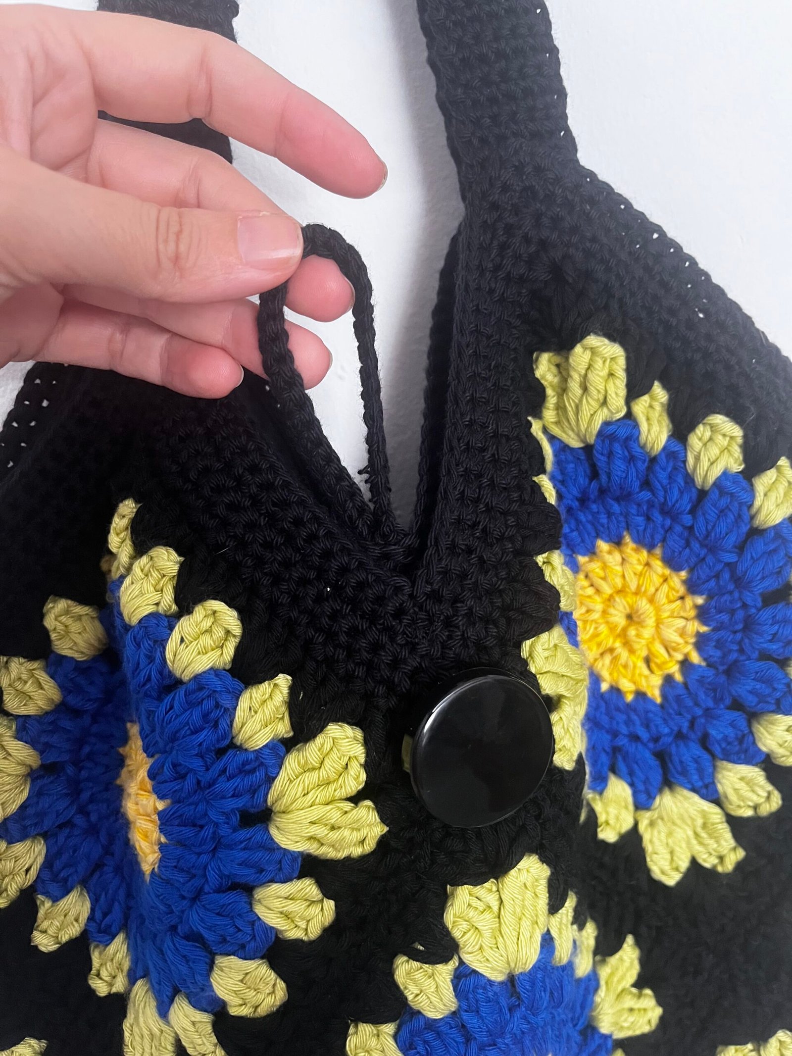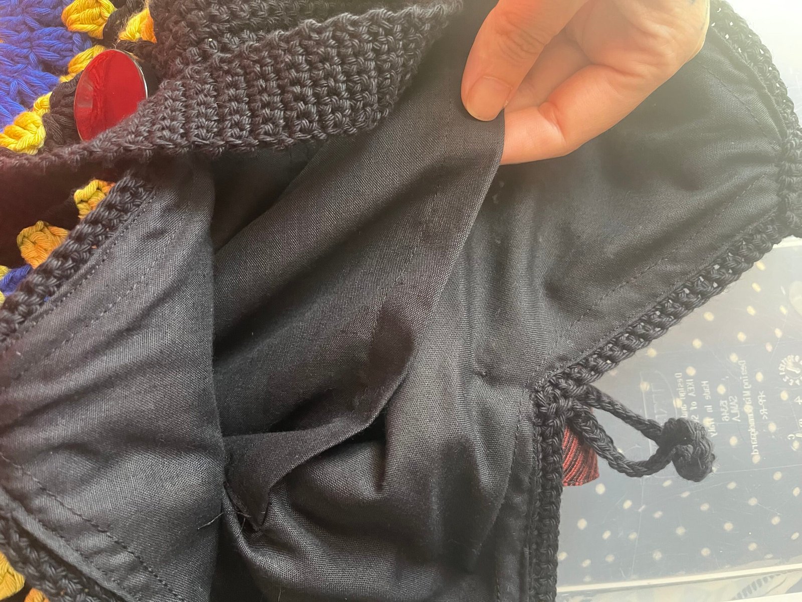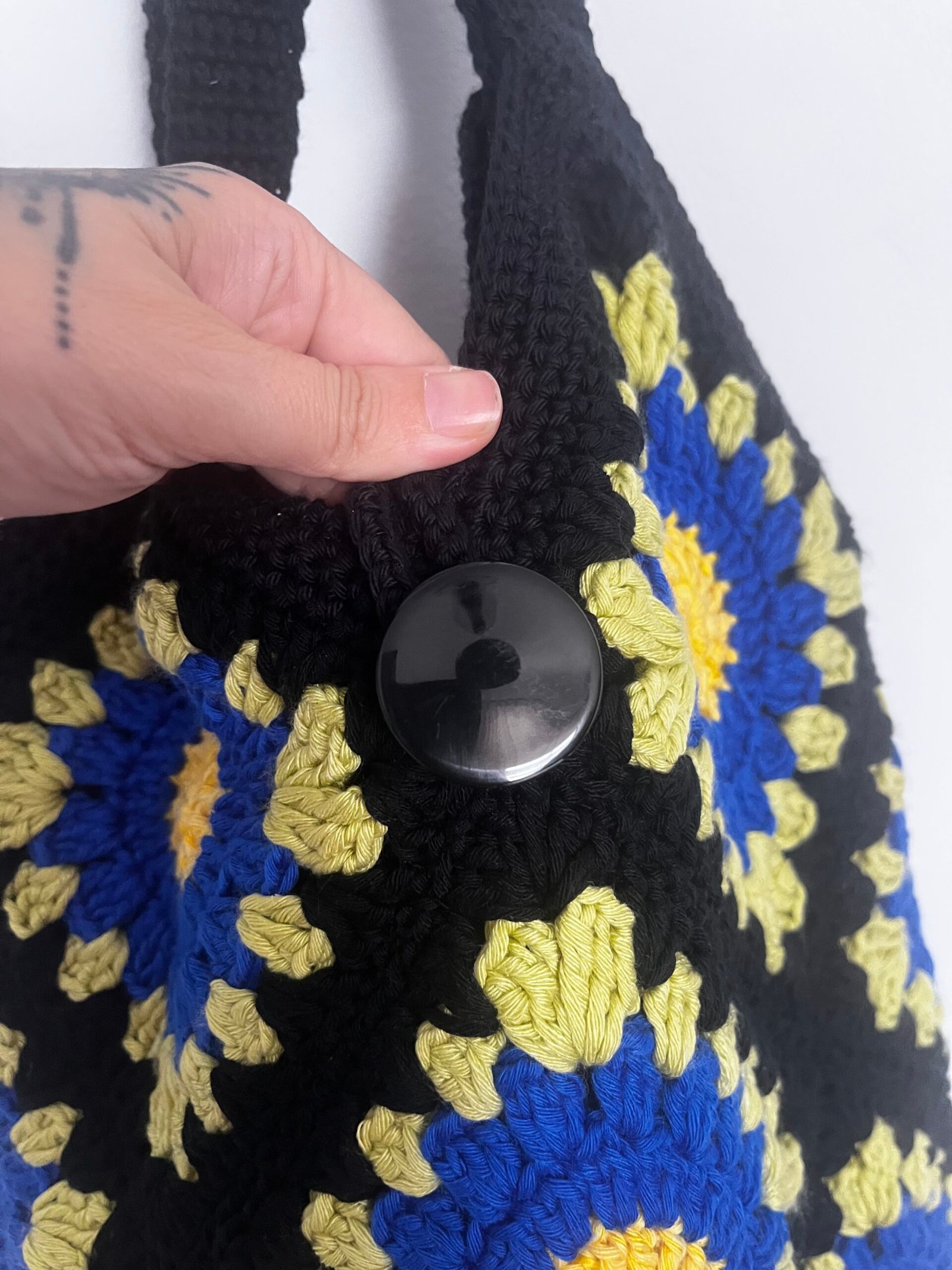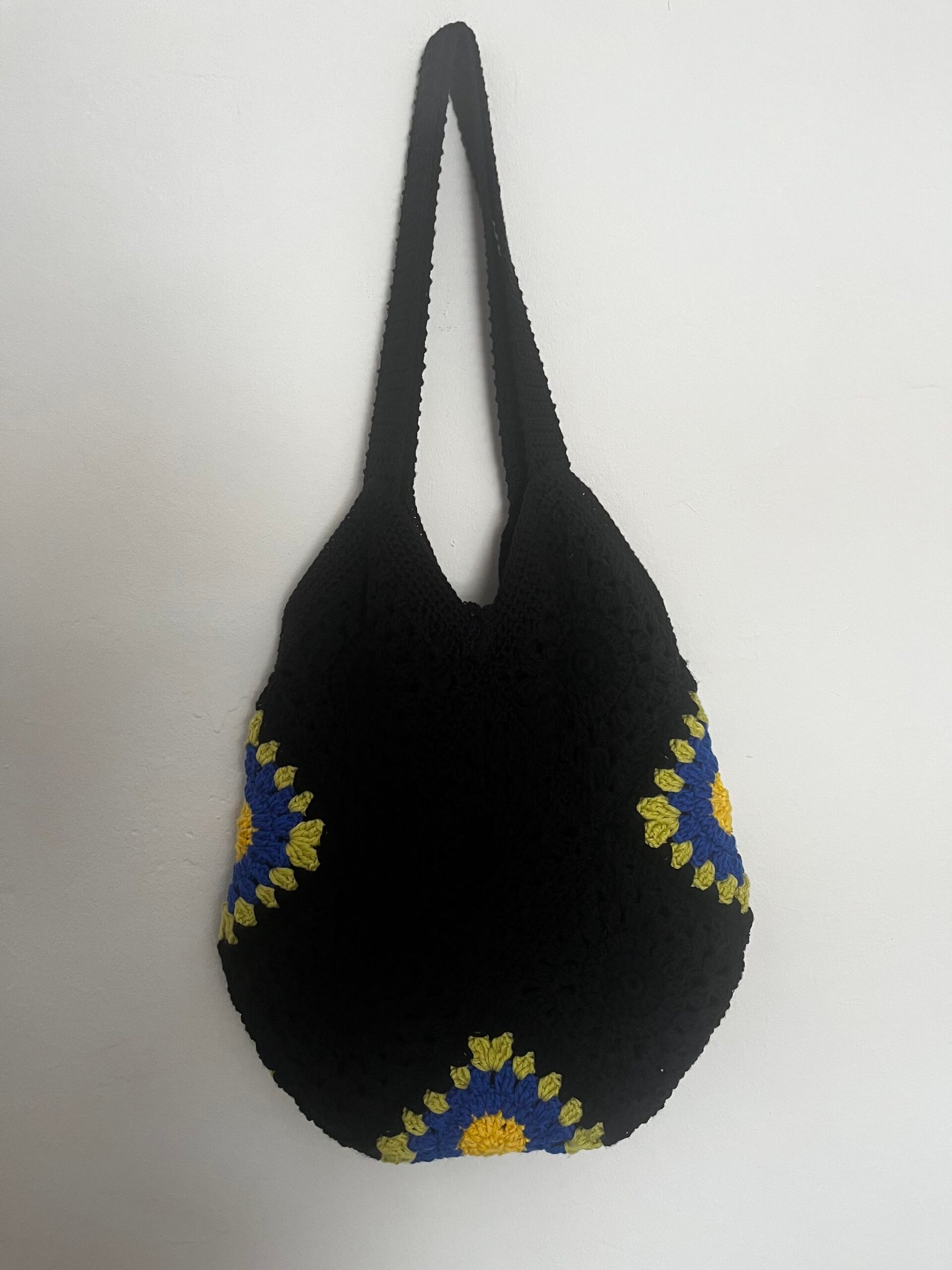 Bolso de aplicaciones, hecho a mano por mi madre, en negro, verde, amarillo y azul, con forro interior con diferentes compartimentos.