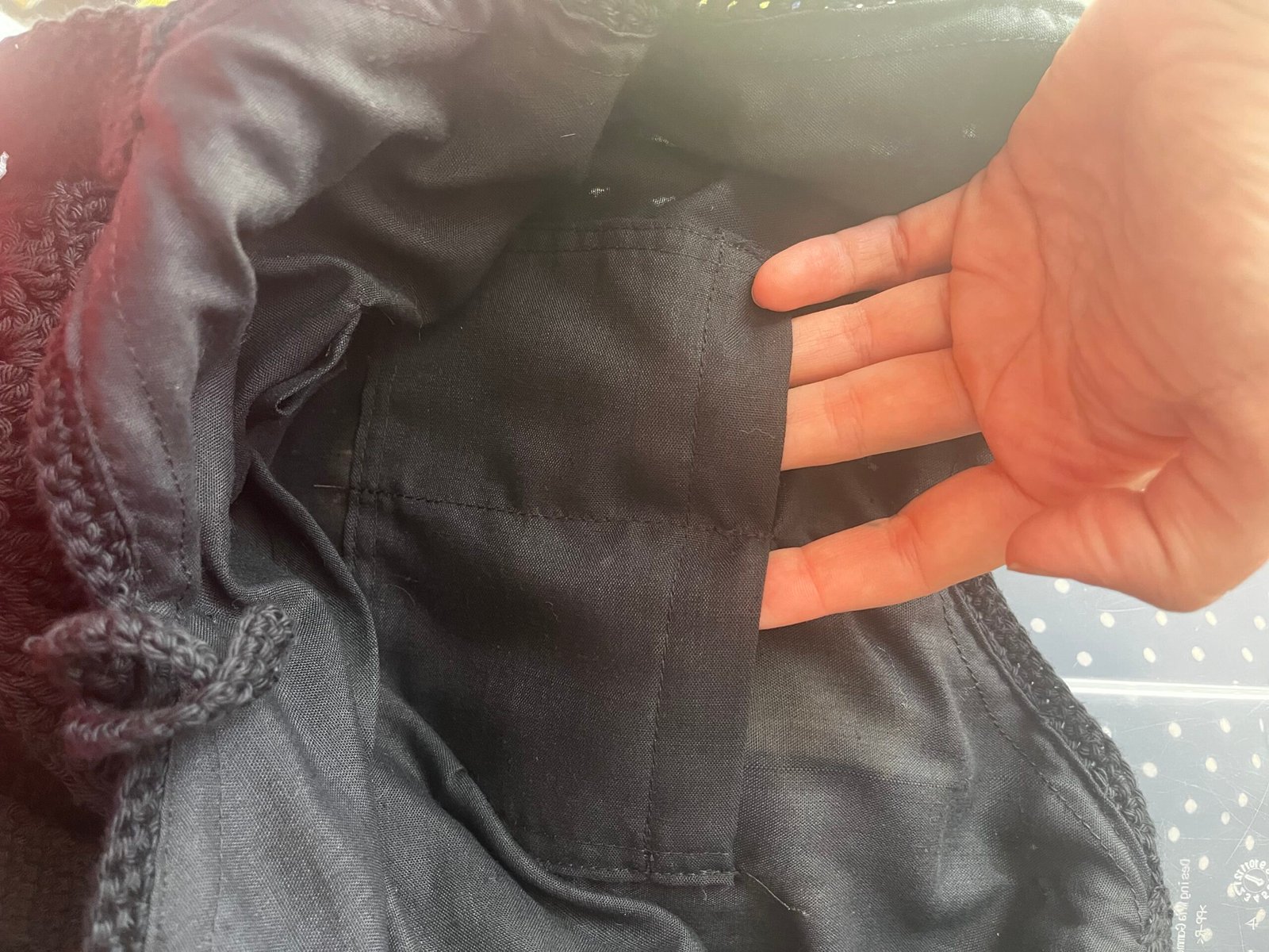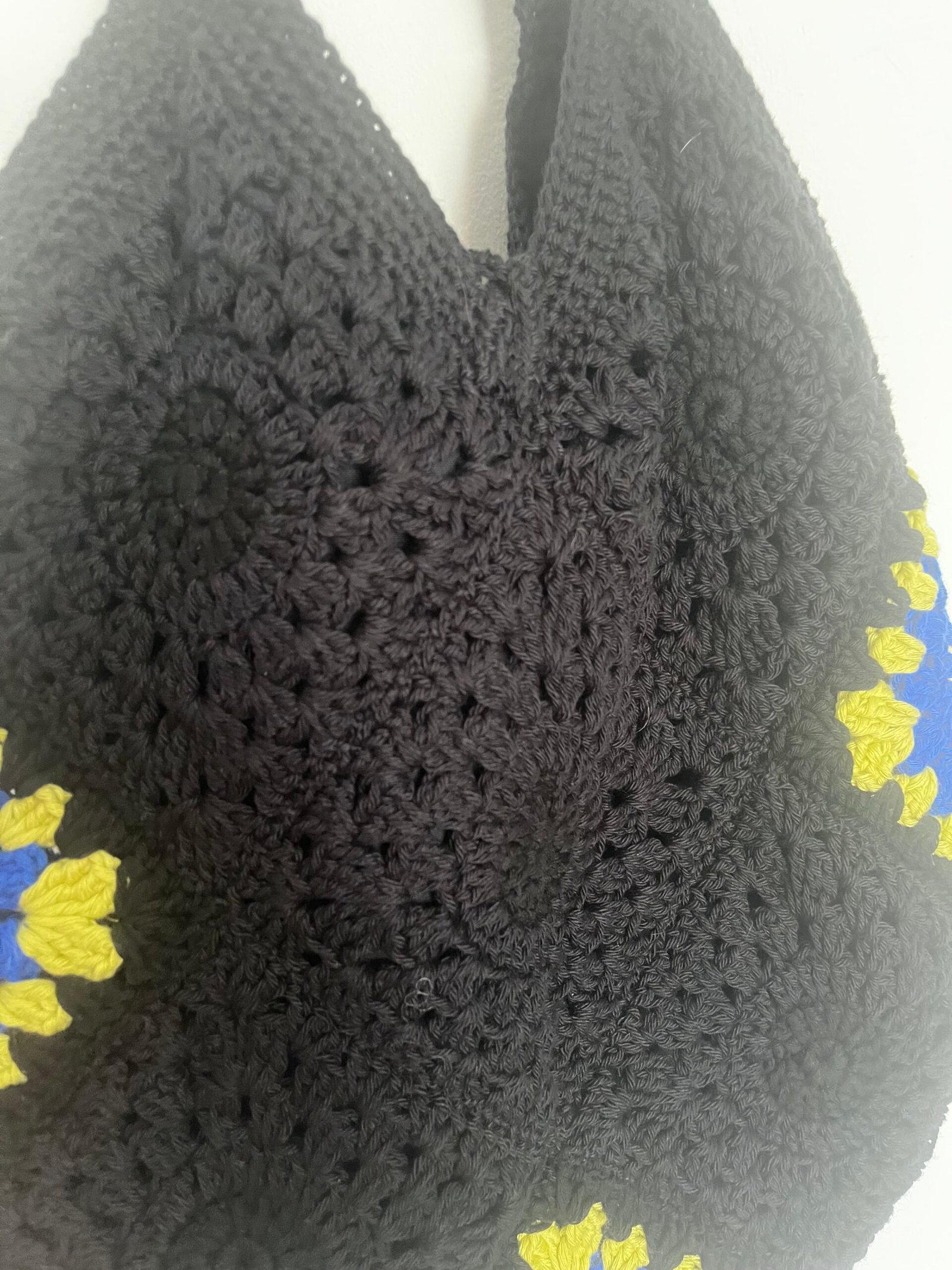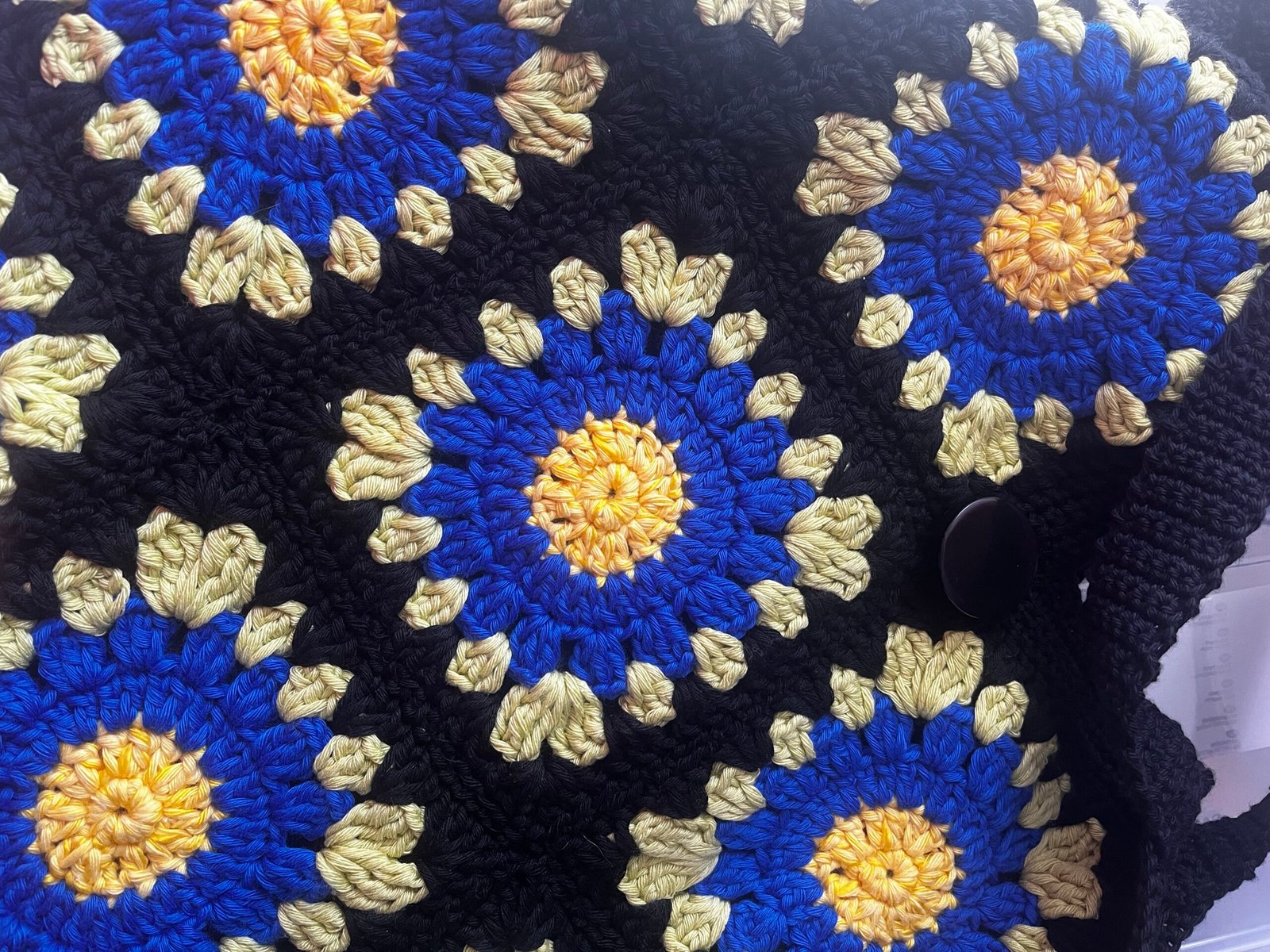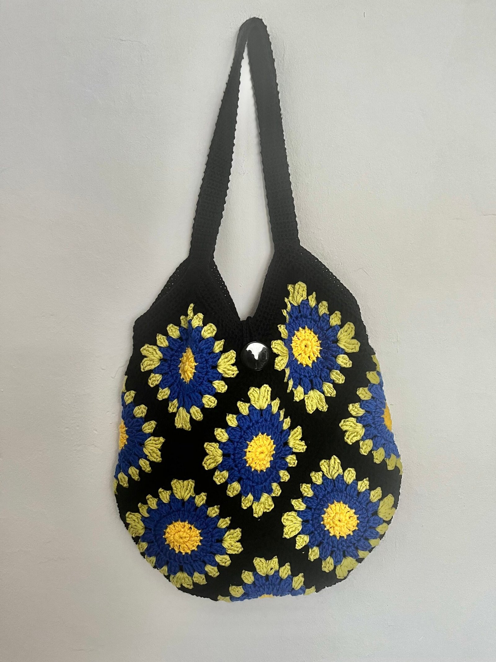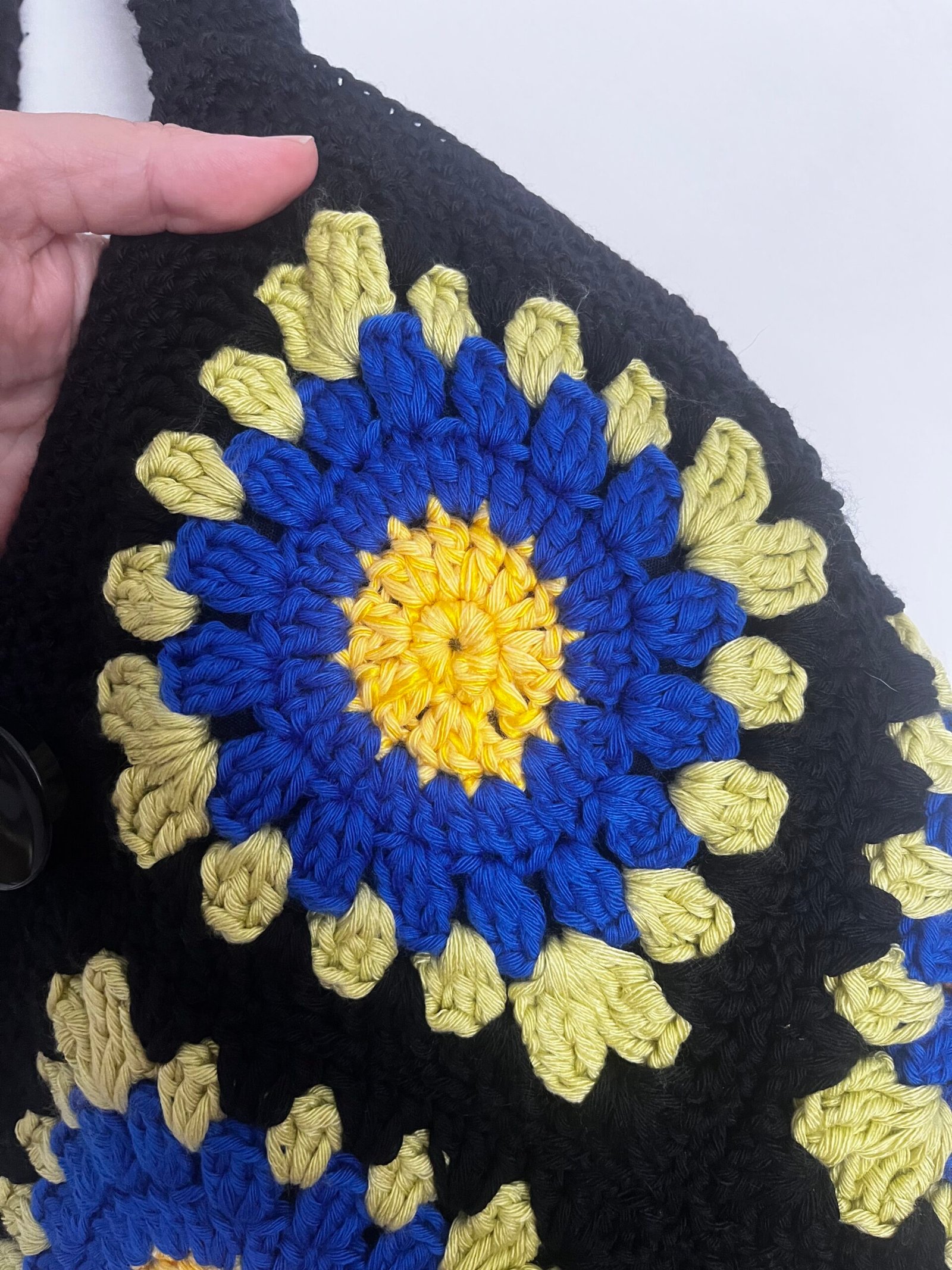 Bolso de aplicaciones, hecho a mano por mi madre, en negro, verde, amarillo y azul, con forro interior con diferentes compartimentos.
