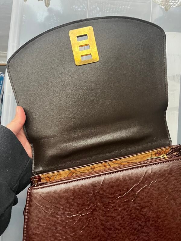 Bolso vintage de piel marrón chocolate, con cierre con tres opciones para poner en el que quieras.