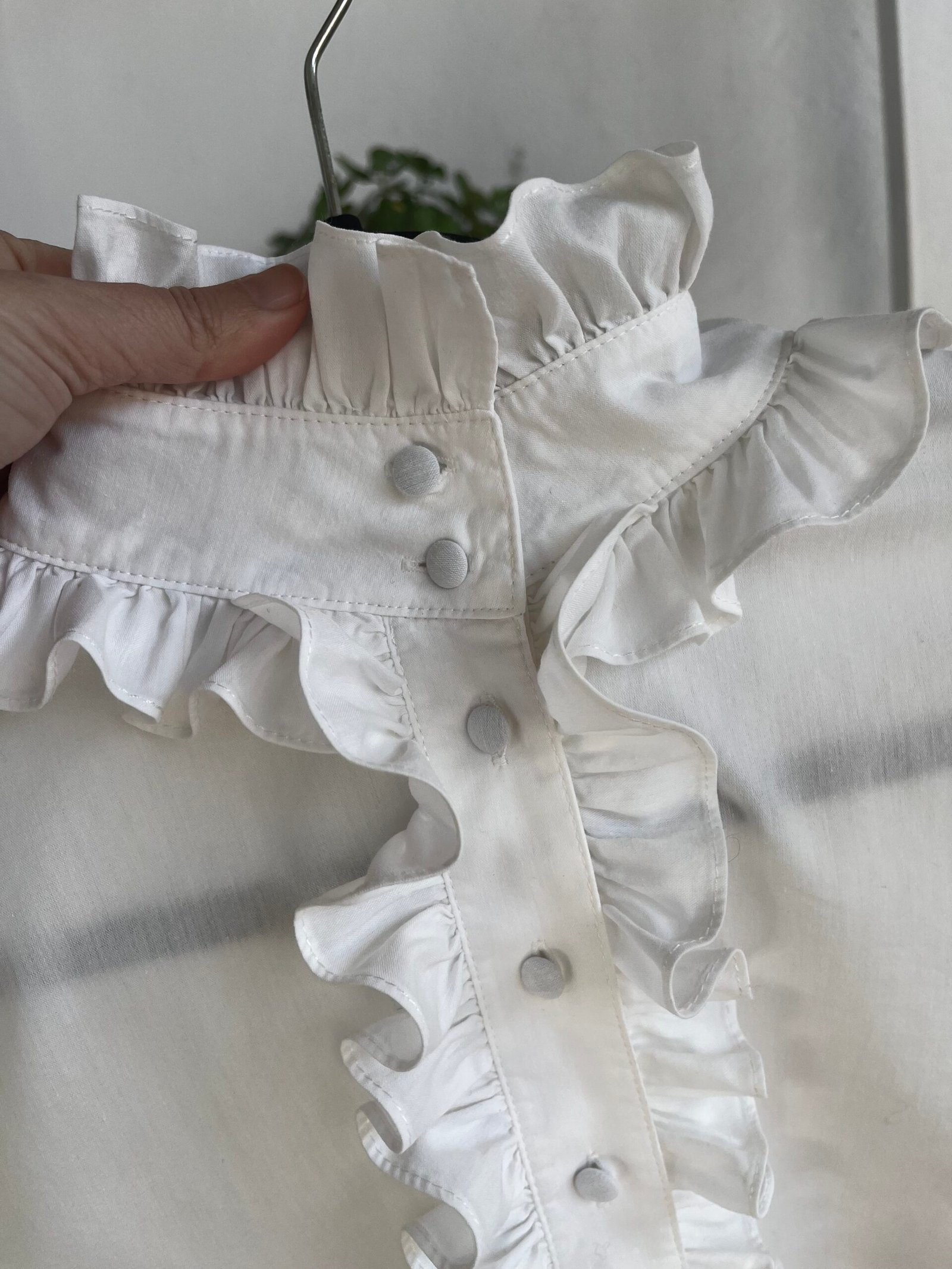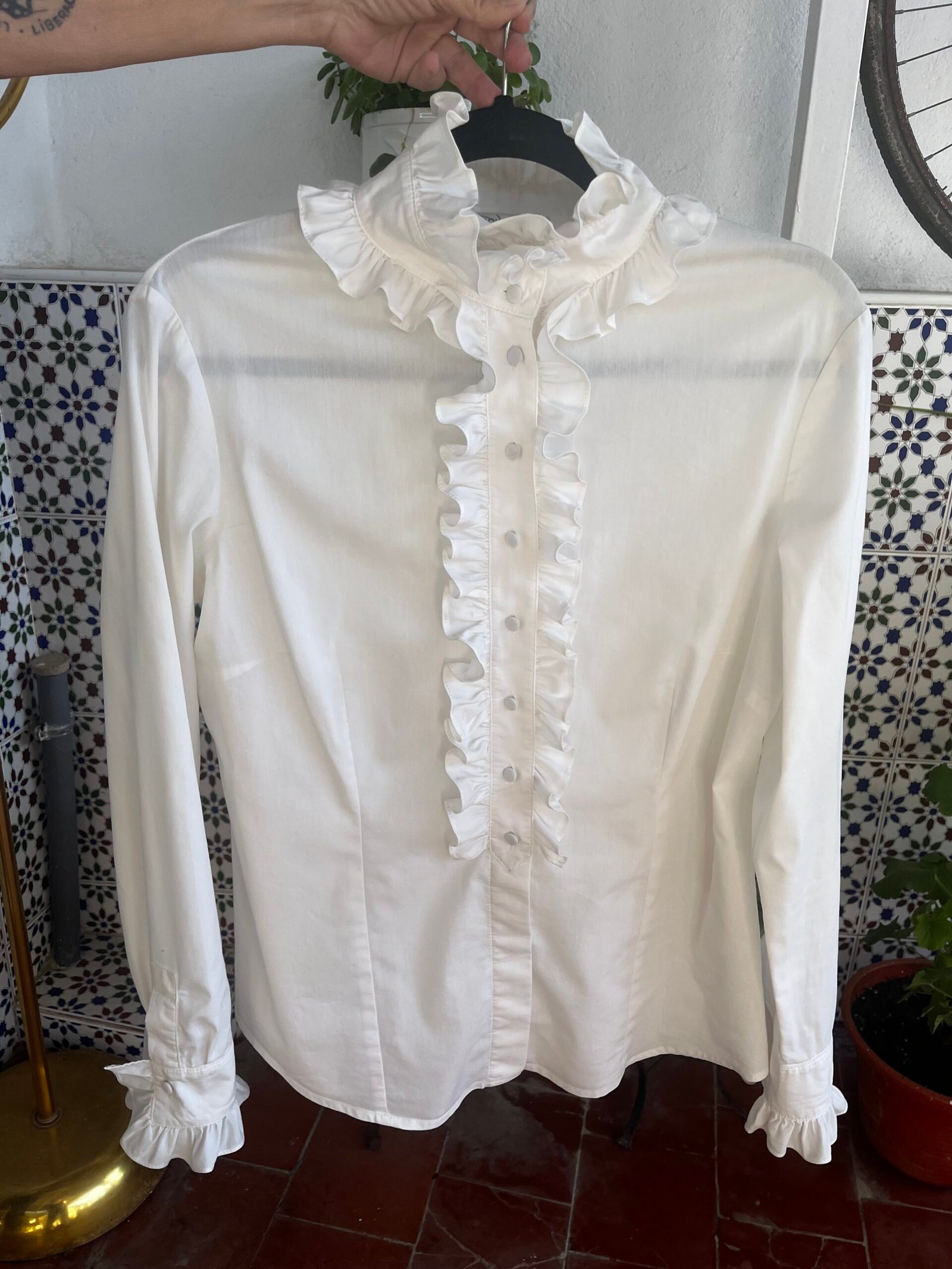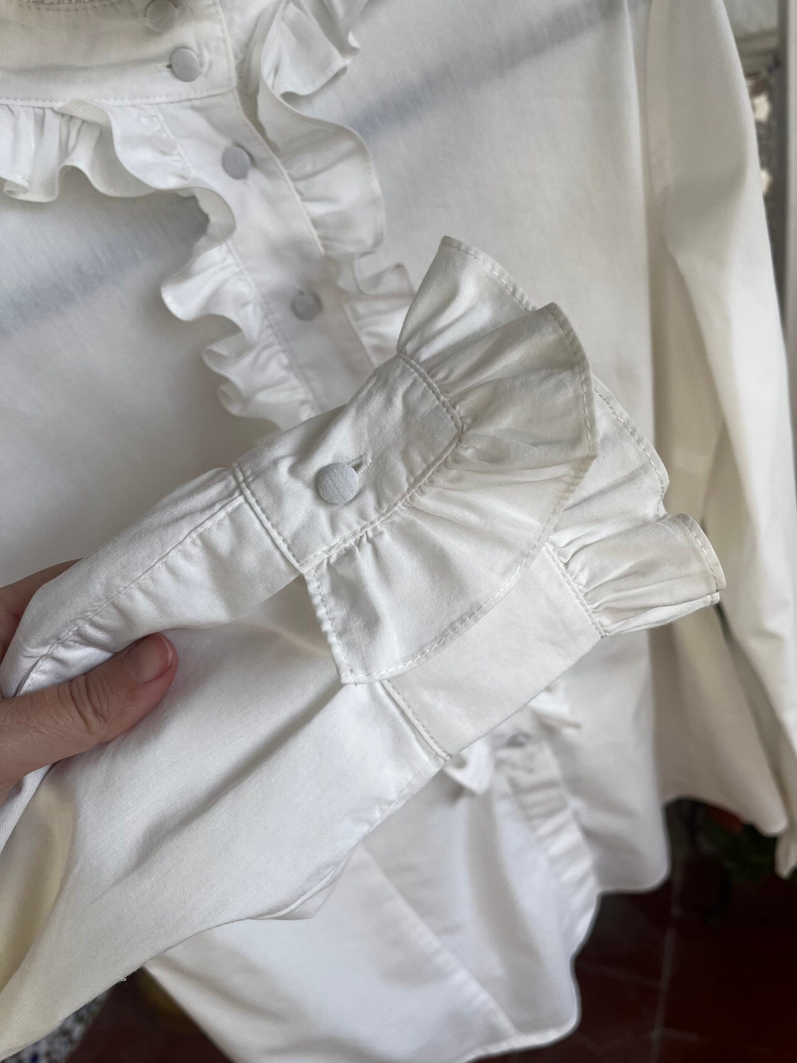 Camisa con volantes en cuello, línea de botonadura y puños. Botones forrados (los dos últimos botones ocultos)