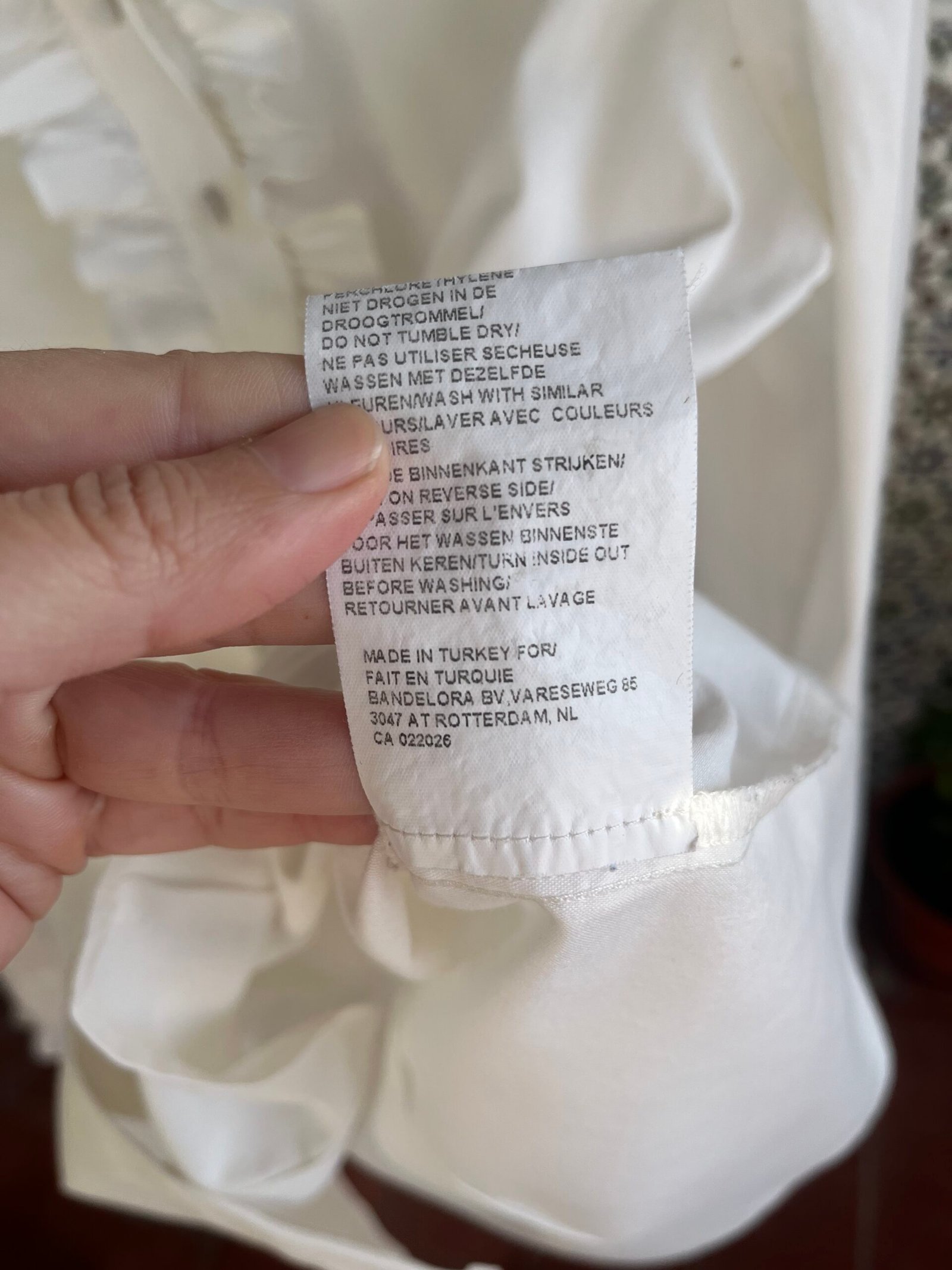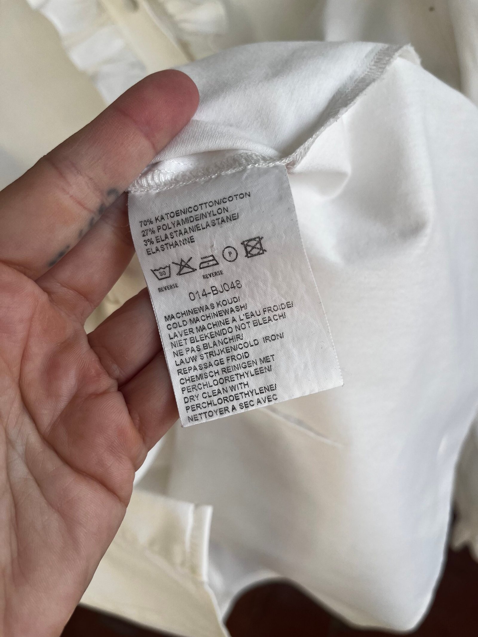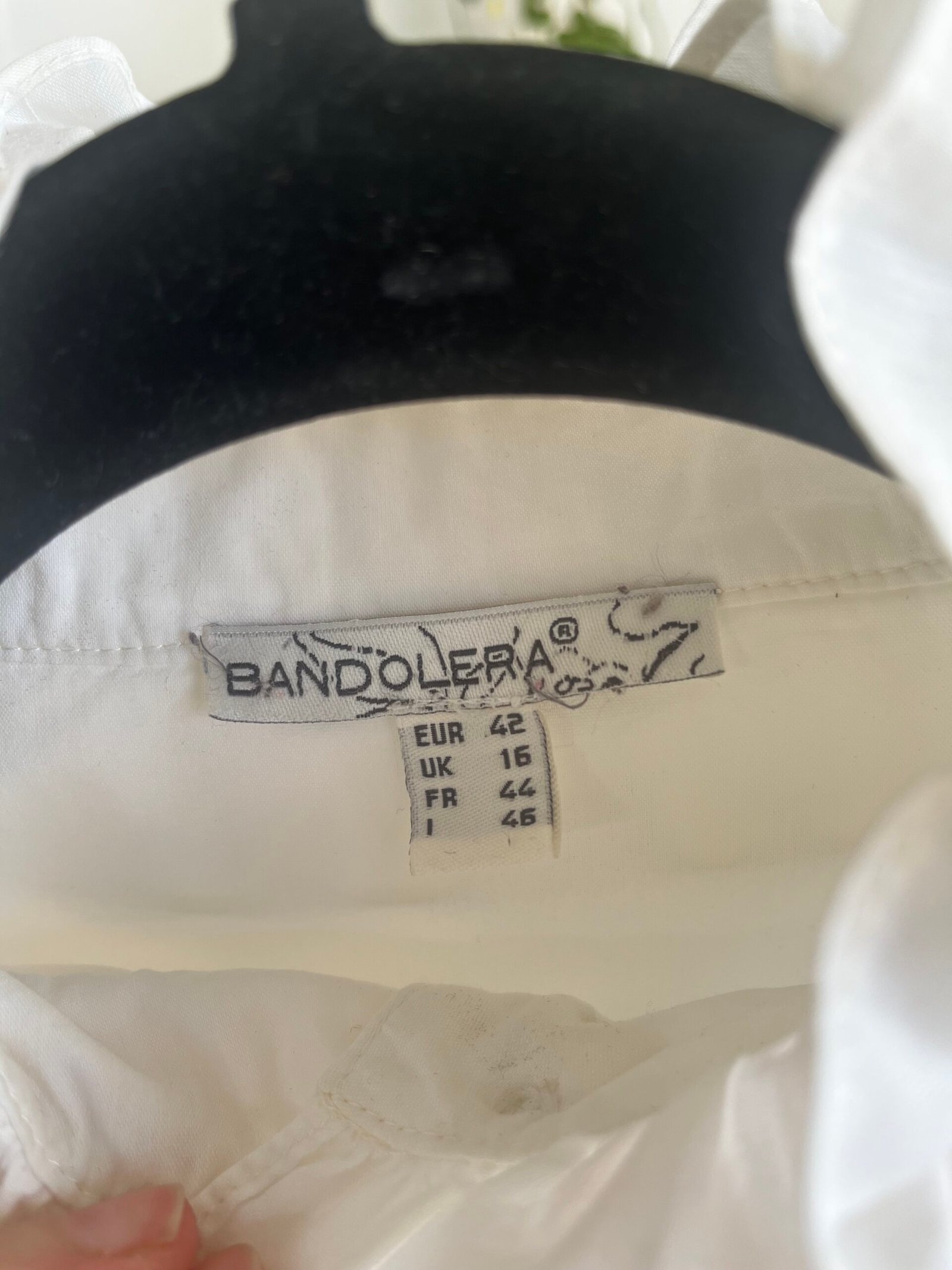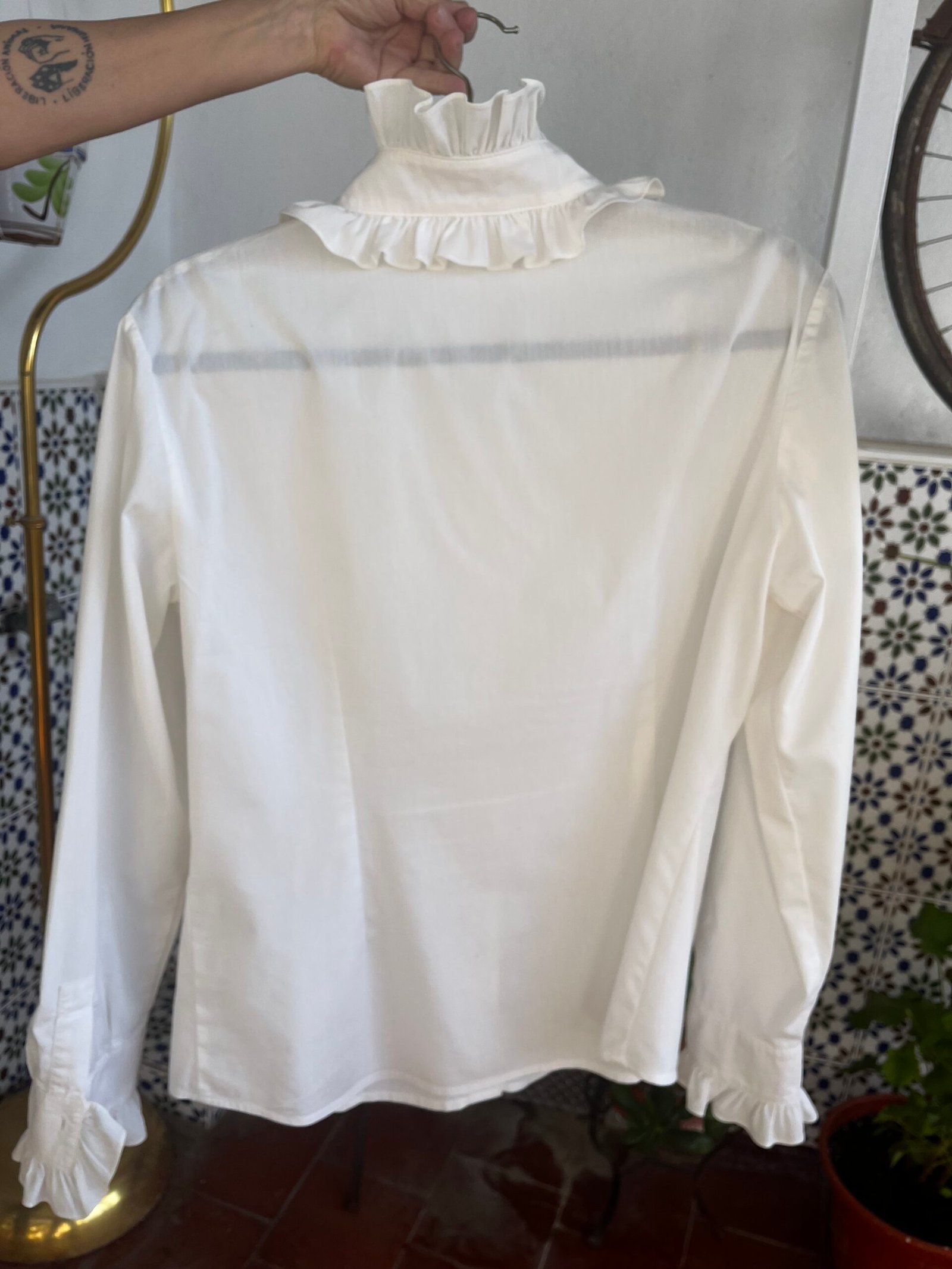 Camisa con volantes en cuello, línea de botonadura y puños. Botones forrados (los dos últimos botones ocultos)