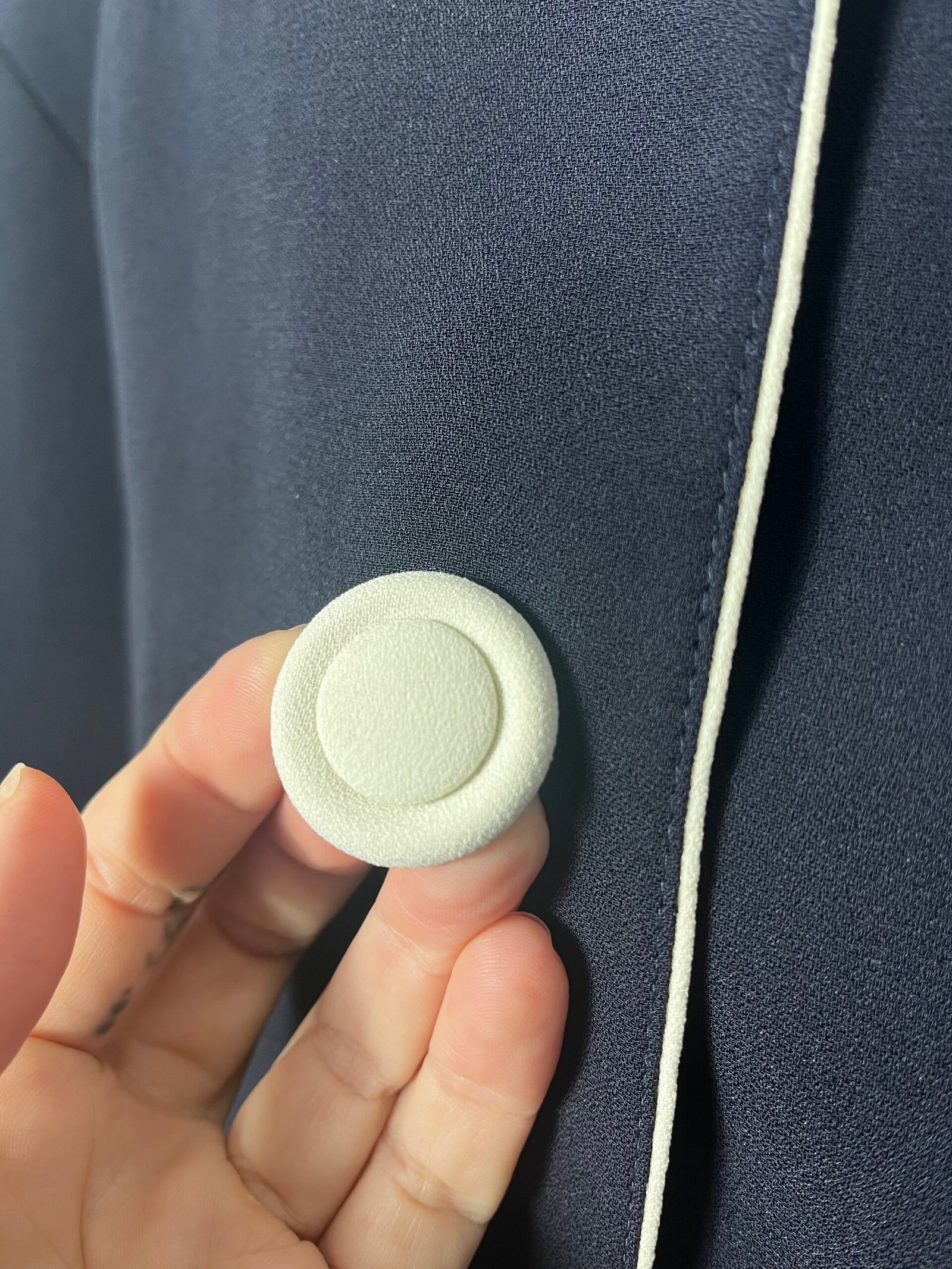 Chaqueta de mujer, azul marino con vivos blancos, botones forrados en blanco, original corte de cuello y bordado.