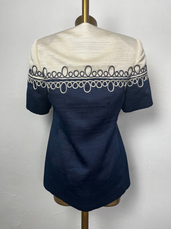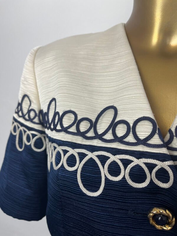 Chaqueta de manga corta, en tejido tipo seda con textura, en ezul y blanco roto, con decoraciones.