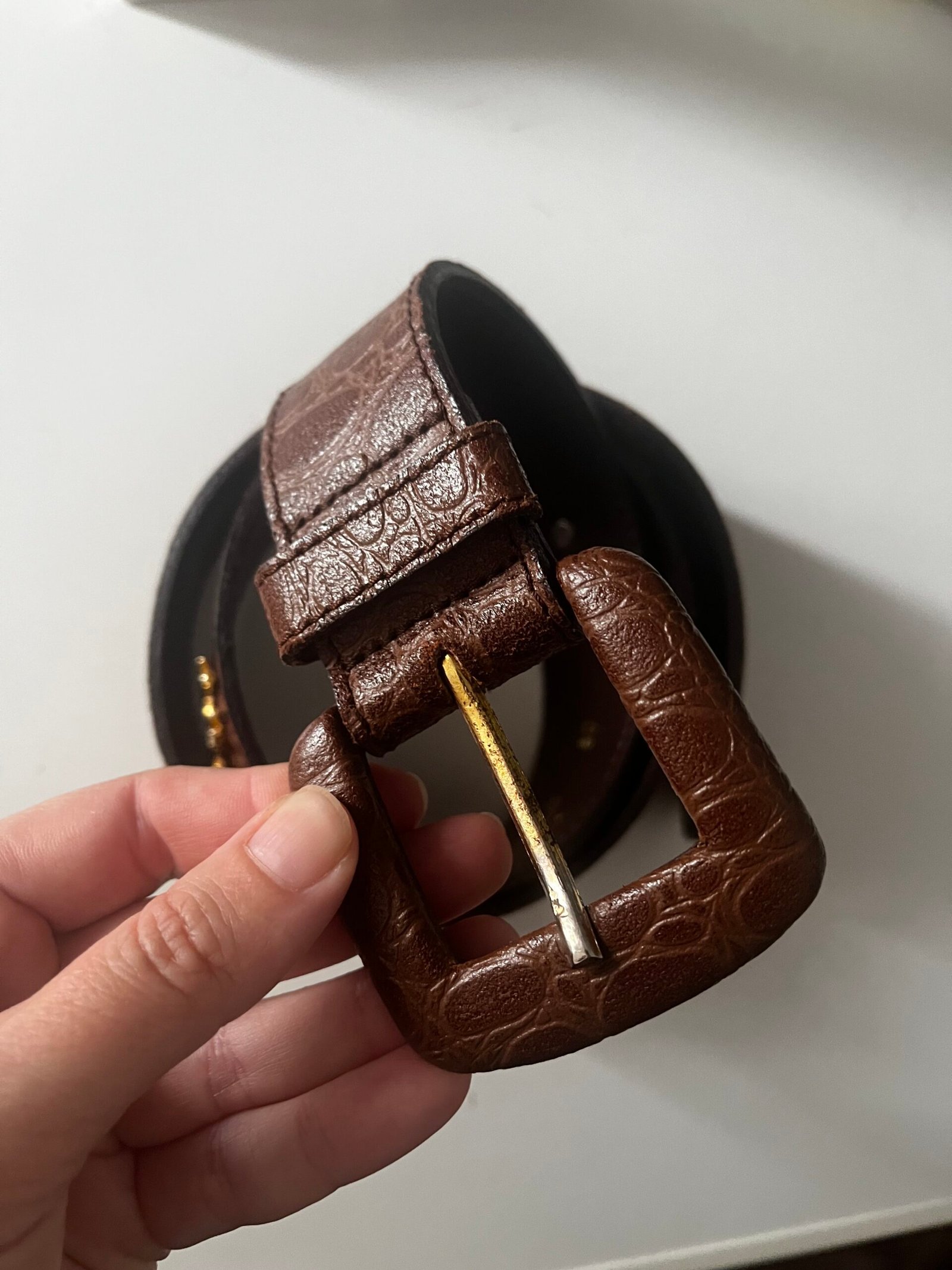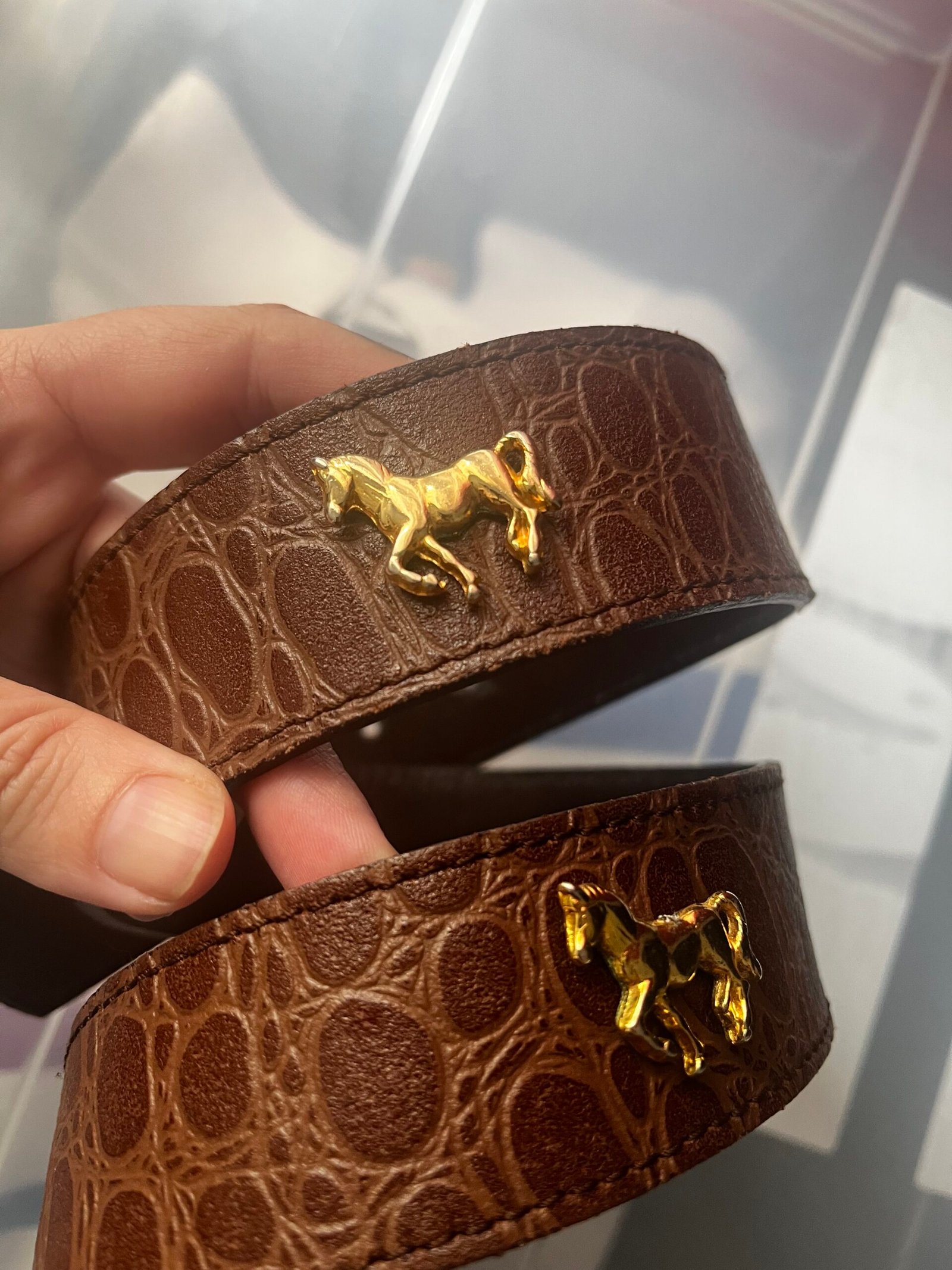 Cinturón vintage de piel marrón con textura y caballos dorados. De Christian Lay años 90´s