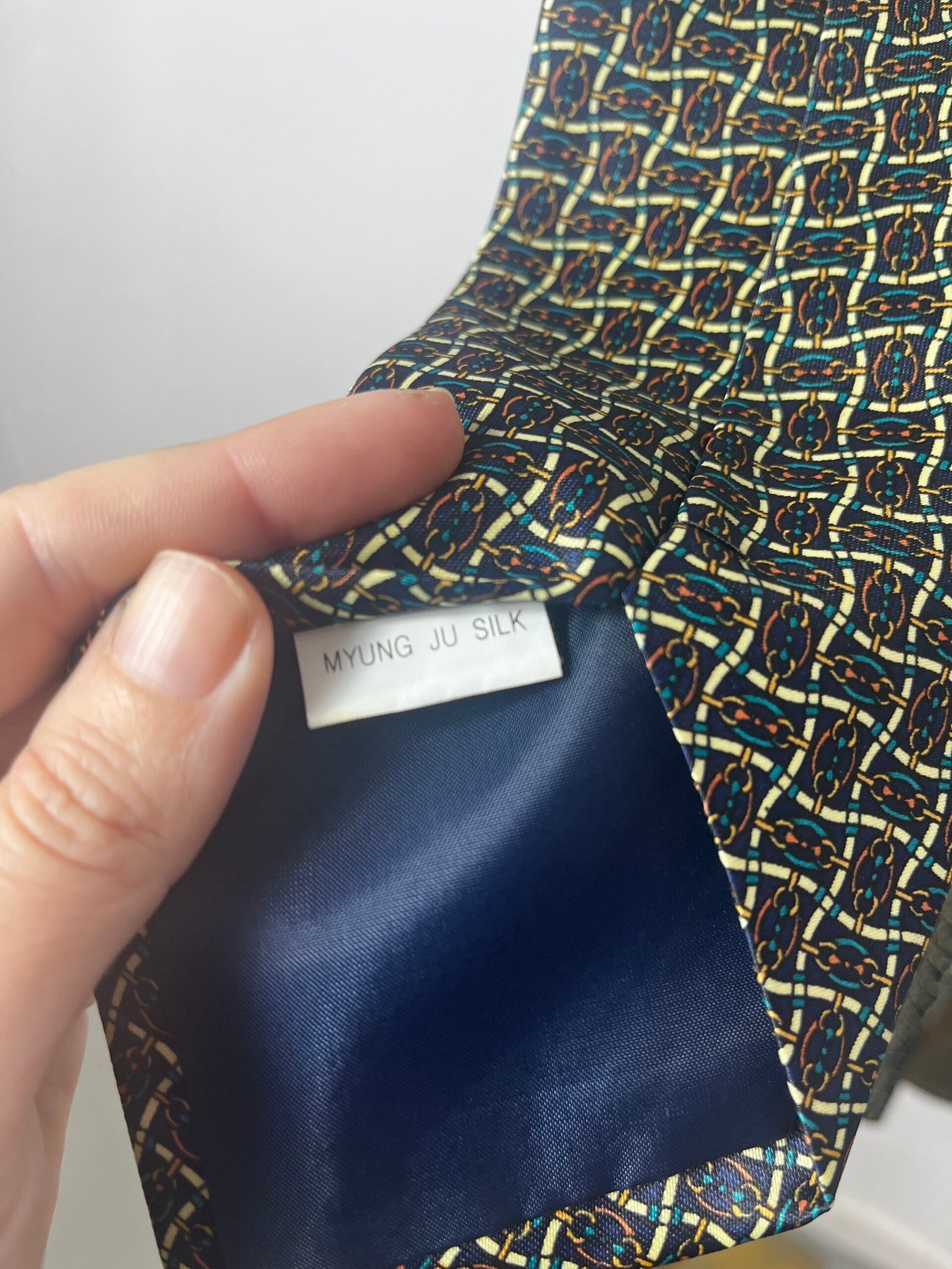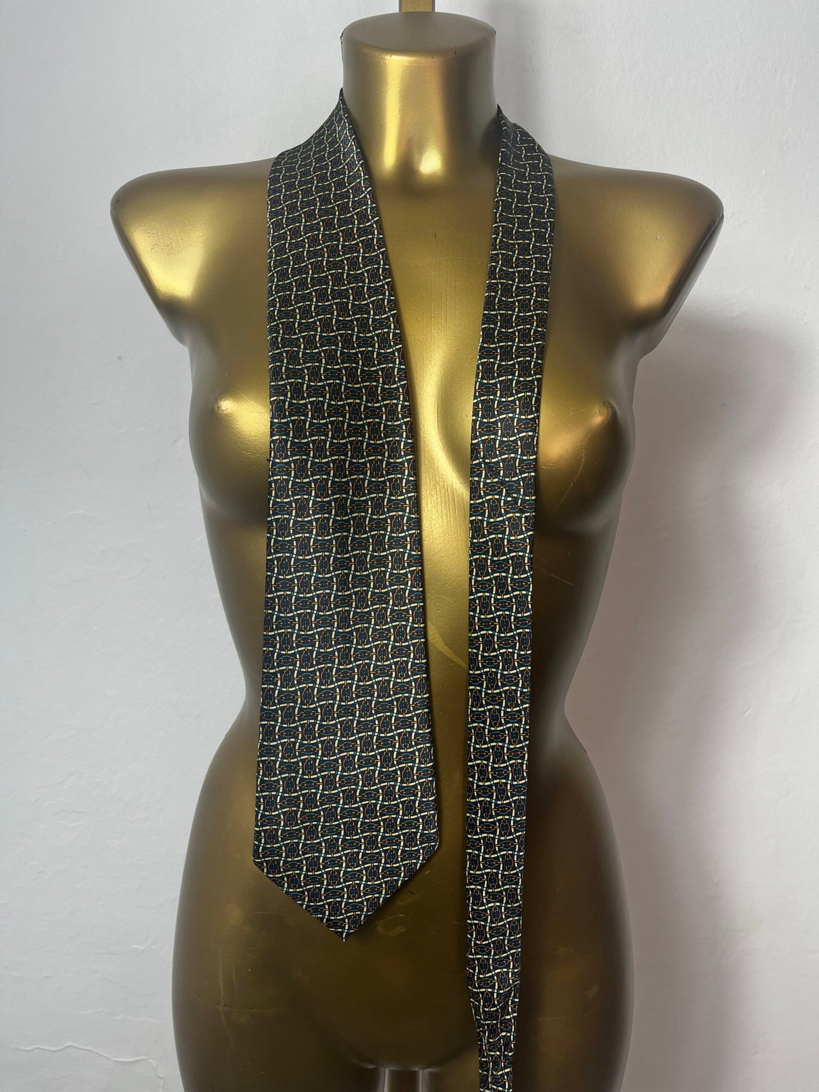 Corbata vintage de seda con estampado como de cadenas haciendo geometría.