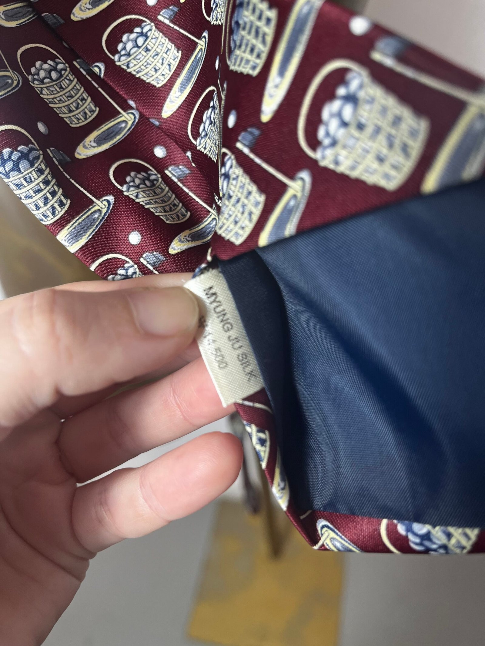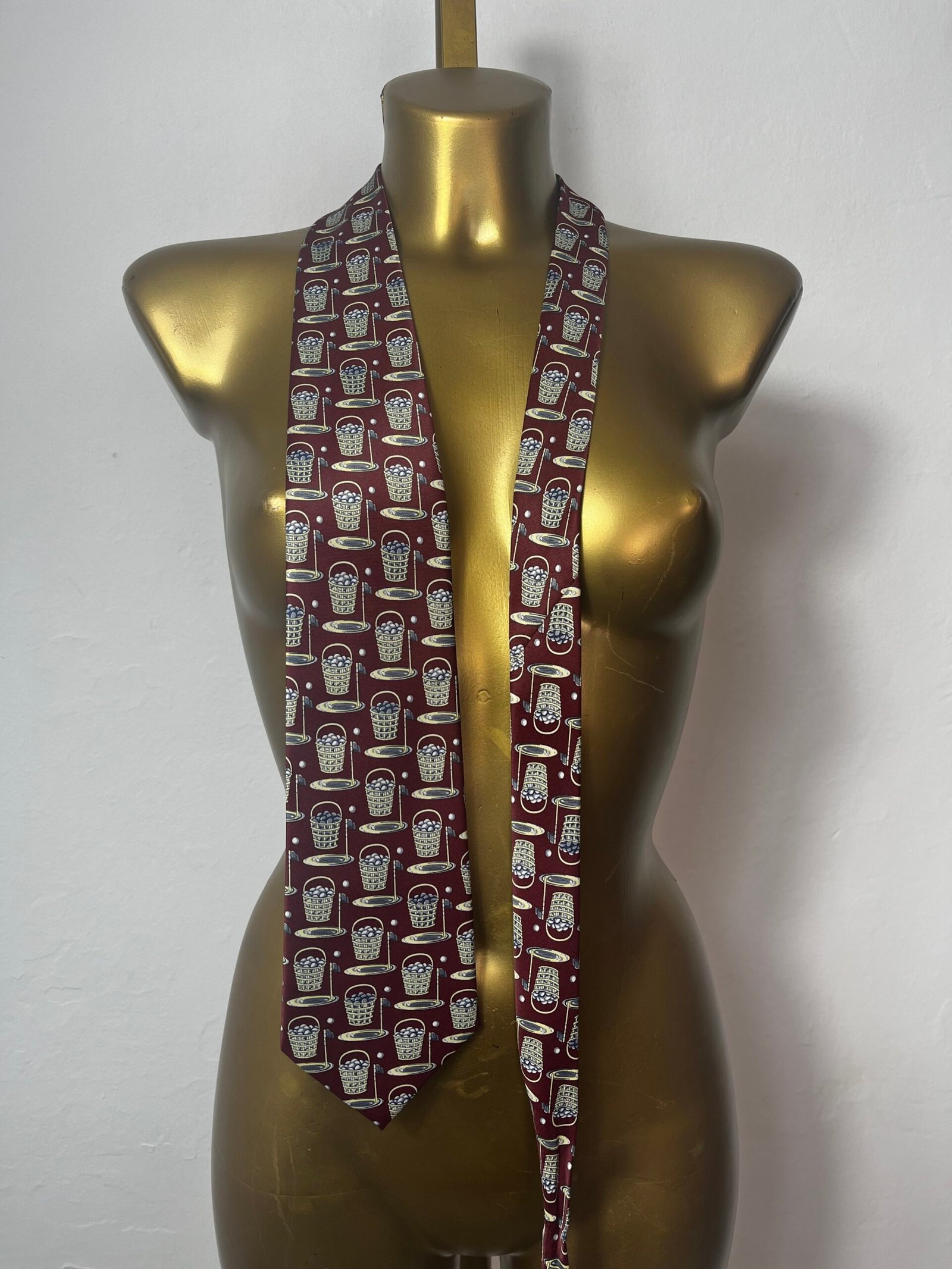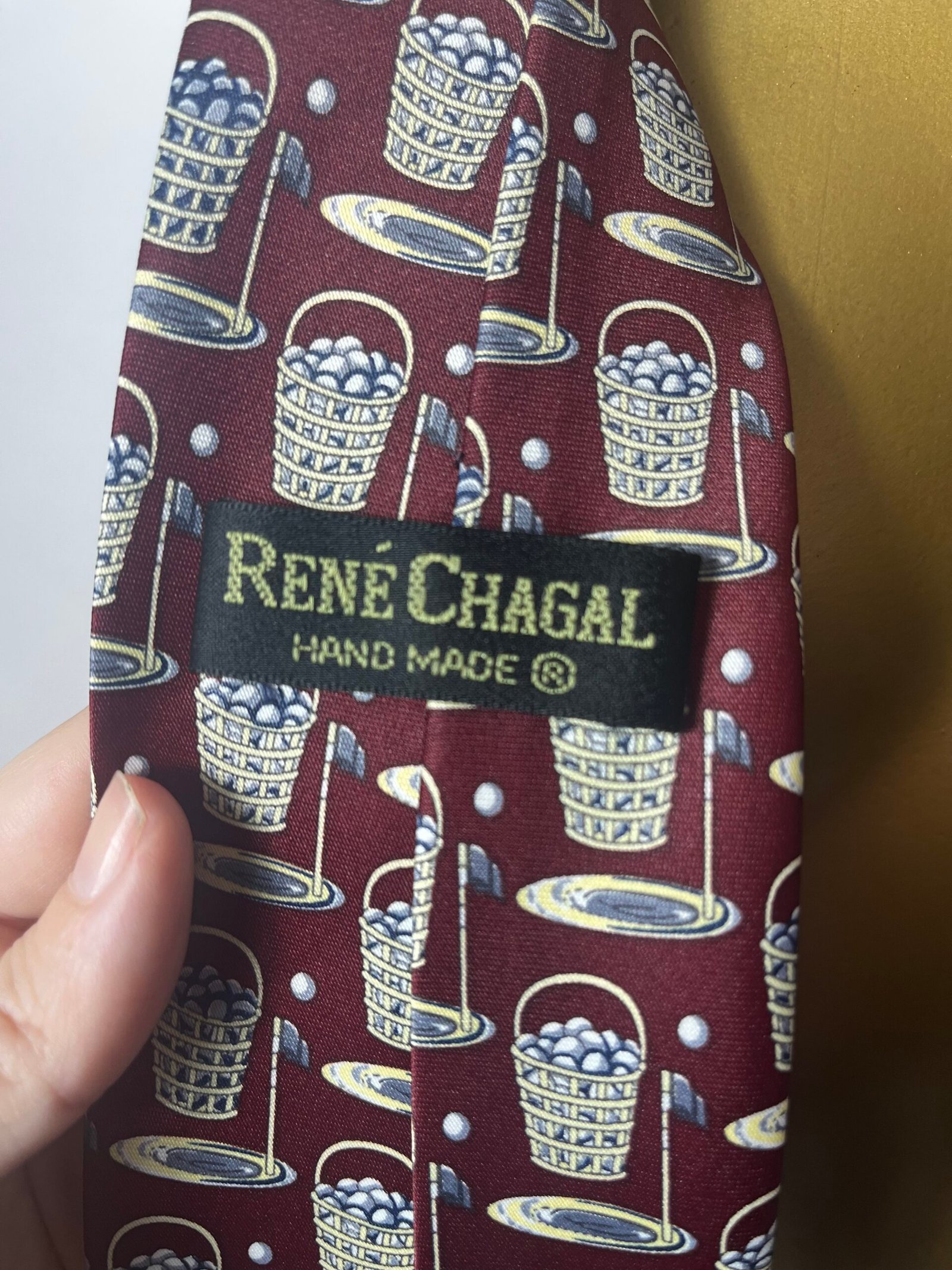 Corbata vintage de seda, de la marca René Chagal, hecha a mano, con estampado de cesta de pelotas de golf y fondo burdeos.