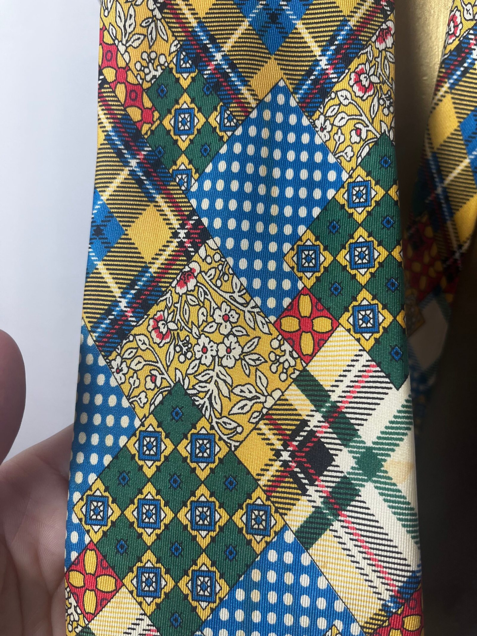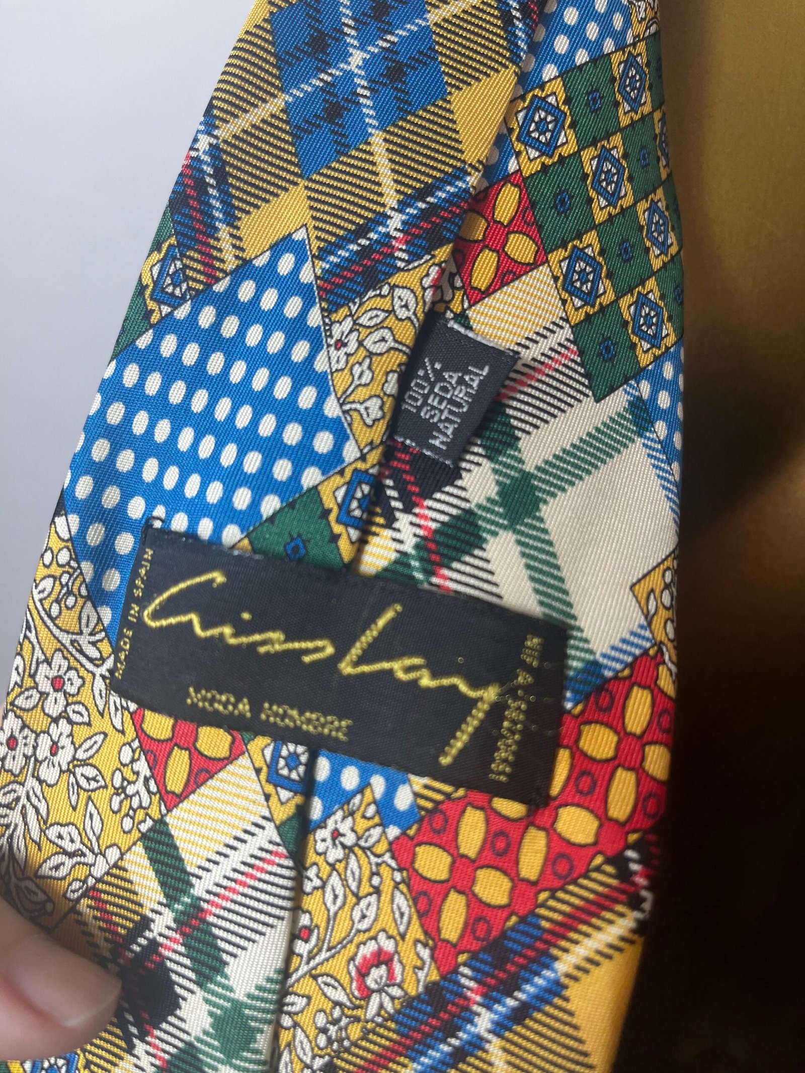Corbata vintage con estampado como de pachwork de diferentes tipos de cuadros, de Cristian Lay, 100% seda natural.