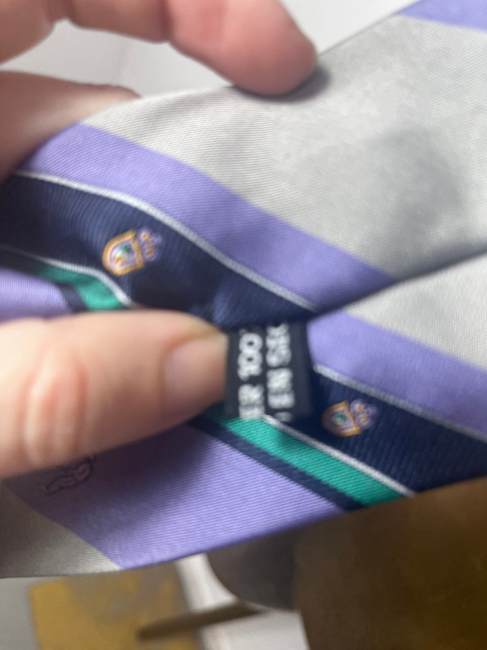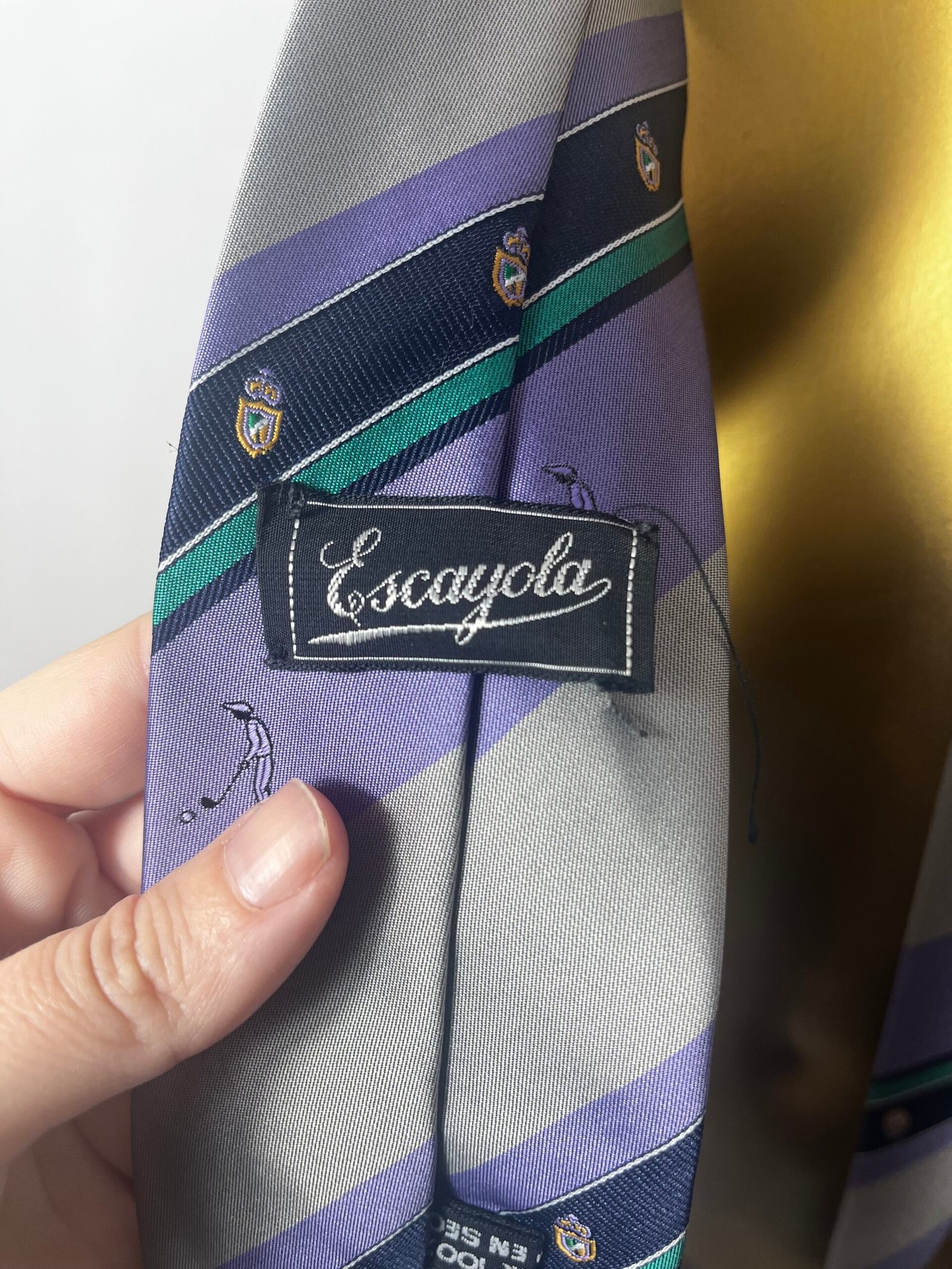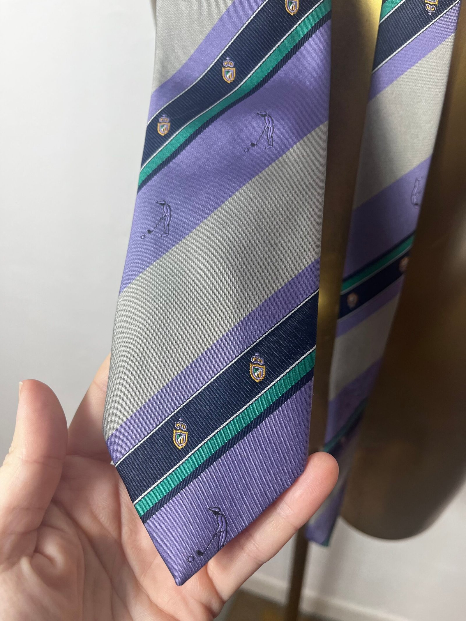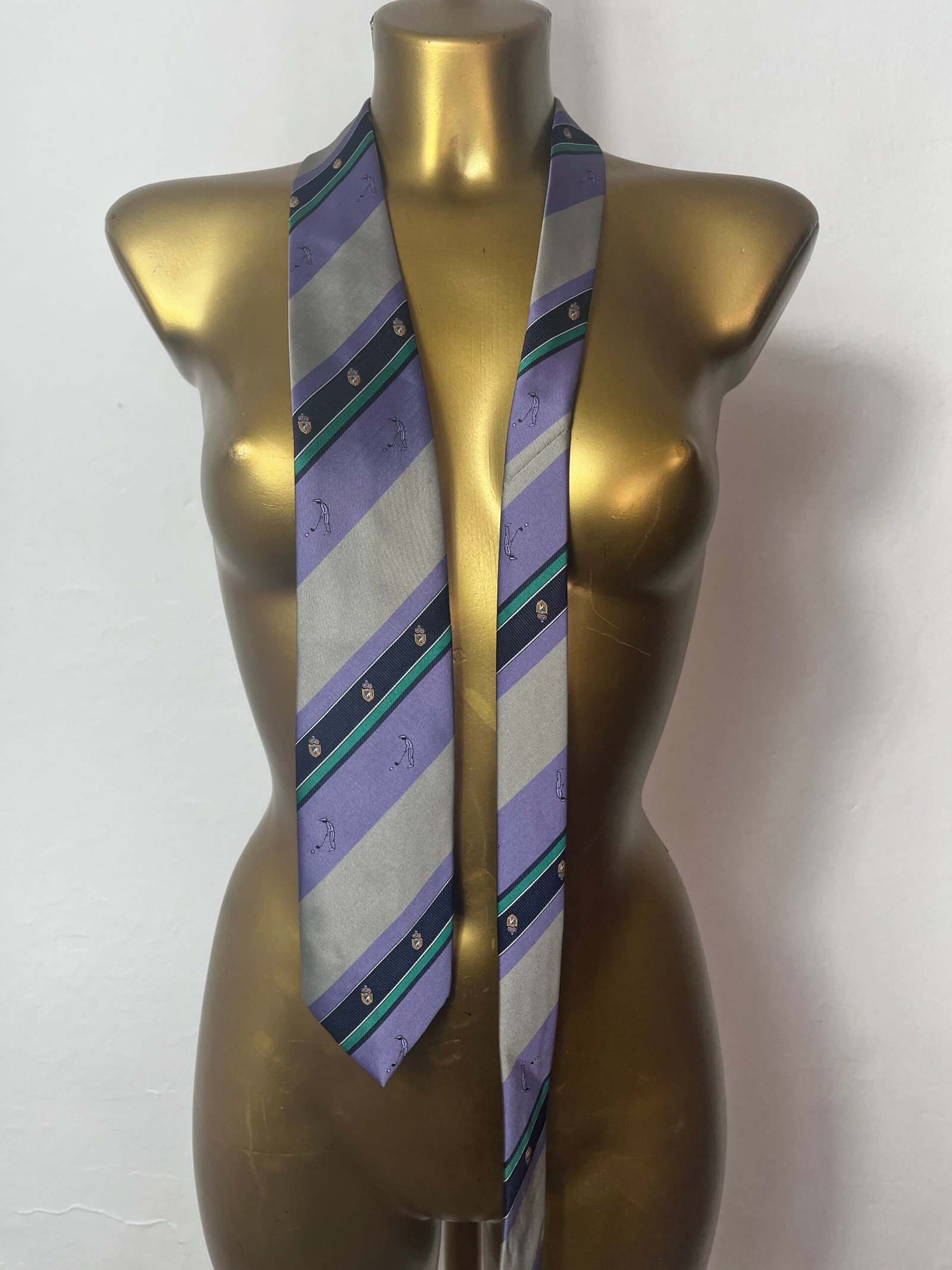 Corbata de poliéster,  vintage, años 80´s, en lila, gris con rayas, escudos y pequeños muñecos de jugadores de golf.