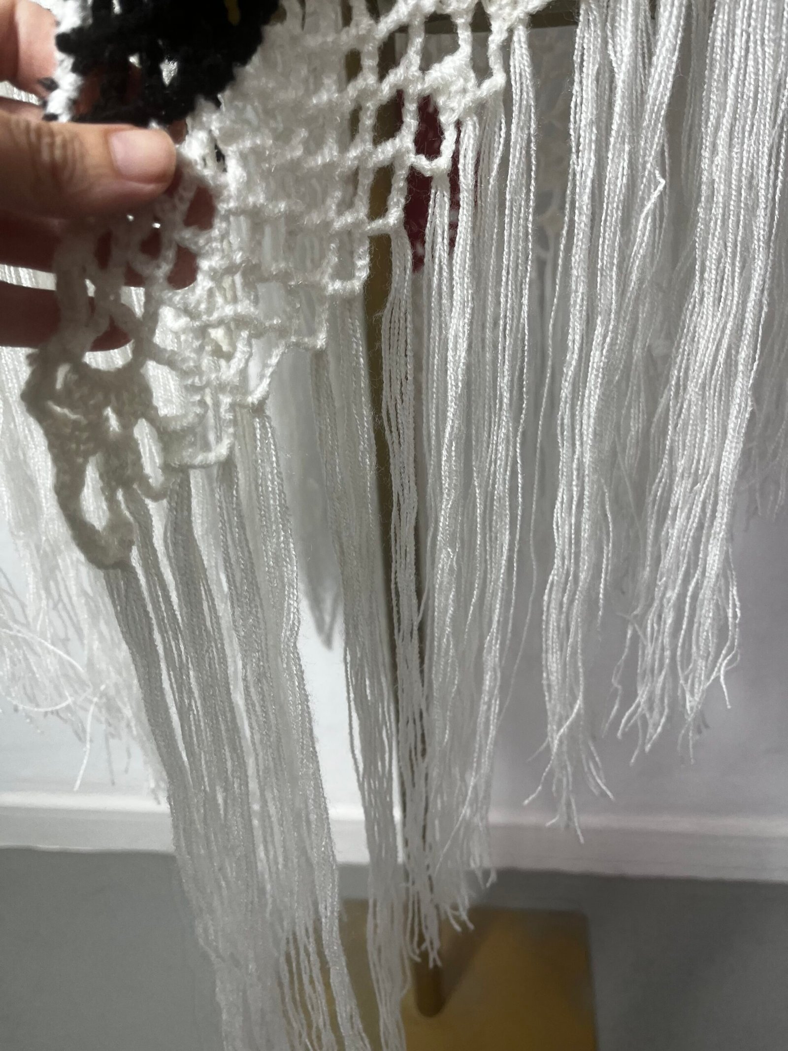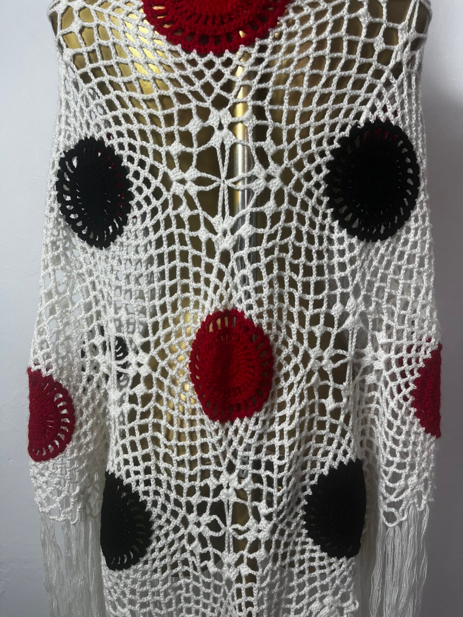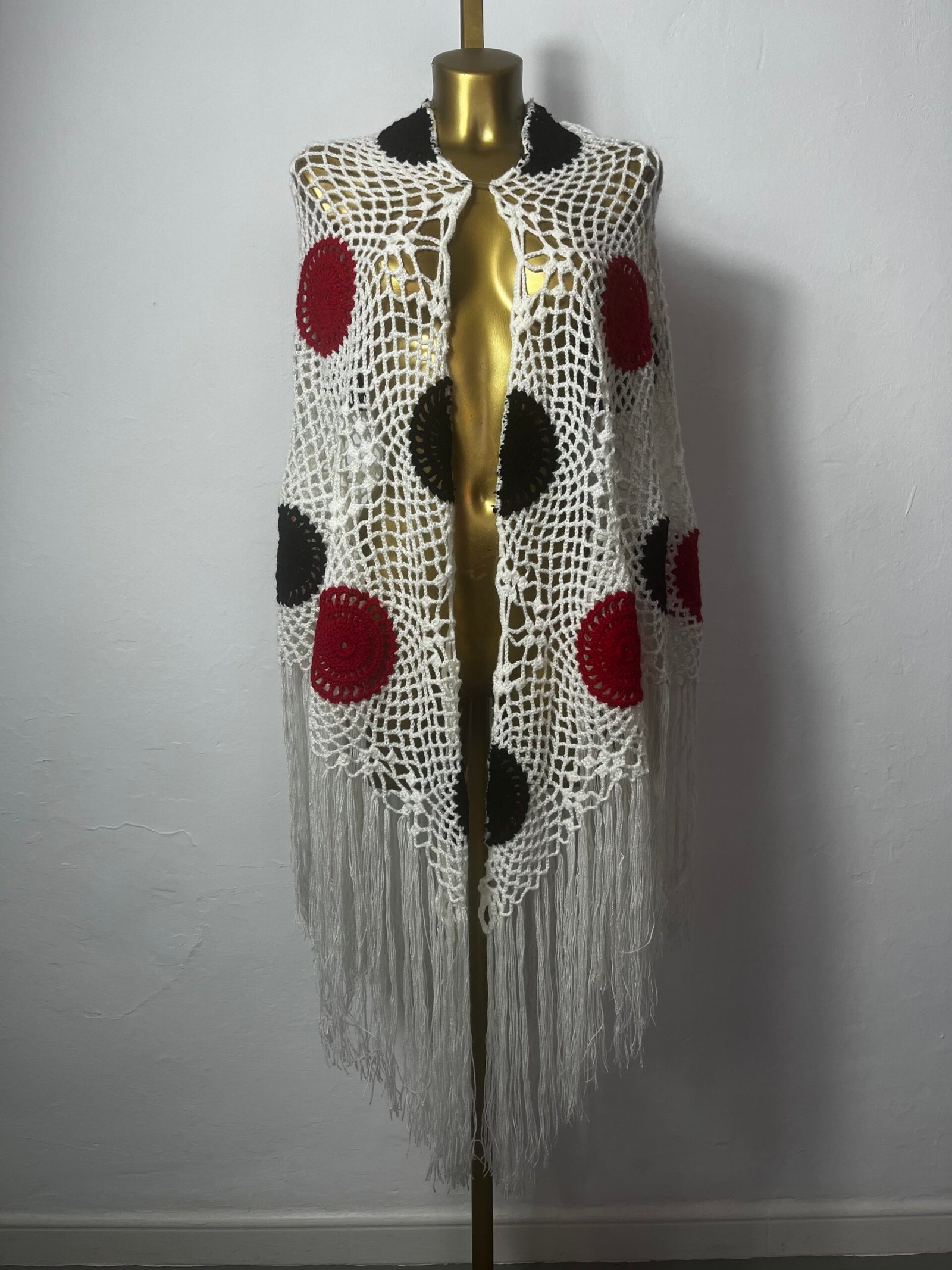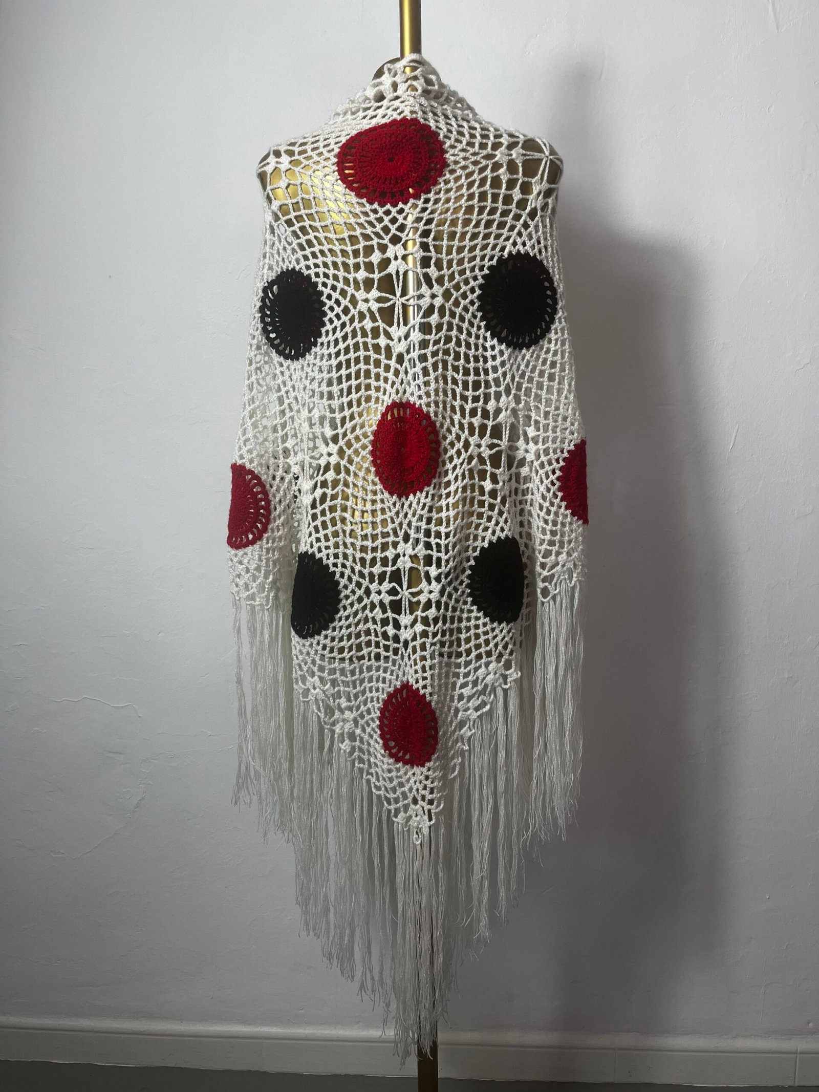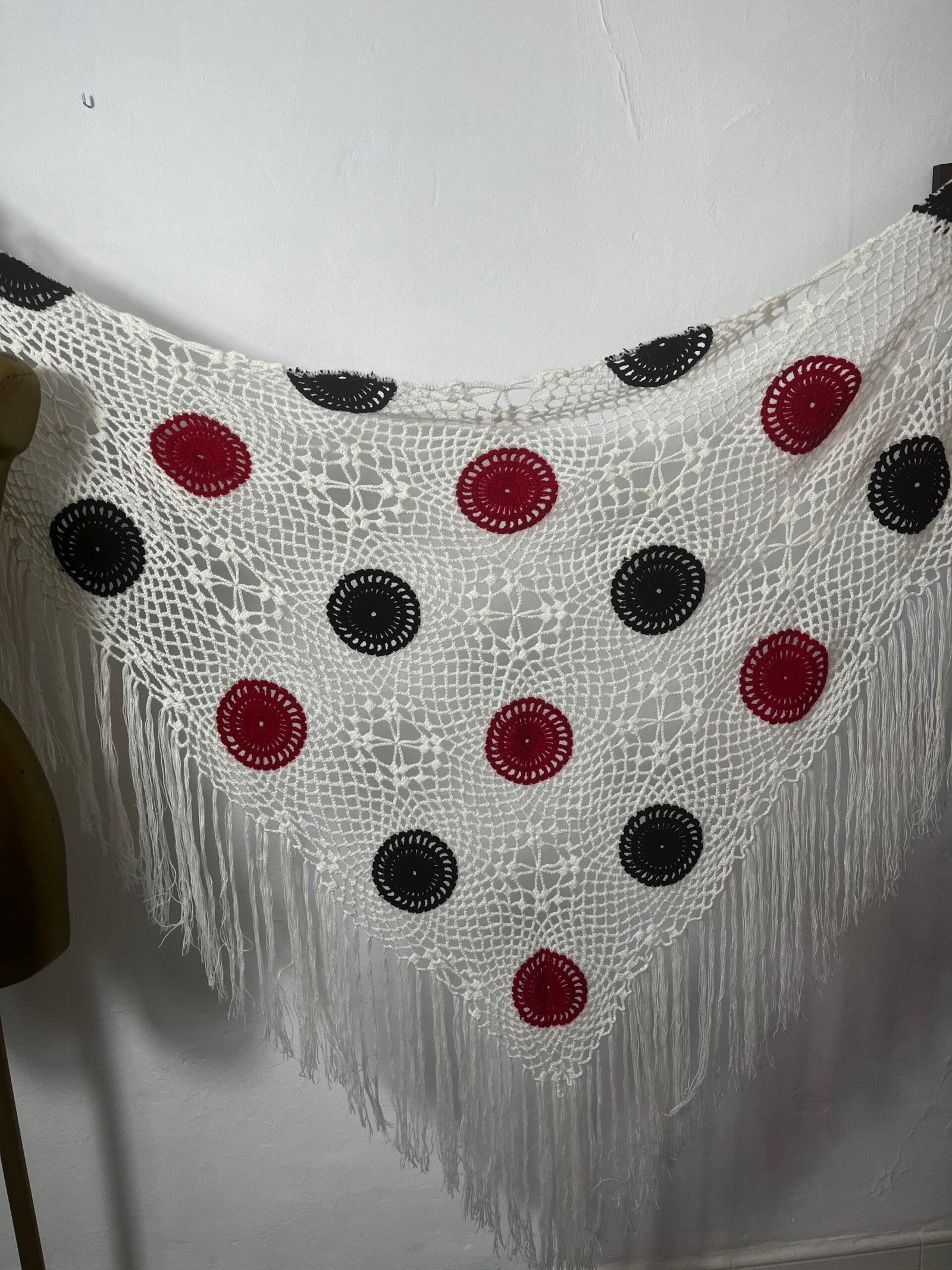 Mantón vintage, hecho a mano, con aplicaciones circulares en negras y rojas, unidas a ganchillo en blanco. Flecos largos.