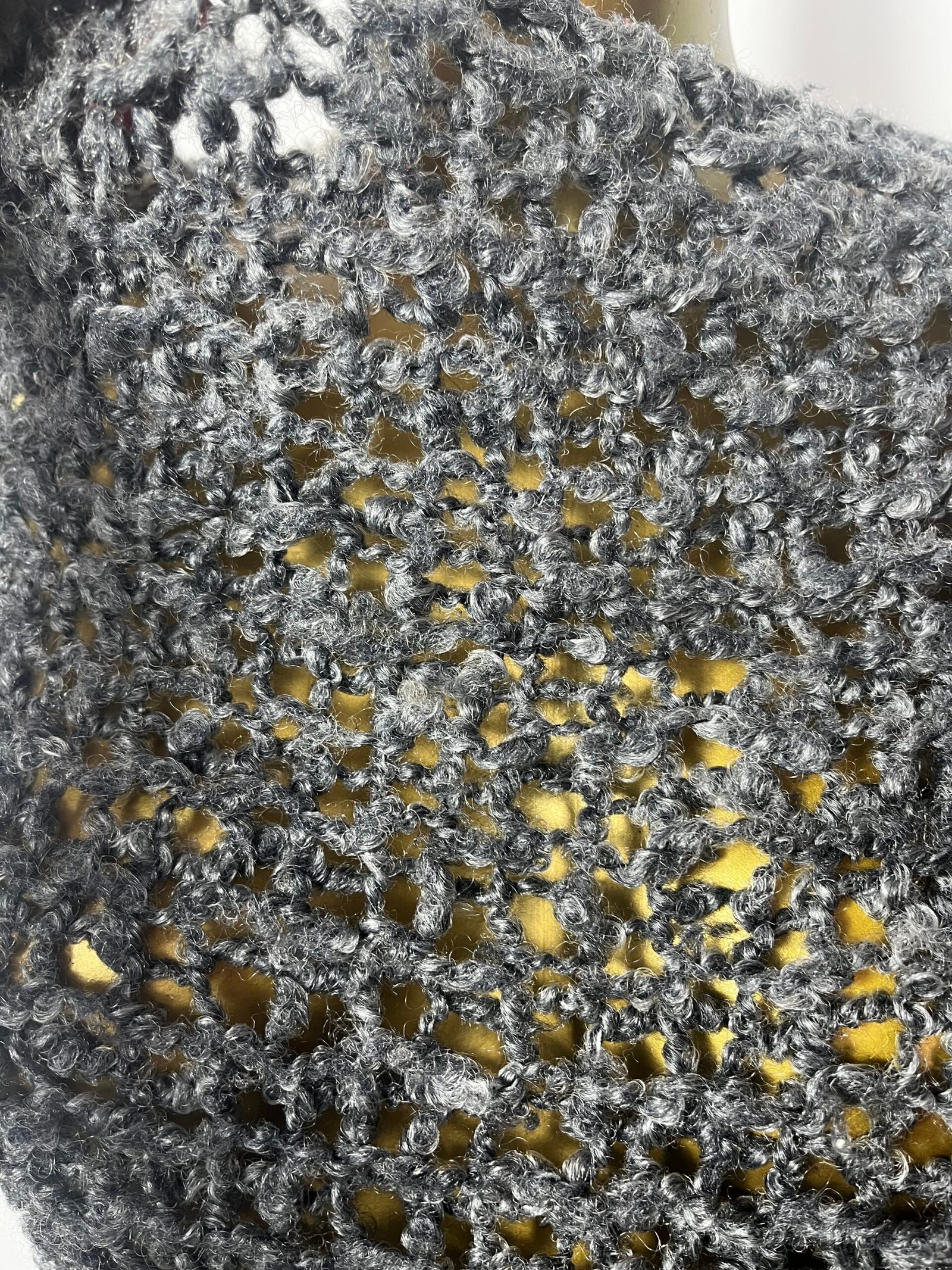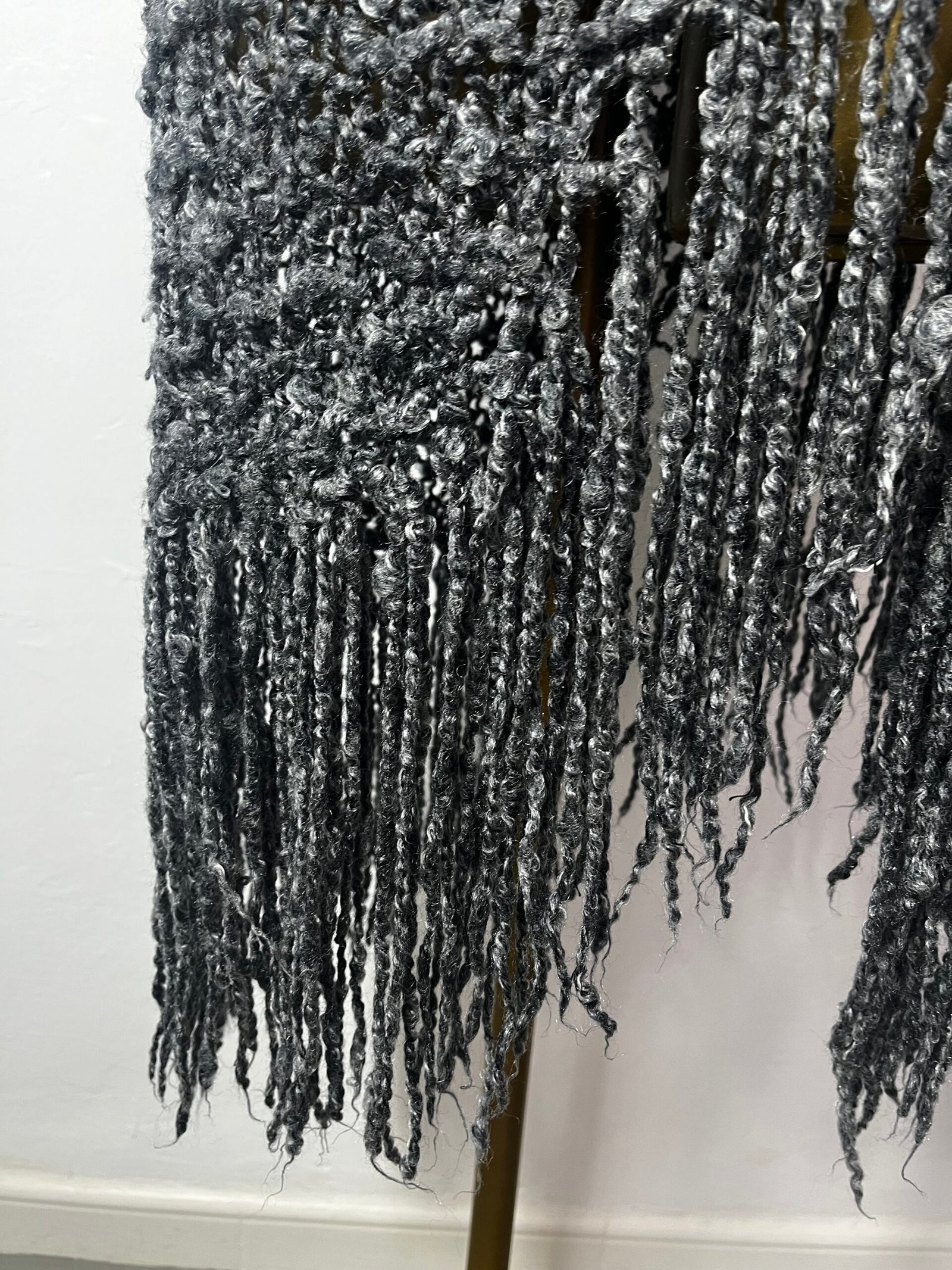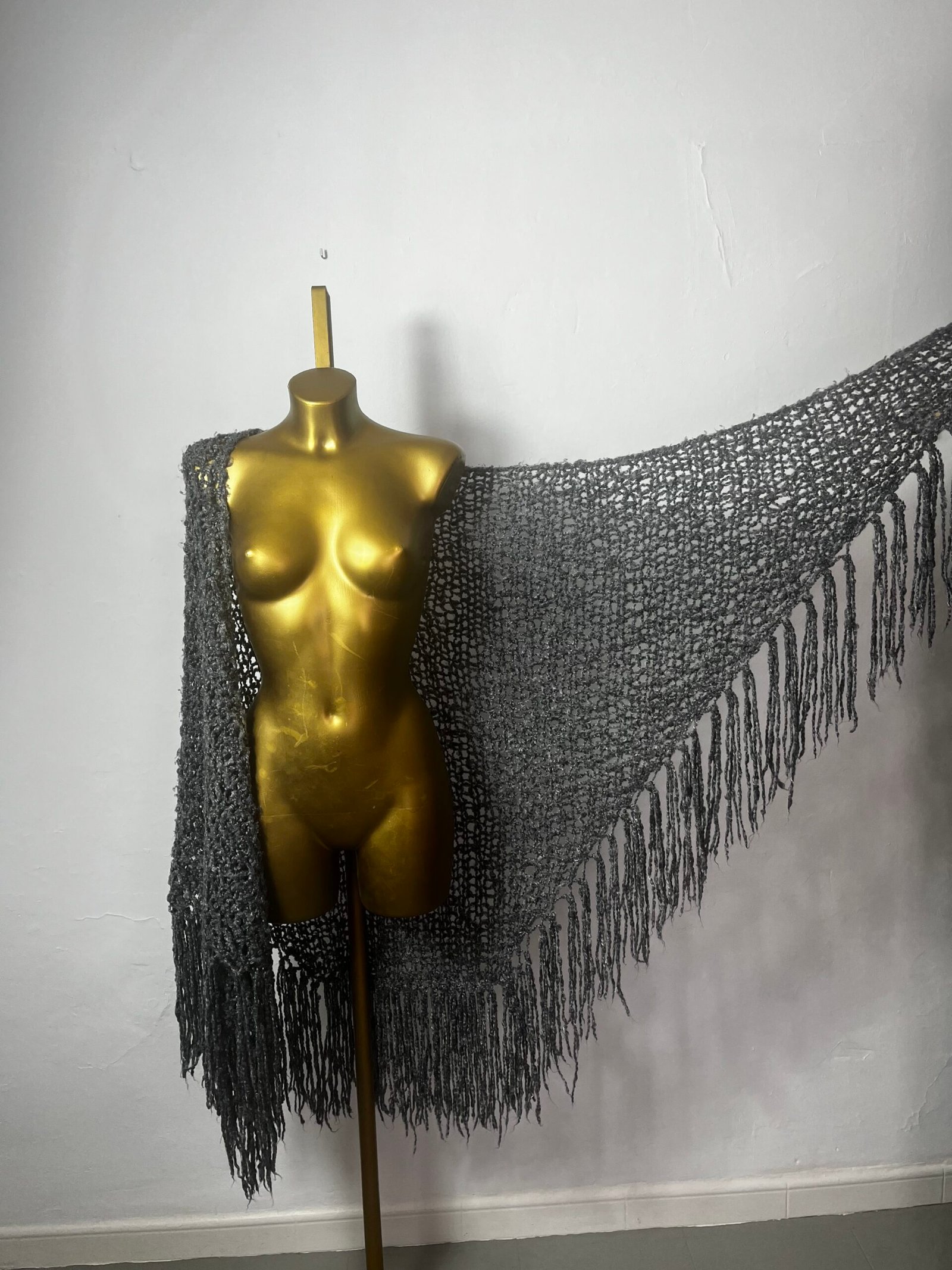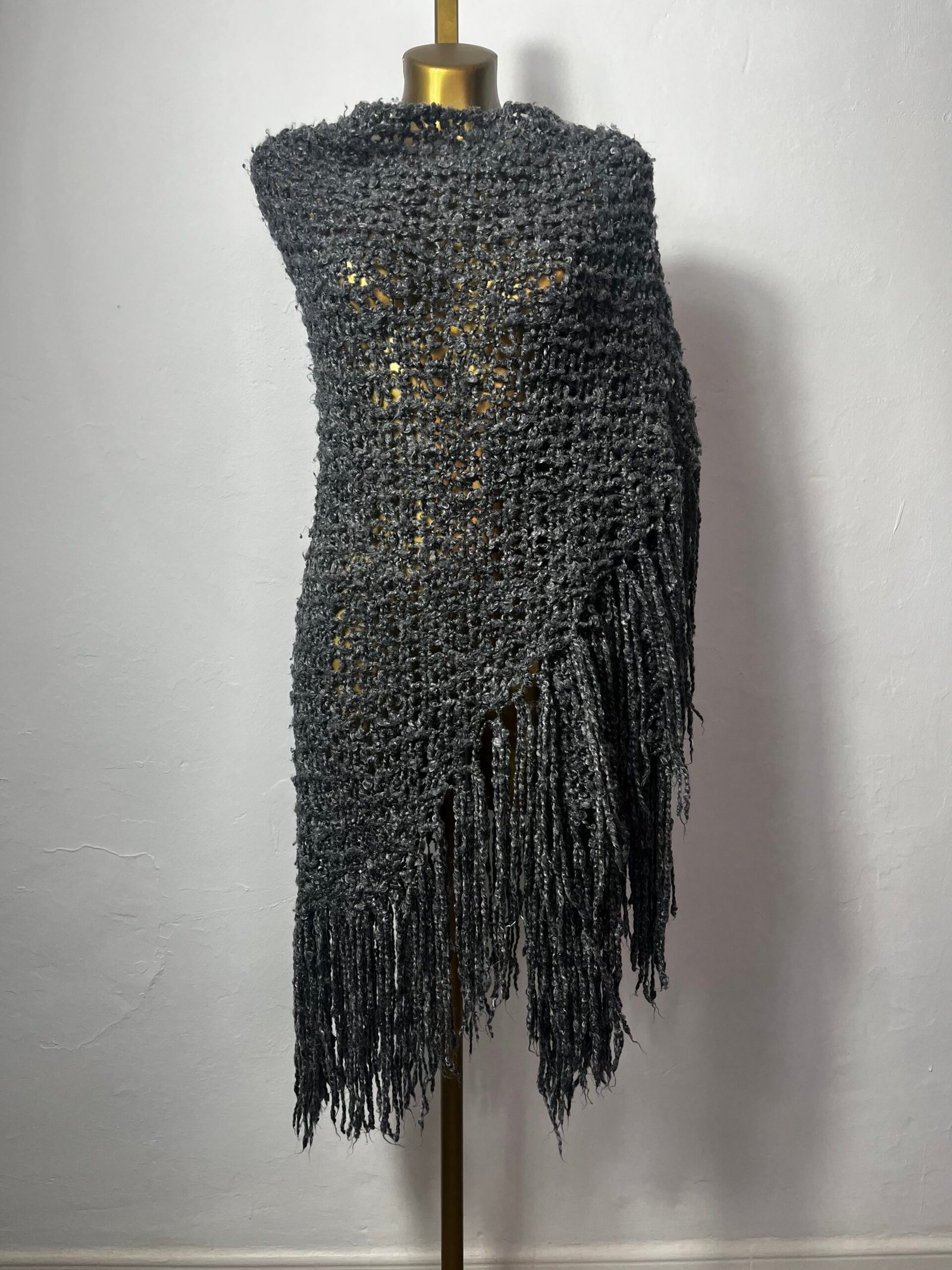 Mantón hecho a mano, de lana gris, con flecos. Es bastante grande.