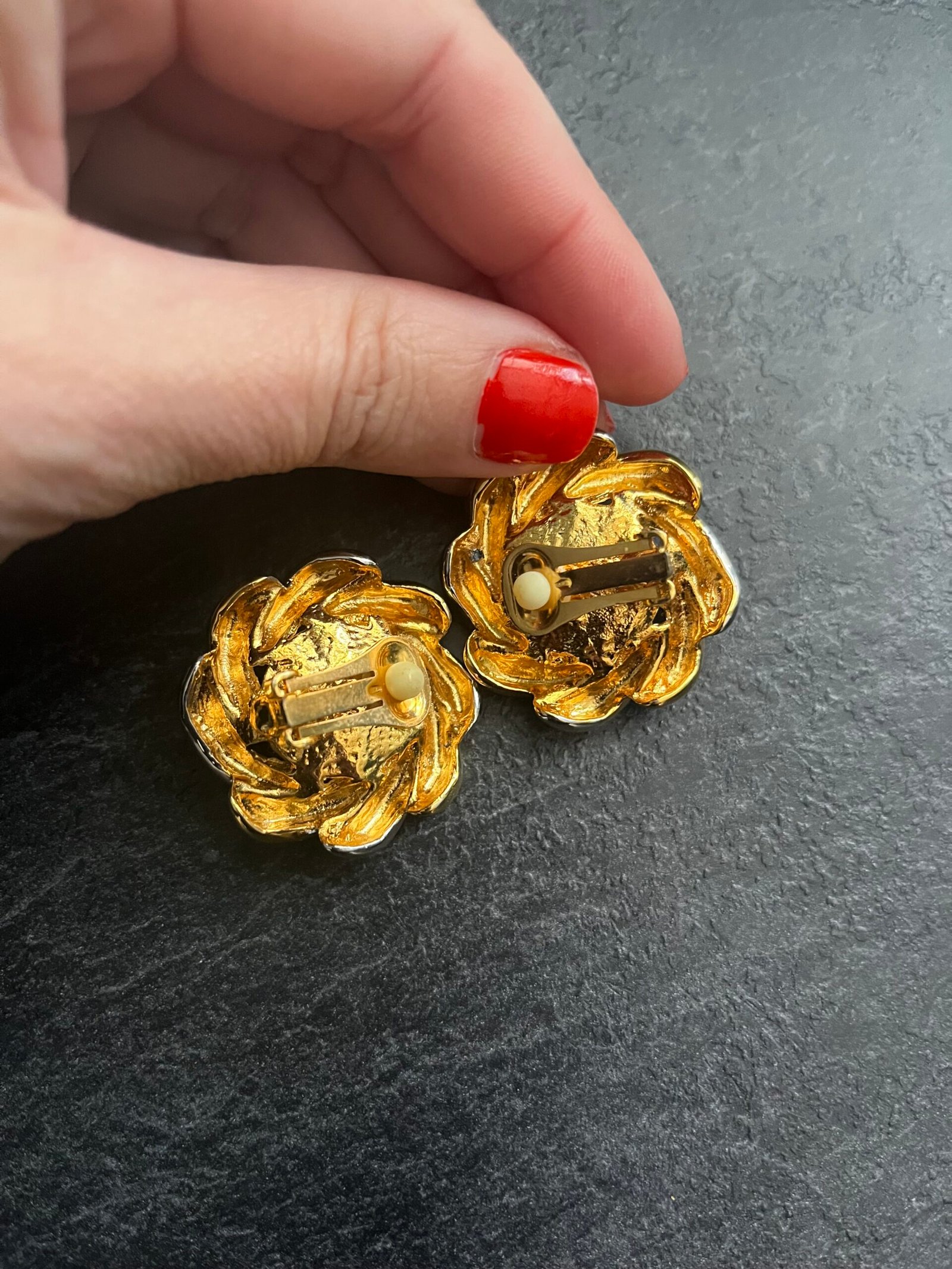 Pendientes vintage de clip, originales años 90´s, en plata y dorado con perla central.