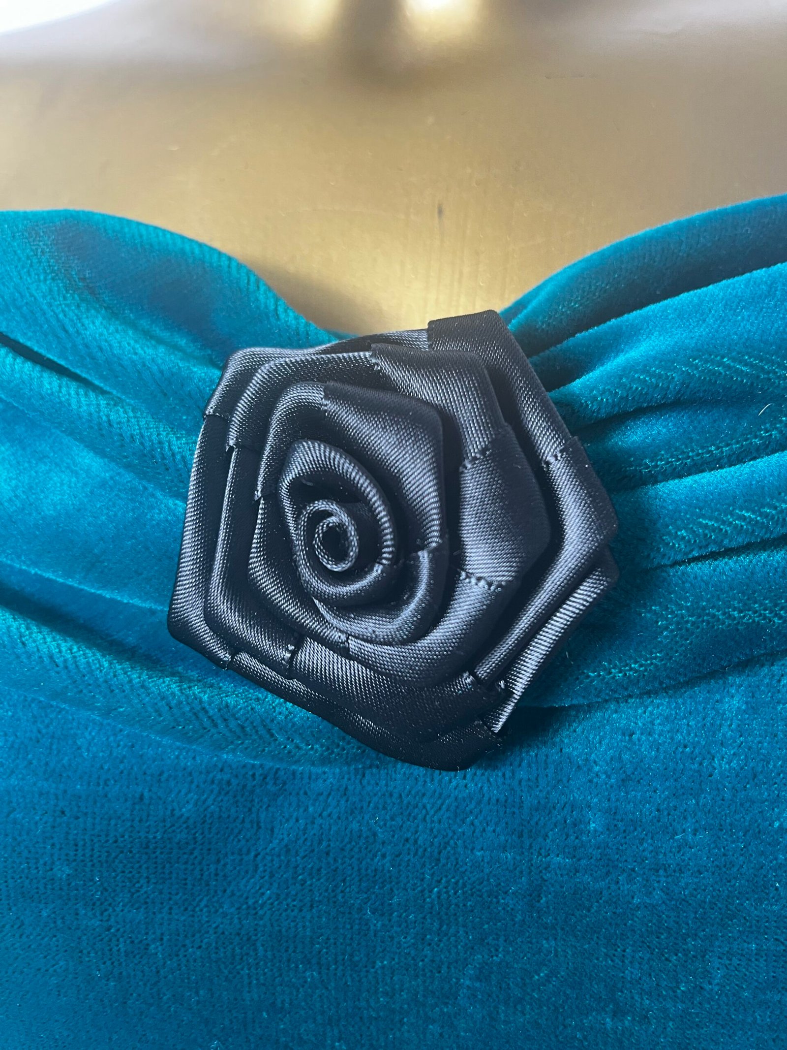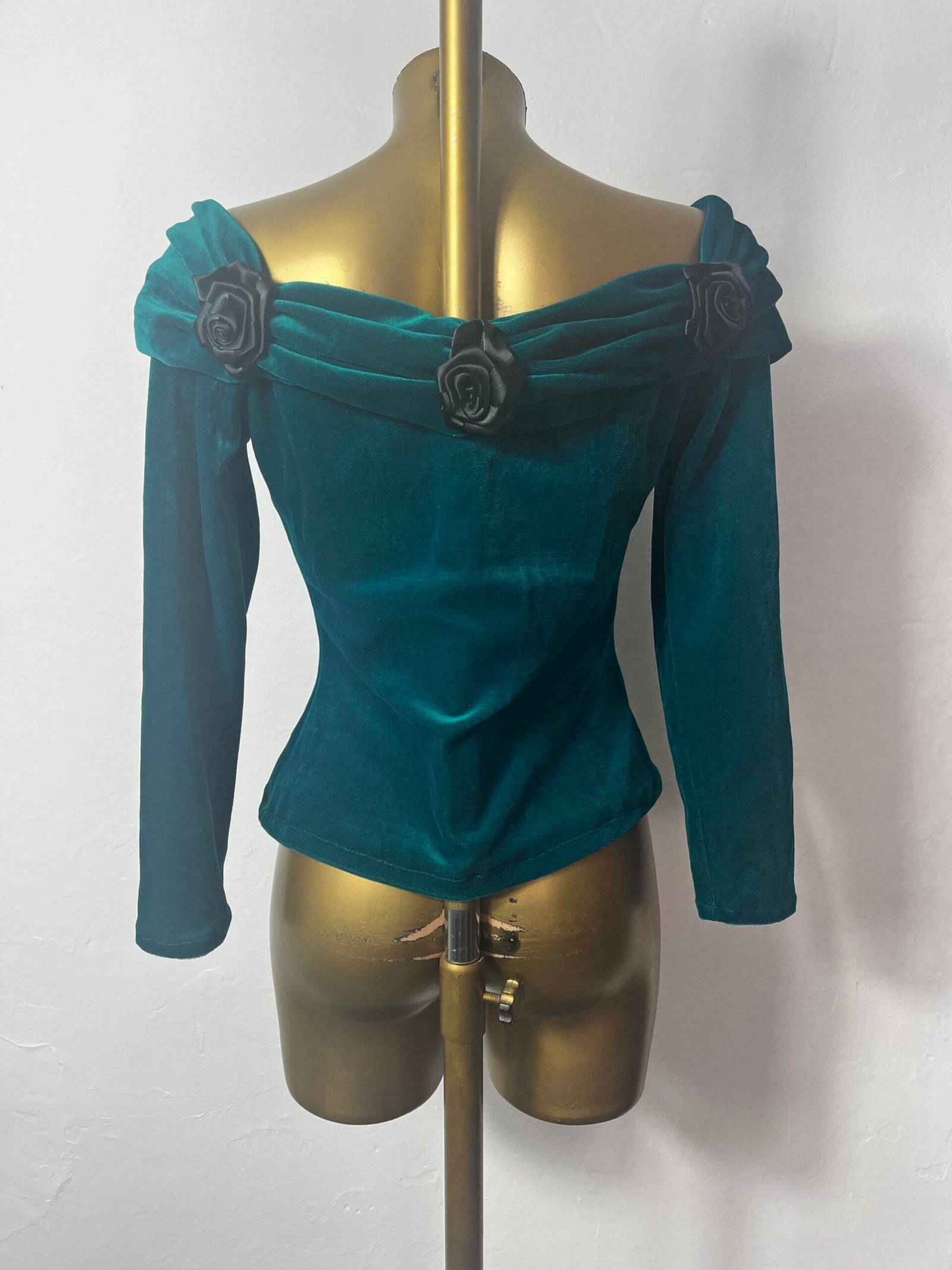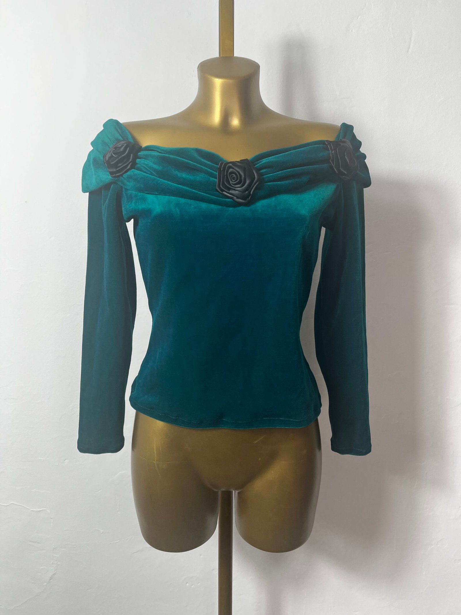 Top rework a partir de un vestido, años 90´s, de terciopelo con escote «Bardot» y flores de raso negro,