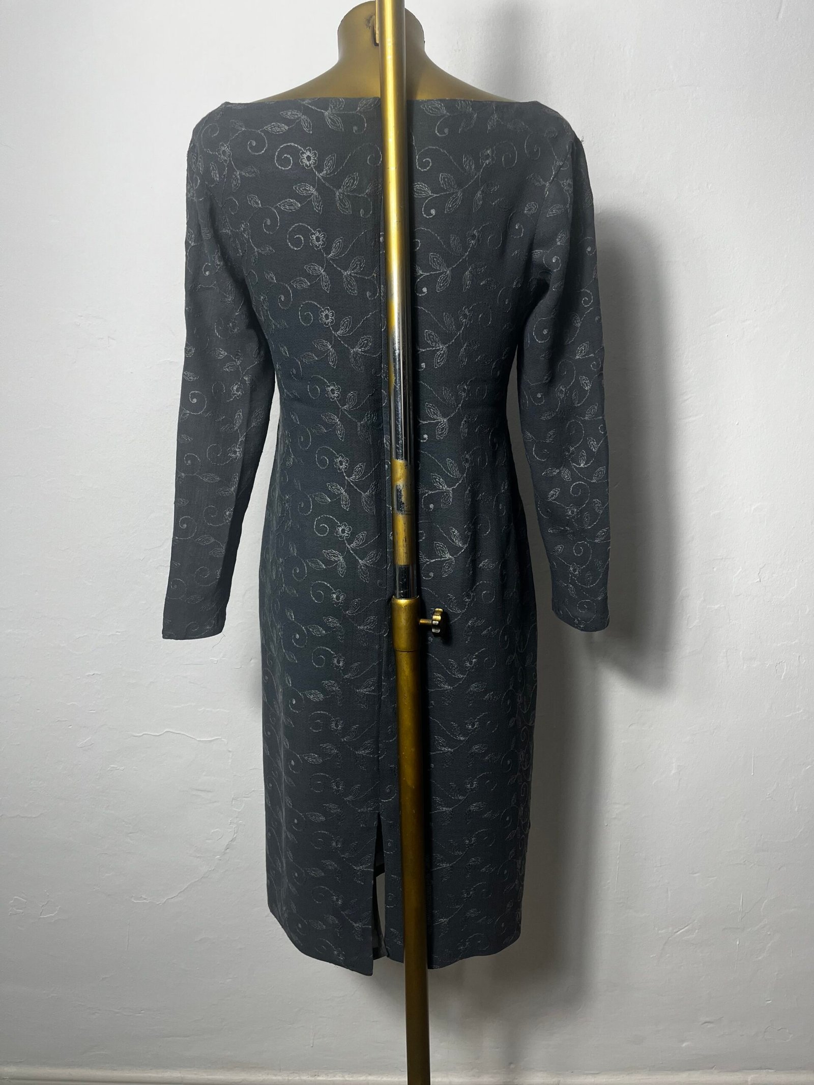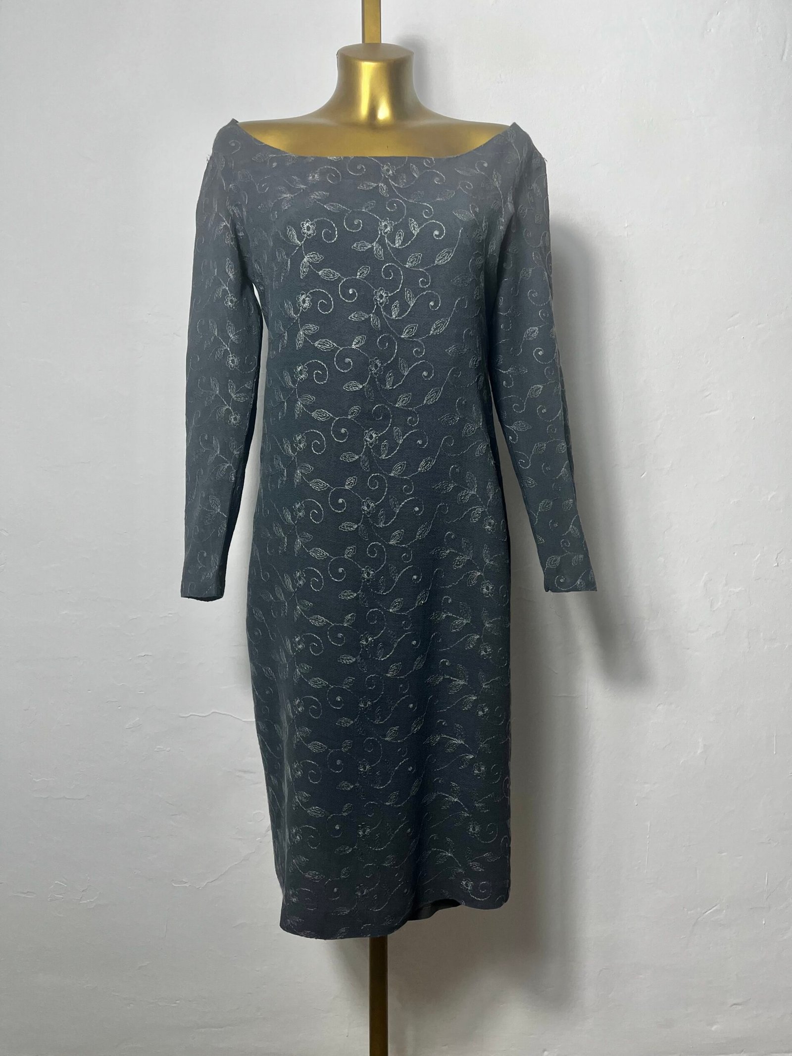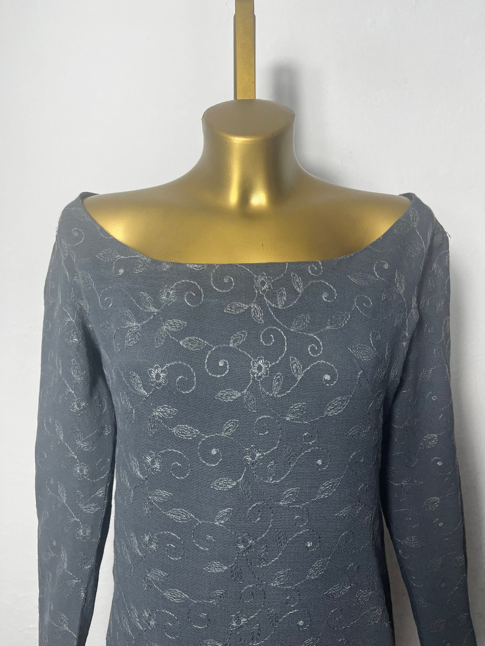 Vestido de manga larga, años 90´s, en gris con tejido con bordados. Lleva forro en todo el cuerpo (no en las mangas)