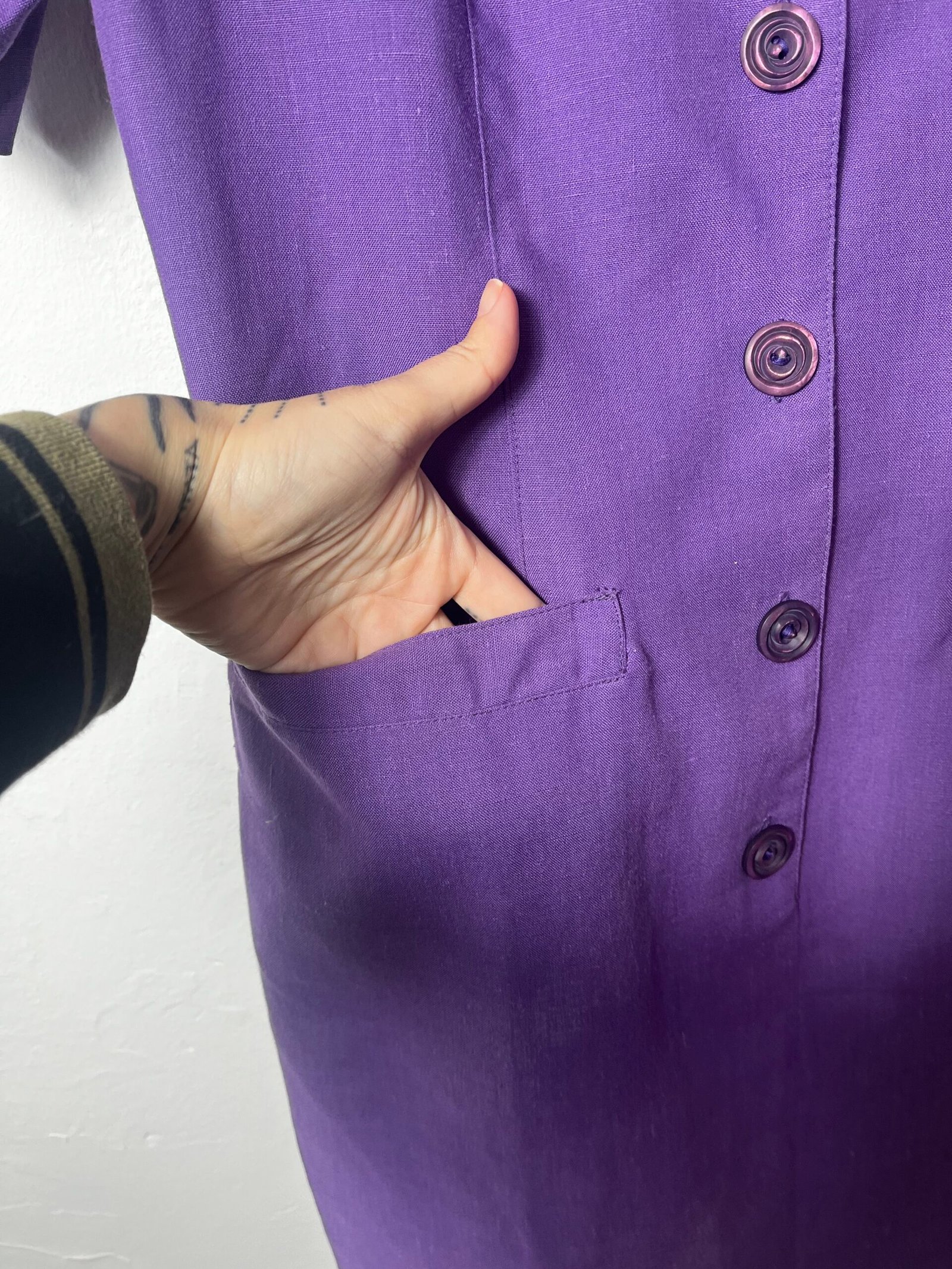 Vestido vintage de verano, años 80´s, de lino morado y bordados y cuentas de madera.