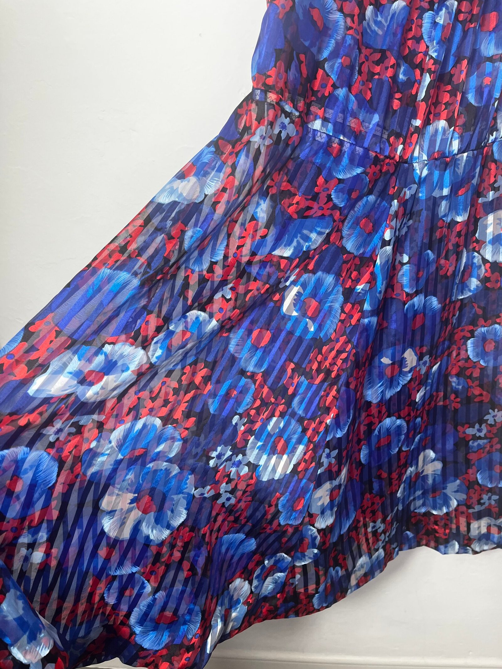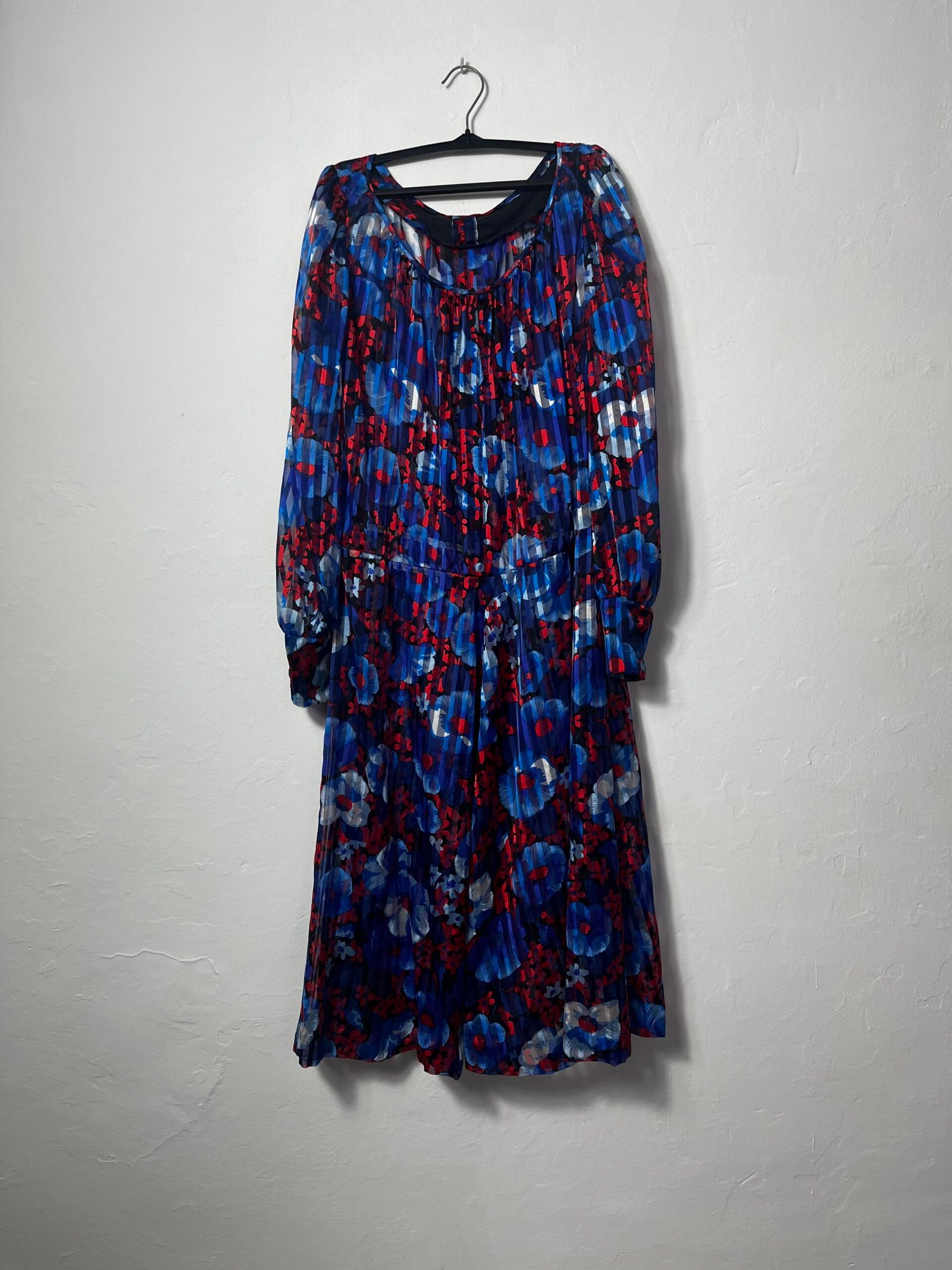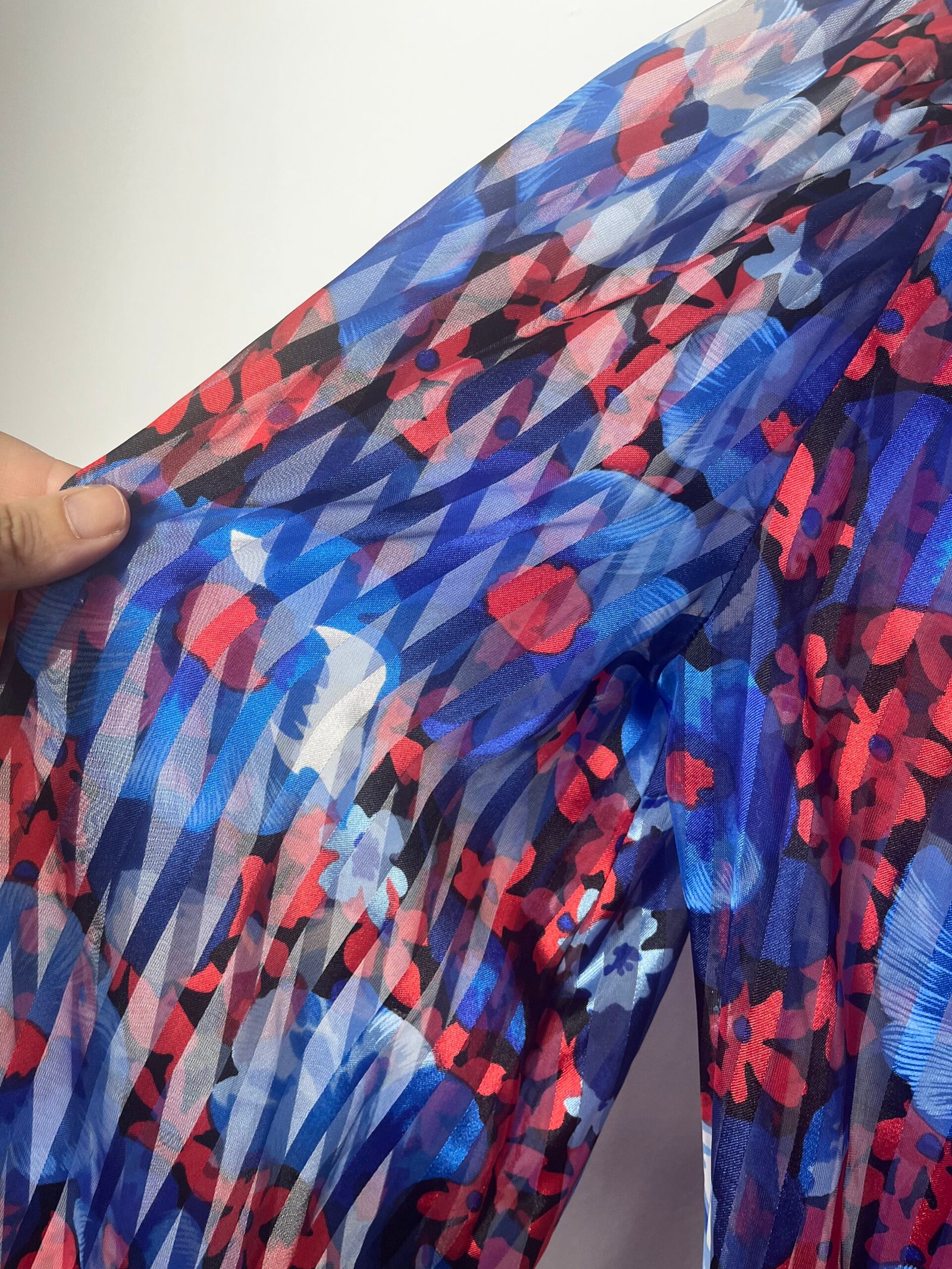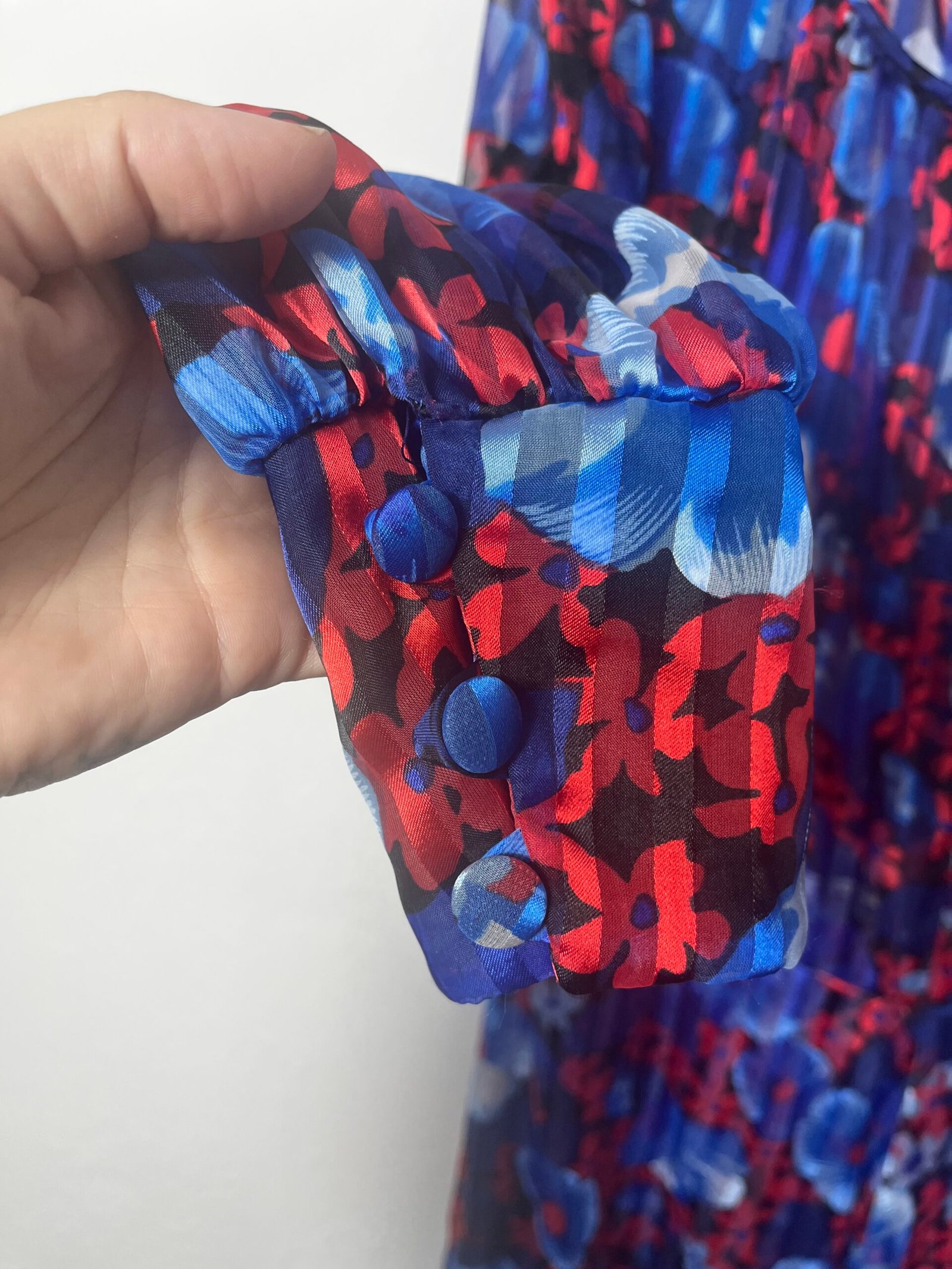 Precioso vestido hecho a mano en los años 70´s, con tejido semitrasparente, en rojo y azules, con precioso puño abotonados con botones forrados.