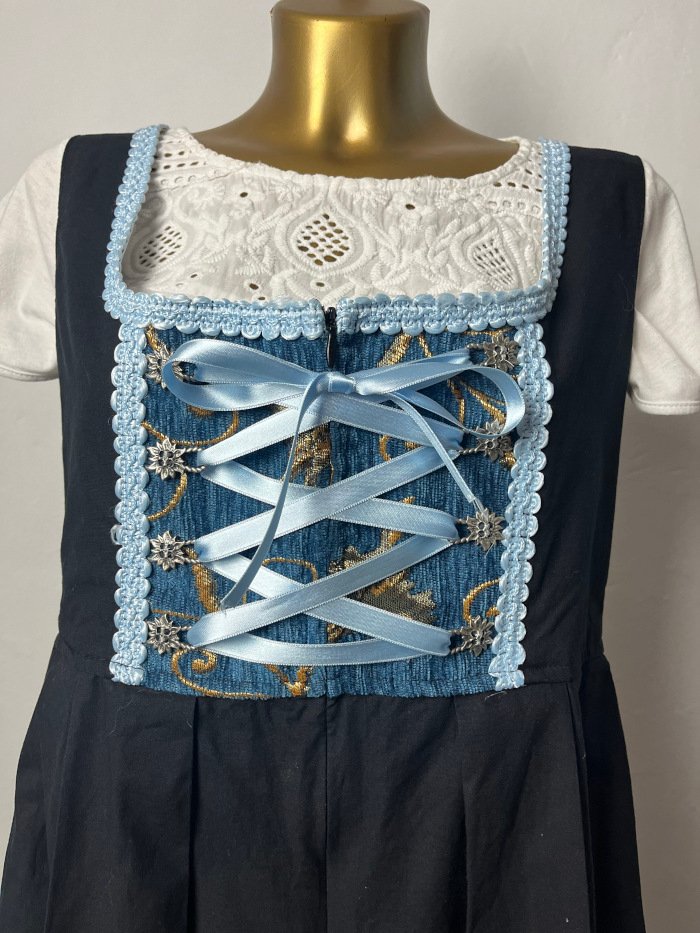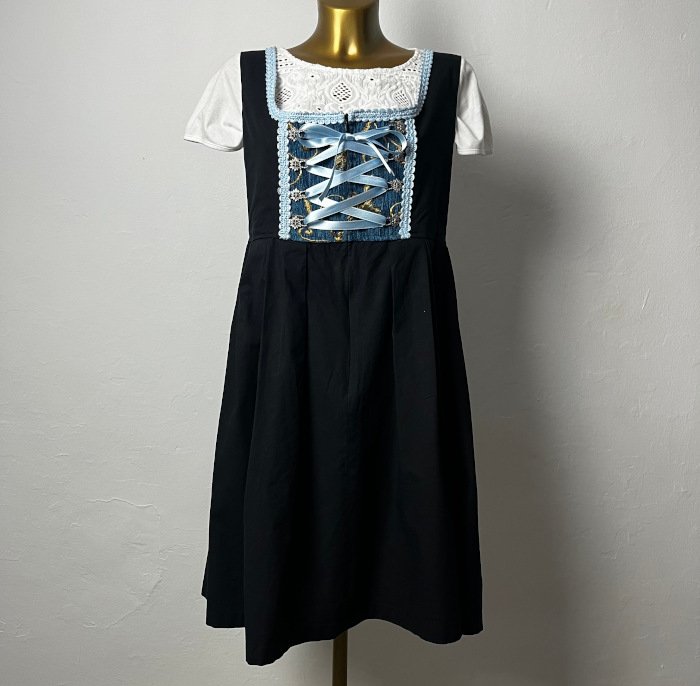 Vestido del Tirol, con pechera en tejido tapicería y corsé con herrajes tipo austriacos (la cinta se la he puesto nueva).